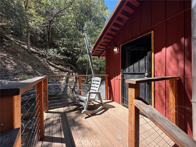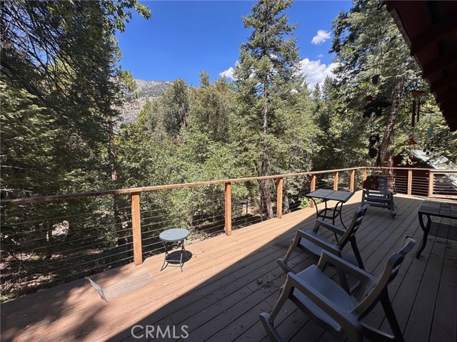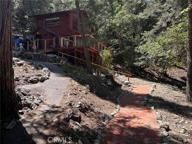 Hidden in the Forest sits this enchanting Lodge just waiting for you to call it home!Upon arrival you notice spectacular one of a kind deck perfect for birdwatching or just enjoying nature. Enter into home and be wowed by this wall of windows. Views of the mountain are just incredible. Kitchen opens into large living room with efficient woodturning stove for warmth and comfort! Bathroom and laundry on main level. Upstairs is huge master with same wonderful views only one level up. You won't ever want to leave this home and hard to believe you are in Southern California whilst surrounded by wilderness. Beautiful rock fireplace in master is oh so romantic and efficient w/ woodturning stove insert. Back deck has access to fenced rear yard to keep your fur babies safe. Detached garage is a mechanics dream, with 16 canned lights, upgraded electric and new panel. Upstairs perfect for a shop or maybe even an ADU.