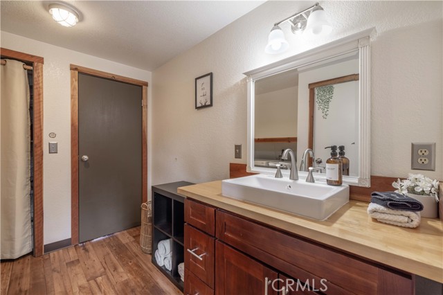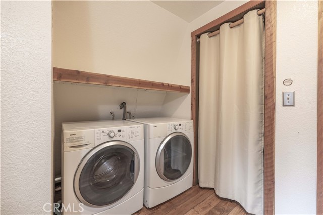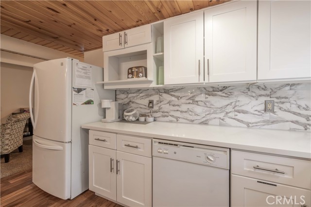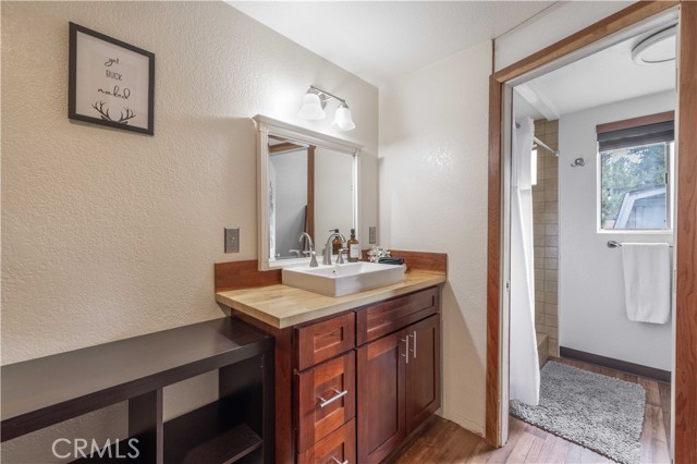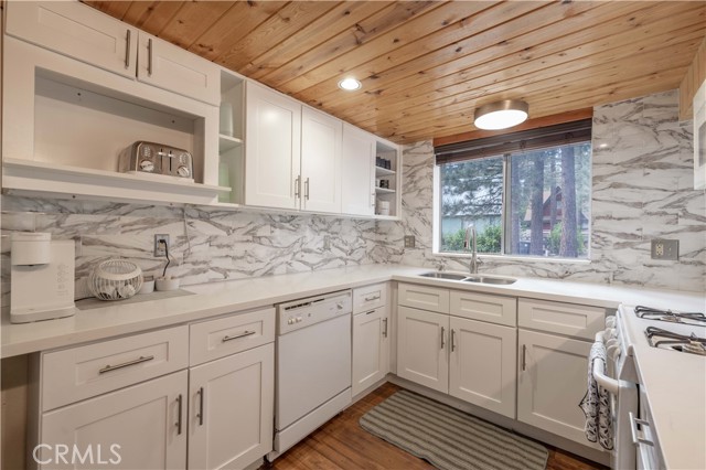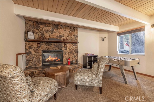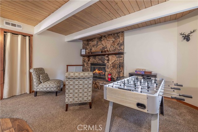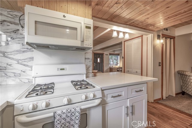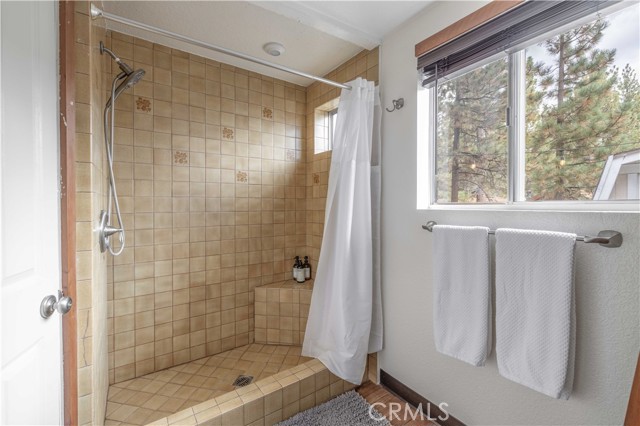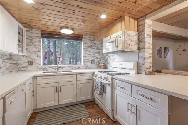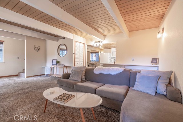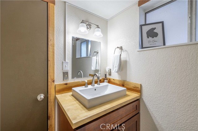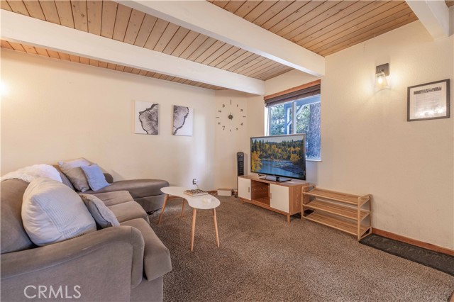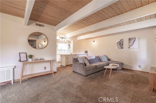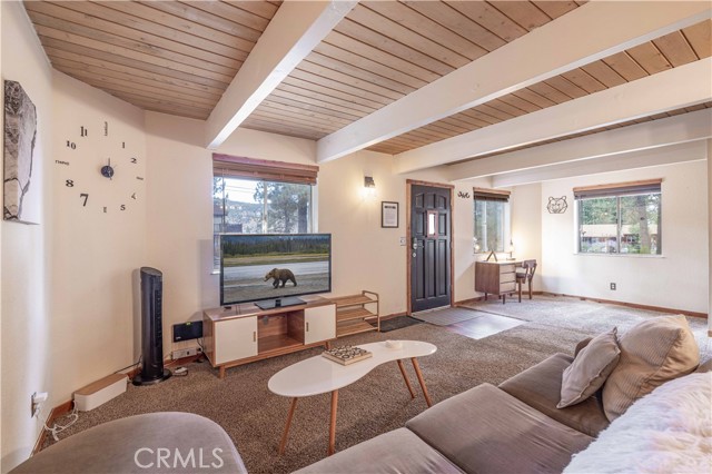 Tucked at the end of a quiet street in Big Bear City, this light and bright retreat offers stunning views and is surrounded by pines. The open living area features a native stone fireplace, wood accents, and a fully recently renovated kitchen with quartz counters, newer appliances, and open breakfast bar, ideal for entertaining. Upstairs, two spacious bedrooms boast vaulted ceilings, abundant light, and views from a private deck. A bonus detached room adds flexibility as an office, studio, or third bedroom. The spacious patio is ideal for dining or lounging while taking in the mountain air. Enjoy extra storage in the detached garage and ample room for parking or storing toys in the gated driveway. Turnkey, close to hiking, skiing, the village, dining, and shopping, ideal as a full-time home, vacation getaway, or income rental.