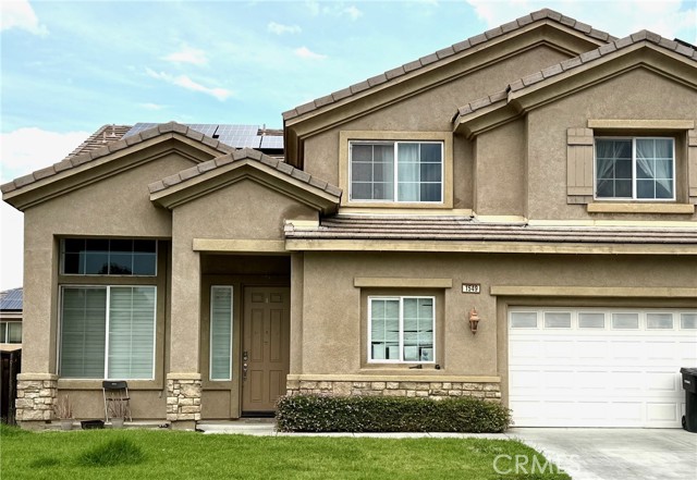 Welcome to this beautiful two-story home offering 2,903 sq. ft. of spacious living. Featuring 4 bedrooms, 3 bathrooms, and a huge upstairs bonus room. This home is designed for both comfort and style. The inviting living room showcases high ceilings, giving it lots of natural light, plantation shutters and a stunning staircase with wrought iron details, leading to the upstairs bedrooms. Upgraded laminate flooring and baseboards flow throughout the home, adding a modern touch. The heart of the home is the expansive kitchen, complete with an abundance of cabinets, a large granite island, a stunning full backsplash, stainless steel appliances, and an open layout that seamlessly connects to the oversized family room—perfect for entertaining. A convenient downstairs laundry room adds to the functionality. Upstairs, you’ll find the primary bedroom, plus three other bedrooms, and a massive bonus room that can serve as a game room, office, or media center. Cabinets for extra storage right off the hallway. Outside offers a huge backyard with endless possibilities - for gatherings, play, or even a future pool. This home also comes equipped with 32 energy-saving solar panels, at a low monthly payment of $202, and it also offers a full water filtration system. Property is situated close to Ramona Express Way, Shopping, Schools, Soboba Casino and Diamond Valley Lake.