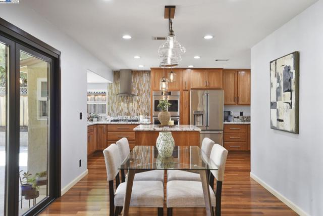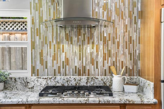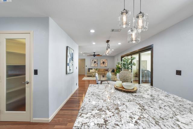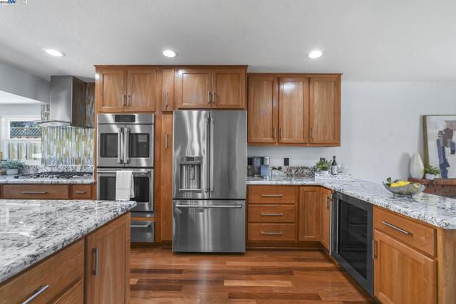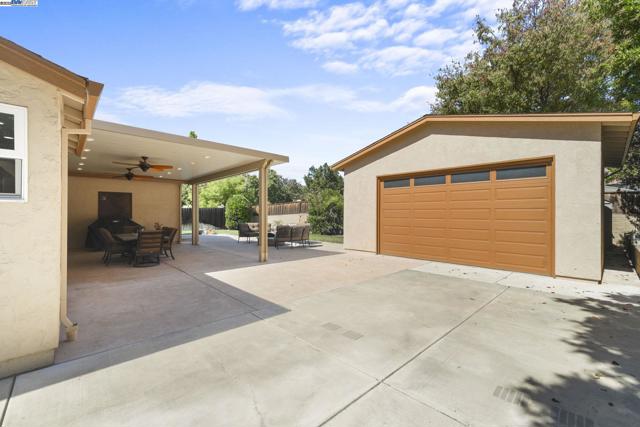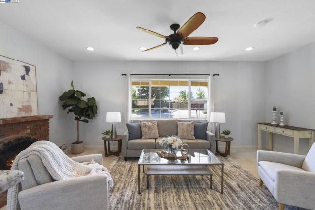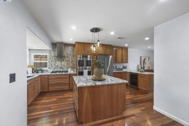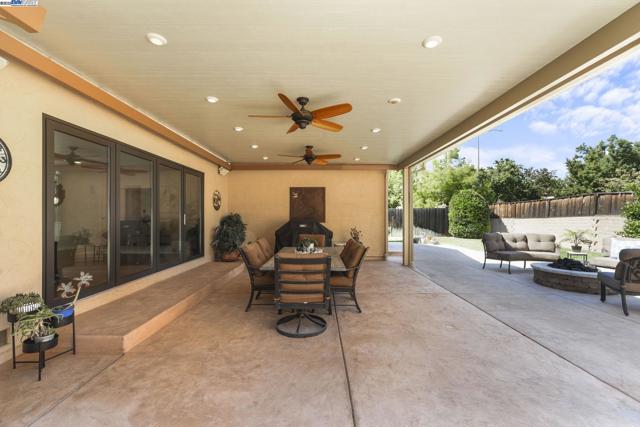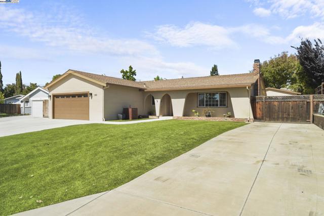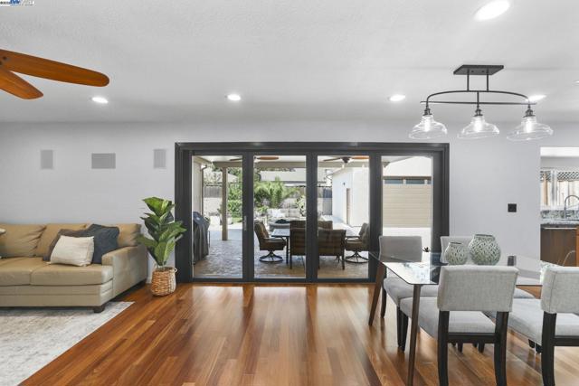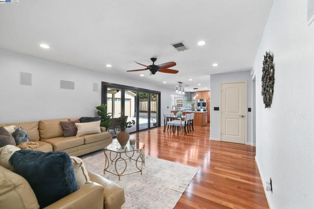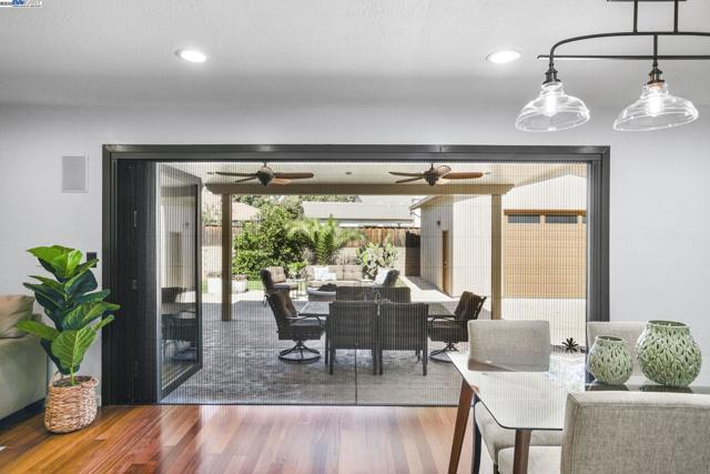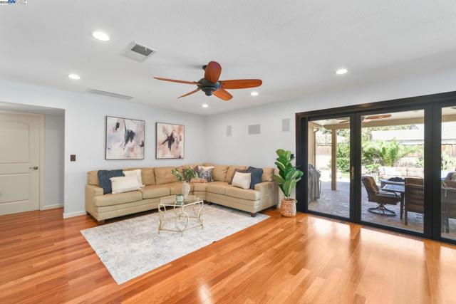 This beautifully updated home blends luxury, comfort, and functionality inside and out. The chef’s kitchen features custom cabinetry paired with granite counters, an island, stylish glass tile backsplash, modern lighting, and GE Café stainless steel appliances—including dual oven with French doors, 5-burner gas cooktop, wine fridge, and more. Brazilian teak hardwood floors flow through the main living areas, where the family room offers built-in surround sound and a stunning folding glass wall with retractable screen that opens to the backyard. The spacious primary suite boasts new carpet, a gas fireplace, walk-in closet, backyard access, and a private bath with heated tile floors and a large shower. Outdoor living includes a covered patio with stamped concrete, ceiling fans, speakers and gas fire pit. The property has a 9,977 sq.ft. lot, a 2 car attached garage plus a large insulated DETACHED SHOP, and 2 long concrete driveways can accommodate multiple recreational or other vehicles. with 30-amp plug, wide driveway, turf front yard, whole-house fan, tankless water heater, security system, and more. Enjoy all that Livermore offers—award-winning wineries, craft breweries, and vibrant downtown dining and shopping and easy access to the Bay Area and Silicon Valley via I-580 and BART