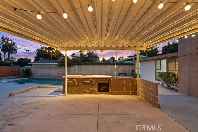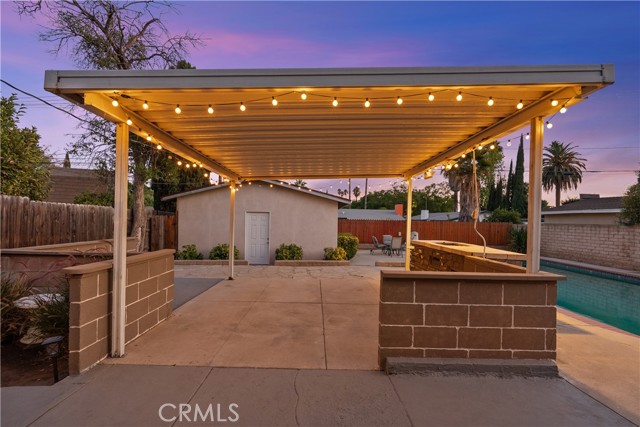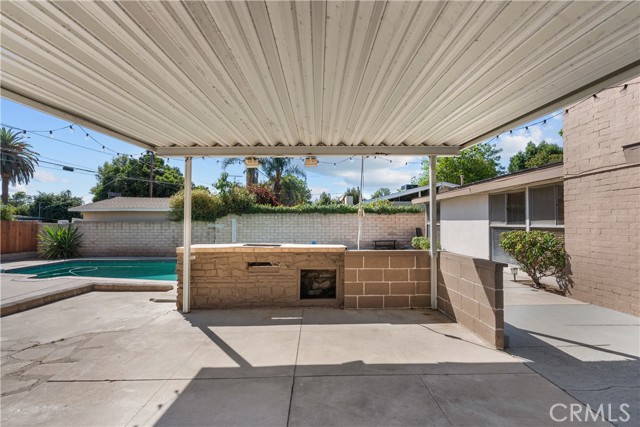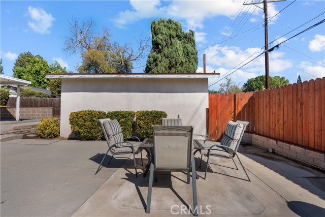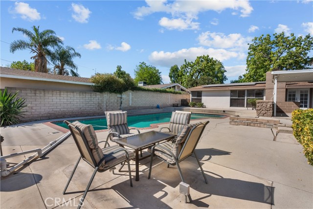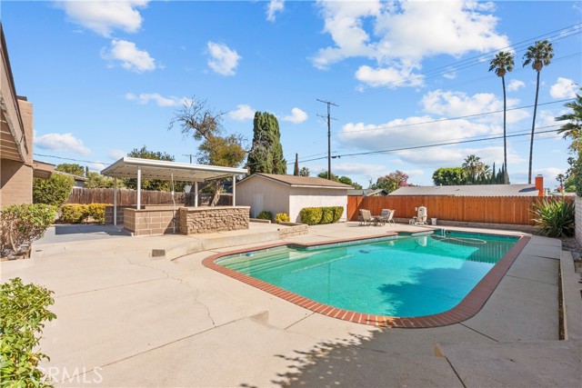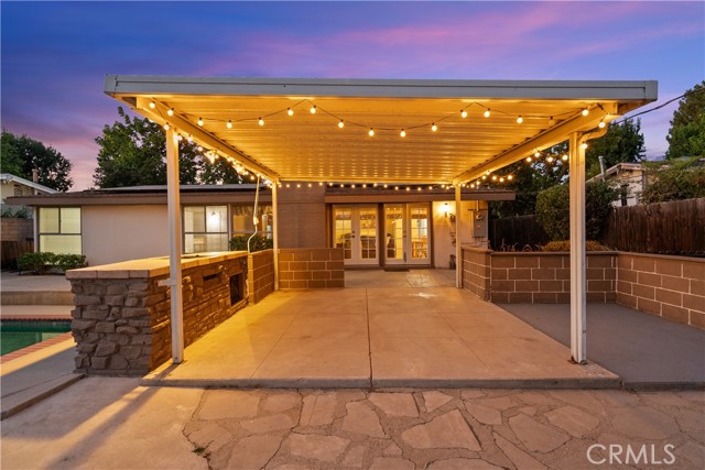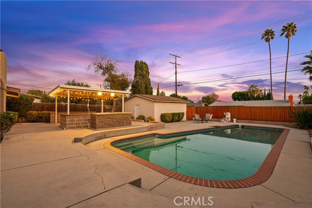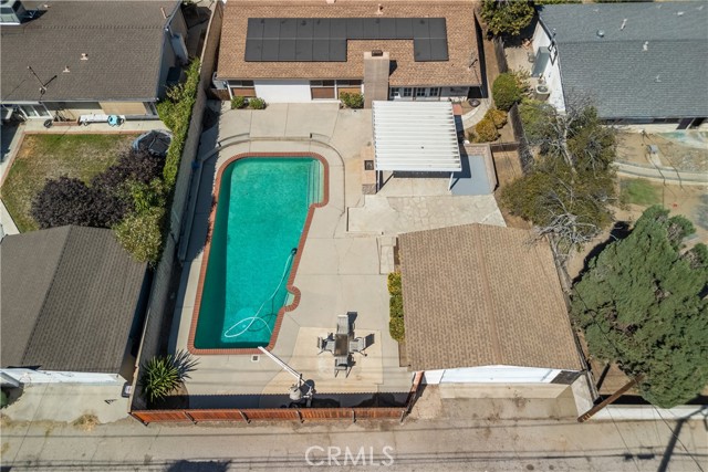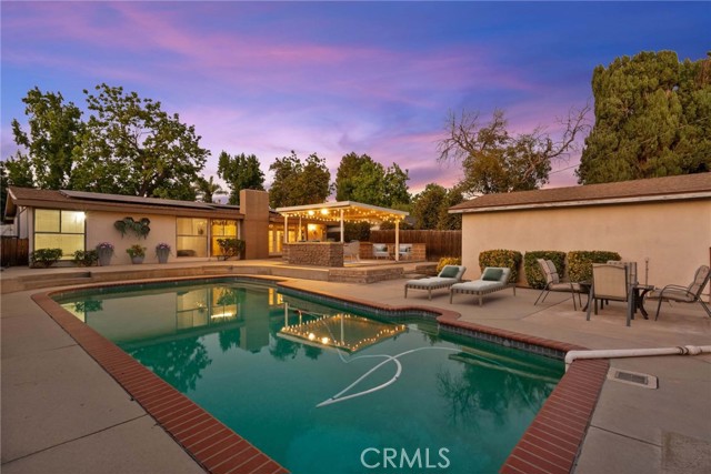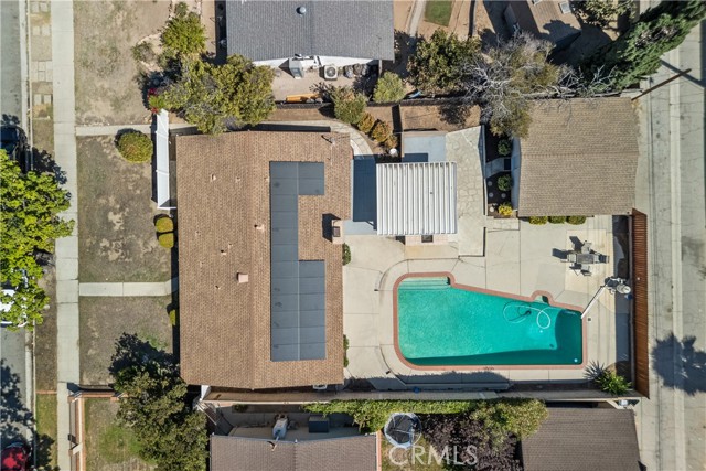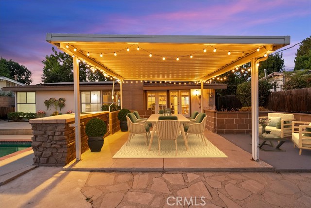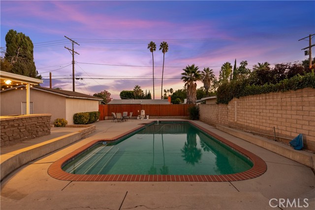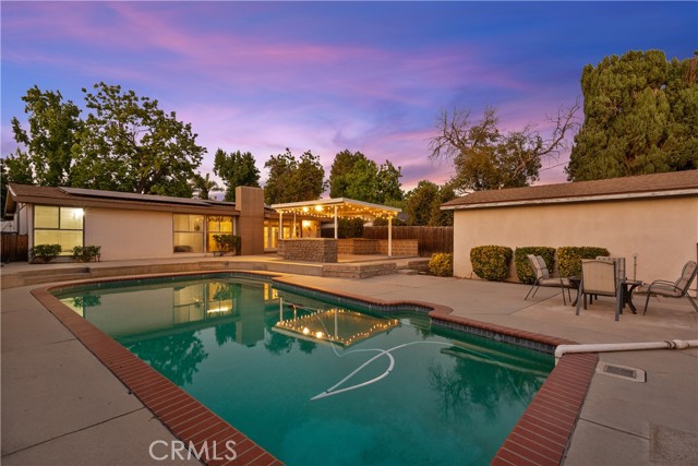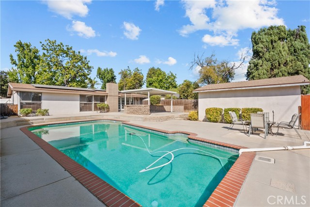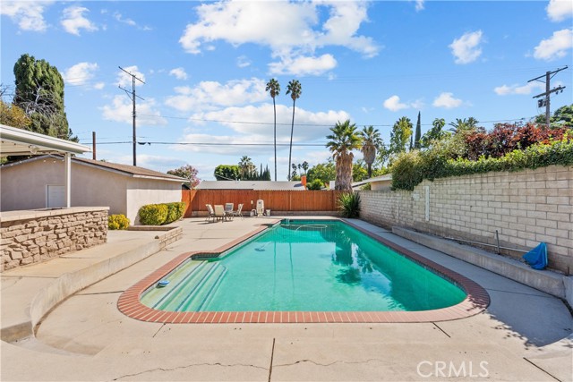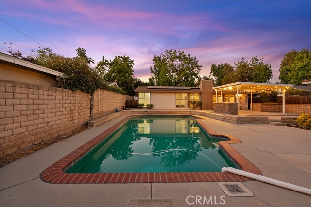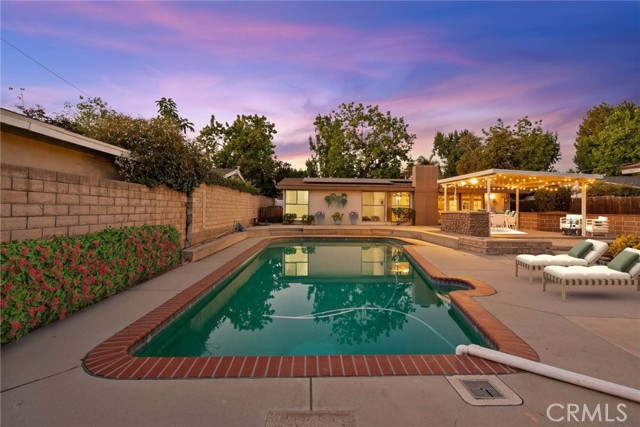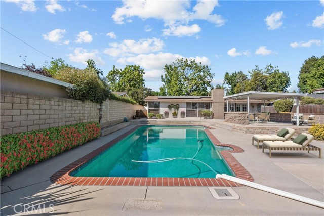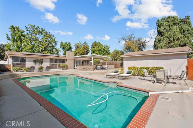 Welcome to this charming Palmer and Krisel mid-century modern, located in the highly sought-after North Hills West neighborhood. Blending timeless architectural appeal with modern updates, this four-bedroom, two-bathroom residence offers 1,344 square feet of bright, open living space—perfect for both everyday comfort and effortless entertaining. Upon entry, you're greeted by a light-filled foyer that opens into expansive common living and dining areas. Signature vaulted wood-beam ceilings, abundant natural light, a cozy wood-burning fireplace, and French doors create a warm and inviting atmosphere. Oversized sunlit windows offer views of the private backyard and sparkling swimming pool, beautifully merging indoor and outdoor living. The spacious primary bedroom features vaulted ceilings, ample closet space, and an en-suite bathroom with a tiled shower-over-tub combination. Three additional bright and generously sized bedrooms—each with vaulted ceilings and ample closet space—share access to a full bathroom and a separate three-quarter bath with a tiled stall shower and vanity. One of the bedrooms includes private access to the front courtyard, making it an ideal space for guests, an in-law suite, or a dedicated home office. At the heart of the home lies the well-appointed cook’s kitchen, featuring classic tile countertops, an electric oven and range, generous cabinetry, vaulted ceilings, and a convenient indoor laundry area. Just off the kitchen, the dining room provides an ideal space for everything from casual family breakfasts to formal gatherings. Step outside through French doors and into your private backyard retreat. A refreshing swimming pool, spacious patio, and large covered area create the perfect setting for morning coffee, weekend BBQs, or evening relaxation. The detached garage with alley access and a spacious backyard offer exciting potential for an ADU (Accessory Dwelling Unit).The home has been thoughtfully updated with a composition roof, updated central air and heat system (2022), mostly copper plumbing, select windows are dual-pane, a 200-amp modern electrical panel, and an owned energy-efficient solar power system, providing long-term utility savings and peace of mind. Located just minutes from CSUN, schools, shopping, dining, major freeways, and local entertainment, this home delivers the perfect balance of mid-century style, modern comfort, and everyday convenience. (Some photos may have been virtually staged.)