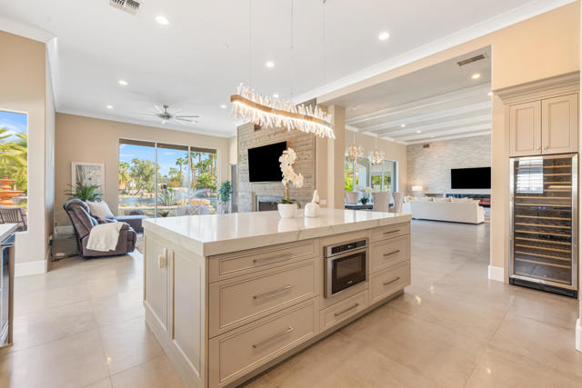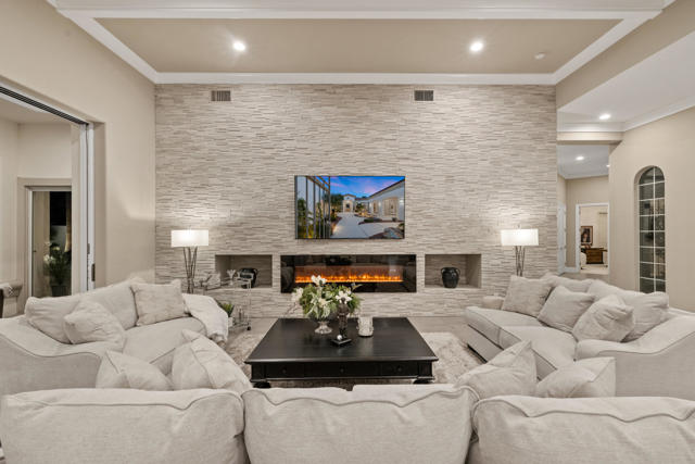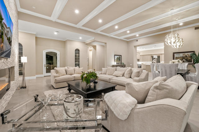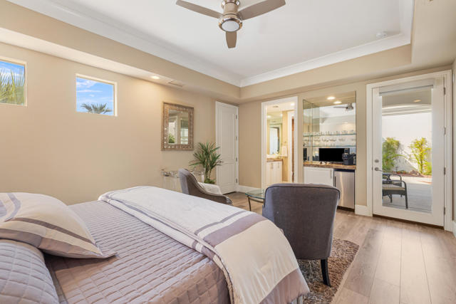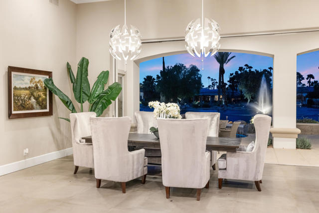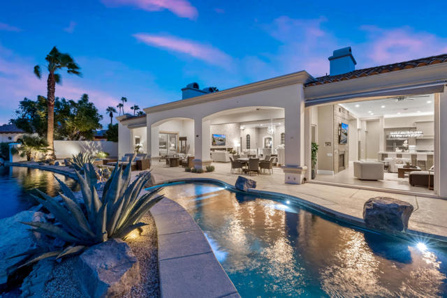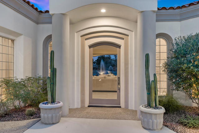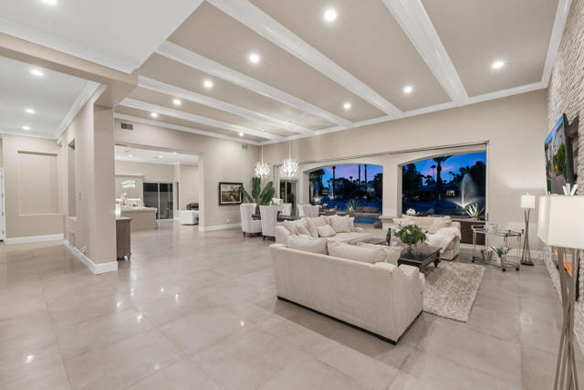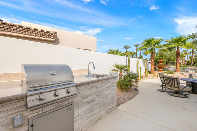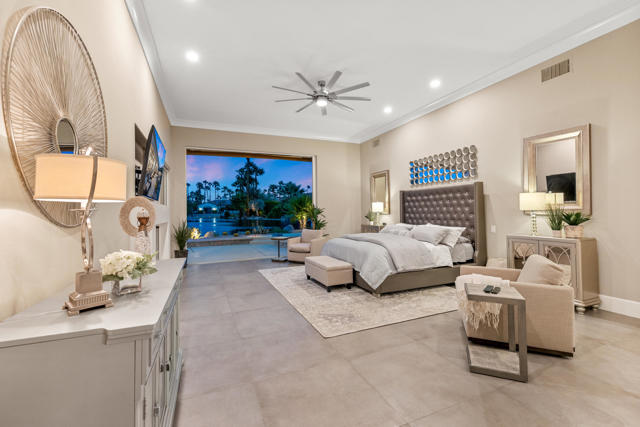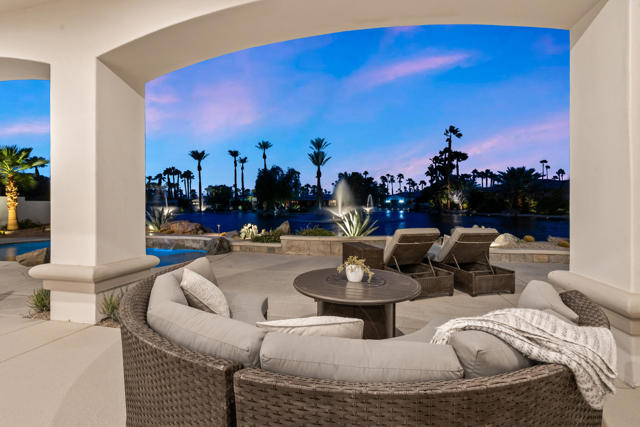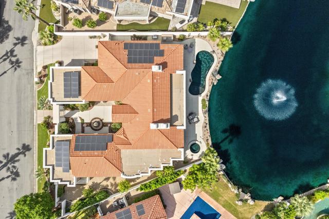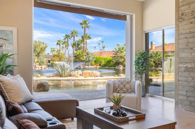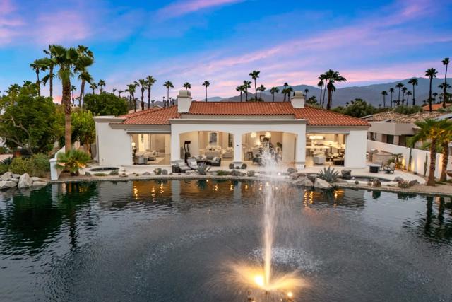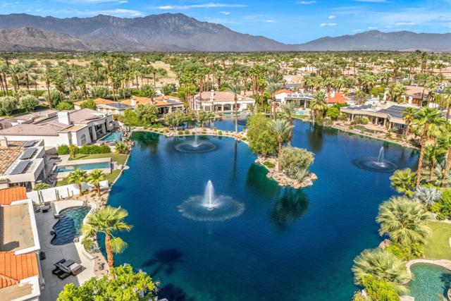 Enjoy the Palm Desert lifestyle in this fabulous solar powered custom 4 bedroom, 6 bath home including Casita. Just under 5000-SqFt of living space, this beautiful lakefront home built in 2000 and recently beautifully remodeled, offers jaw dropping lake and mountain views from many areas of the house, pool and spa. Sixteen-foot ceilings, massive, stacked stone fireplace wall and disappearing walls of glass, offer amazing indoor-outdoor desert lifestyle living, wonderful for entertaining on those gorgeous days and evenings. Bright interior with today's finishes, all new chefs' kitchen, appliances, wine storage and outdoor BBQ cooking just outside. Neutral modern 36'' tile floors make interior spaces beautiful, open and expansive. Open to the kitchen, a relaxed media area with fireplace and large pocket glass door. Incredibly spacious primary suite, with sitting area, fireplace and media, pocket glass doors that open to rear yard Pool area and just steps away from your lake and mountain view heated Spa. Gorgeous and luxurious primary bath, with soaking tub, large shower with Calacatta Marble and matching stone tile, dual water closets and walk-in closets. Home office utilizes guest-suite 1, opposite side of the house guest-suite 2 and situated off the courtyard entry with fountain and sitting area, Casita-Guest-suite 3, a wonderful privacy floorplan. You won't want to miss this opportunity!