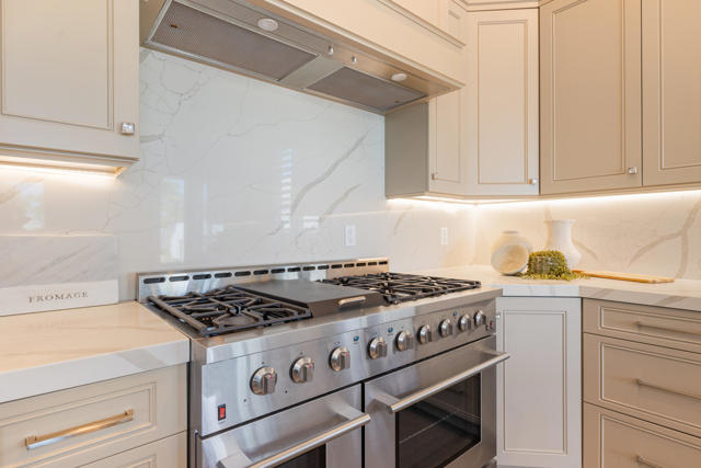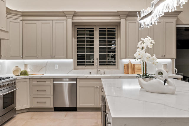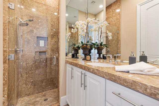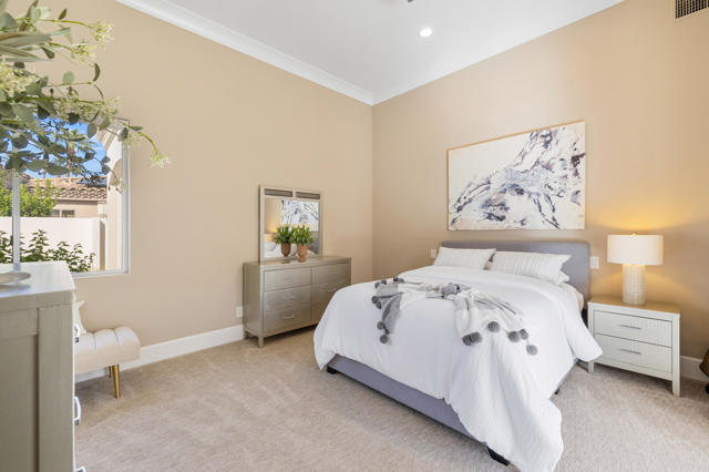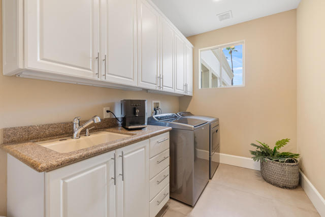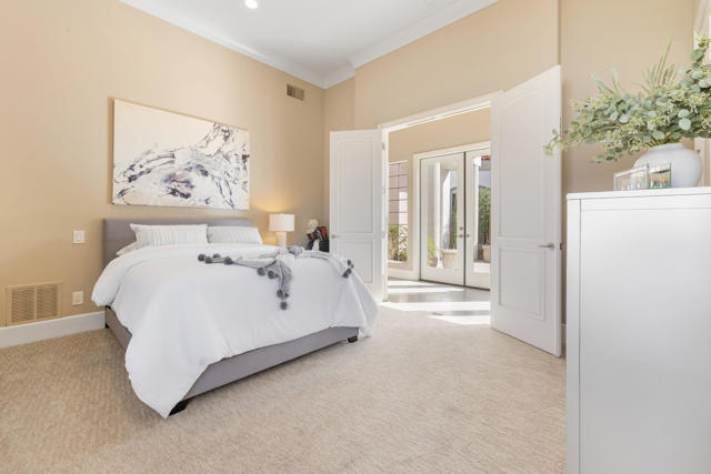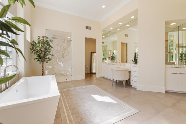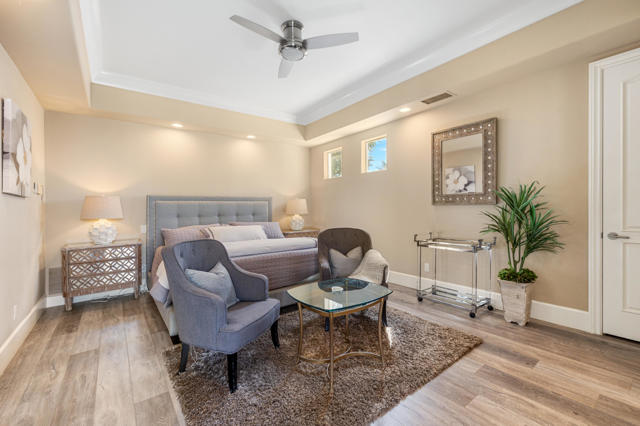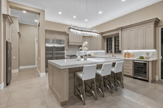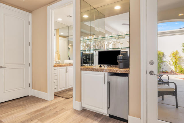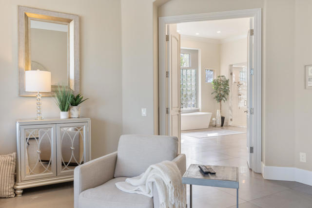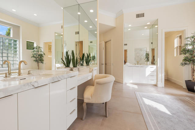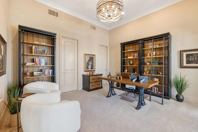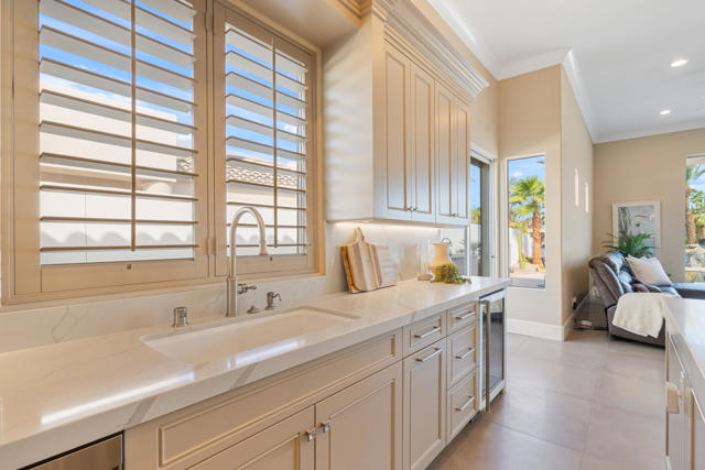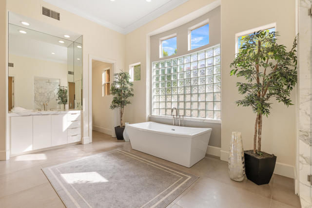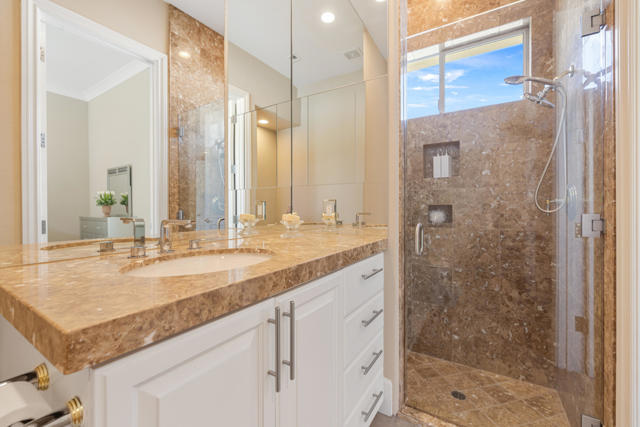 Enjoy the Palm Desert lifestyle in this fabulous solar powered custom 4 bedroom, 6 bath home including Casita. Just under 5000-SqFt of living space, this beautiful lakefront home built in 2000 and recently beautifully remodeled, offers jaw dropping lake and mountain views from many areas of the house, pool and spa. Sixteen-foot ceilings, massive, stacked stone fireplace wall and disappearing walls of glass, offer amazing indoor-outdoor desert lifestyle living, wonderful for entertaining on those gorgeous days and evenings. Bright interior with today's finishes, all new chefs' kitchen, appliances, wine storage and outdoor BBQ cooking just outside. Neutral modern 36'' tile floors make interior spaces beautiful, open and expansive. Open to the kitchen, a relaxed media area with fireplace and large pocket glass door. Incredibly spacious primary suite, with sitting area, fireplace and media, pocket glass doors that open to rear yard Pool area and just steps away from your lake and mountain view heated Spa. Gorgeous and luxurious primary bath, with soaking tub, large shower with Calacatta Marble and matching stone tile, dual water closets and walk-in closets. Home office utilizes guest-suite 1, opposite side of the house guest-suite 2 and situated off the courtyard entry with fountain and sitting area, Casita-Guest-suite 3, a wonderful privacy floorplan. You won't want to miss this opportunity!