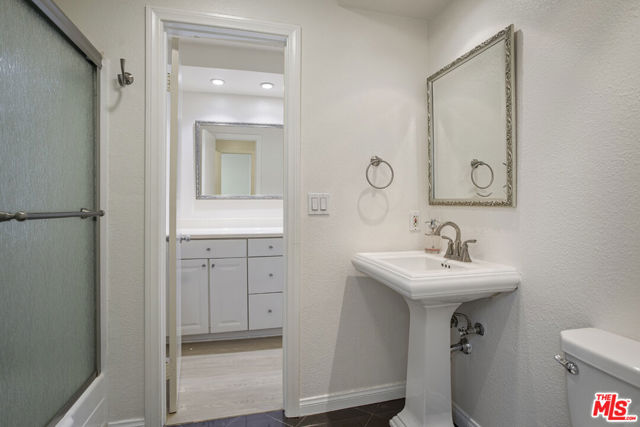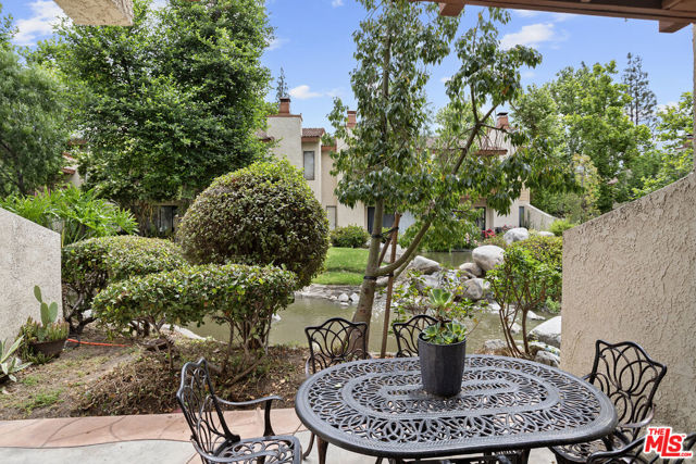Move-in-ready townhome in the highly desirable Warner Center of Woodland Hills, where nature, comfort, and convenience meet. The updated kitchen with stainless steel appliances opens directly to the living room, which features a cozy fireplace and sliding doors to a private patio, the perfect spot to enjoy peaceful moments with the gentle sound of flowing water and nature. A guest bathroom is located downstairs for everyday convenience. Upstairs you'll find two bedrooms and a full bathroom with a shower, the primary suite offer its own separate vanity with sink. Vaulted ceilings give the home an open, airy feel, and a private balcony off the primary suite adds fresh light and breezes. Additional features include in-unit stackable laundry, central heat and air, and beautiful flooring throughout. Parking is a breeze with one space in the shared garage, an assigned spot located right in front of the unit, and plenty of guest parking nearby. This community offers true resort-style living with ponds, a pool, jacuzzi, sauna, and two tennis courts.