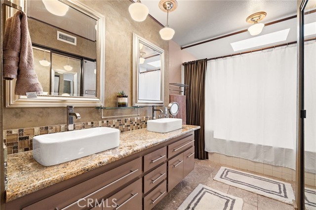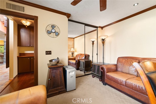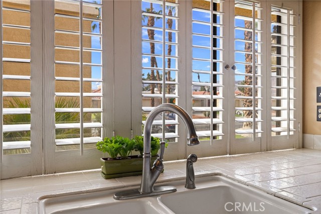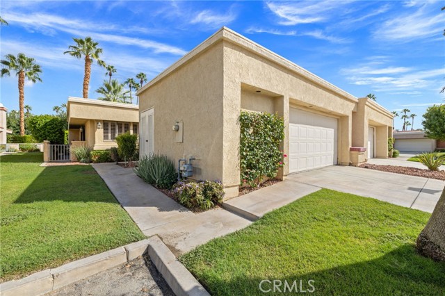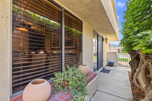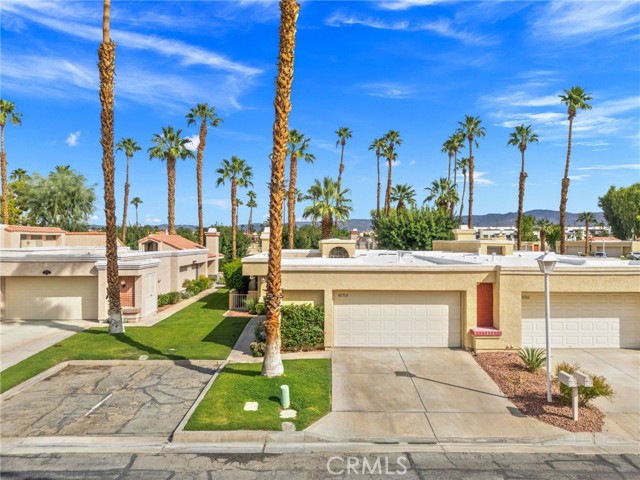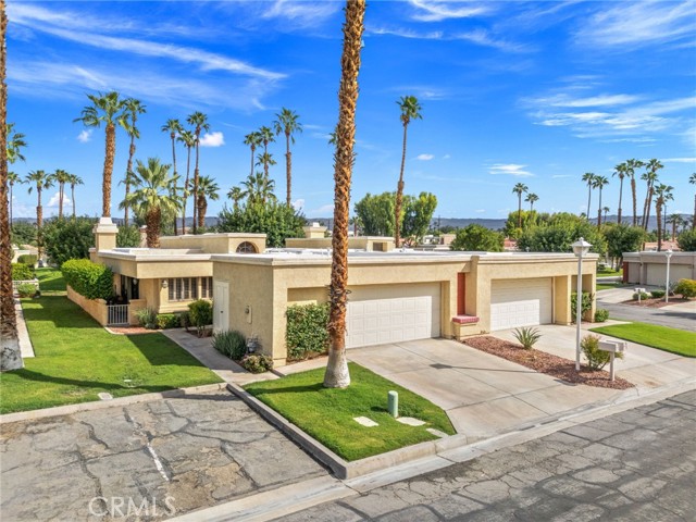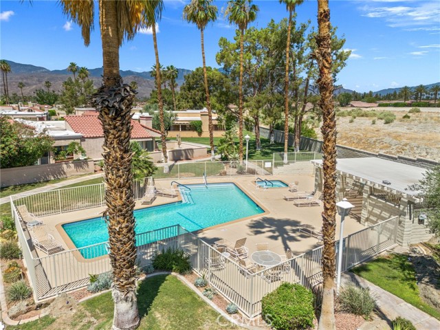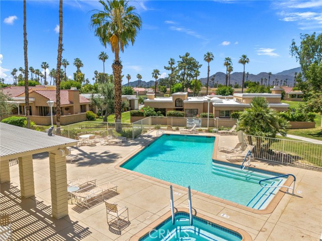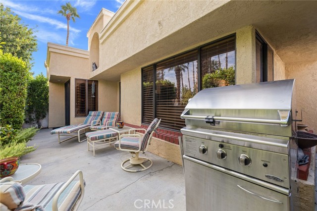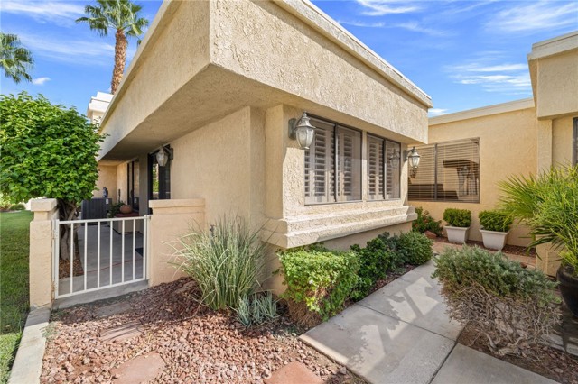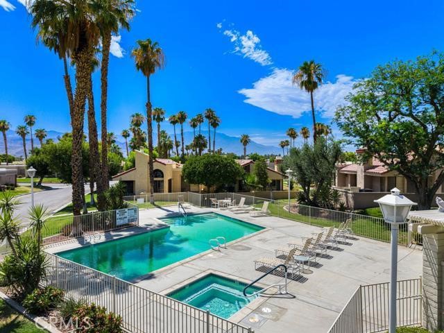 Enjoy the desert lifestyle in this beautifully appointed two-bedroom, two-bath condo tucked away in a private and quiet community called Casablanca. Residents can take advantage of pickleball, tennis, four community pools/spas with two heated year round, and a vibrant social scene. Step inside to discover a thoughtfully decorated home filled with unique touches, including crown molding, under-cabinet lighting, a custom-installed audio system in the living room, hand-troweled Venetian plaster, and Ralph Lauren suede paint that adds depth and warmth to the décor. The open living and dining area is enhanced with over 10ft soaring ceilings, generous seating arrangements, and a warm, inviting fireplace. The gourmet kitchen showcases painted cabinetry, a cozy breakfast nook, and a sliding glass door for effortless indoor–outdoor entertaining. A sunlit window above the sink illuminates the generous tile countertops and premium stainless-steel appliances, including a gas stove and oven, dishwasher, and microwave. The spacious primary bedroom features a partially remodeled bathroom and direct access to the private patio. The guest bedroom offers a versatile space for visitors, a home office, hobbies, or simply a quiet retreat the accented with Venetian plaster accent wall that evoke the charm of Tuscany. Perfectly remodeled guest bath with walkin shower enclosed with frameless glass. Brand new Trane HVAC was installed one year ago. Additional highlights include custom wood casing, crown molding in every room, custom blinds and draperies, and Saltillo tile floors in the kitchen, hallway, dining, and living areas. Both bathrooms have marble flooring that continues up the walls. Exterior features such as coach lighting, hidden accent lighting, and mature Ficus trees surrounding the back patio create a private and inviting outdoor setting. For your convenience there is a two-car garage, guest parking and inside laundry. This gated community is truly a hidden gem!