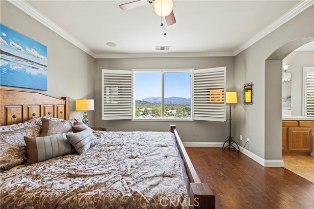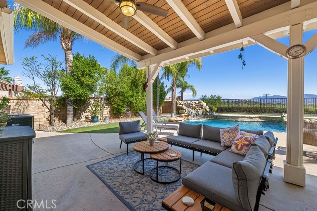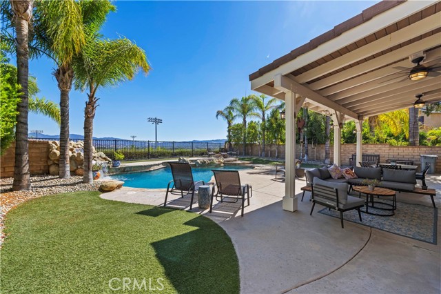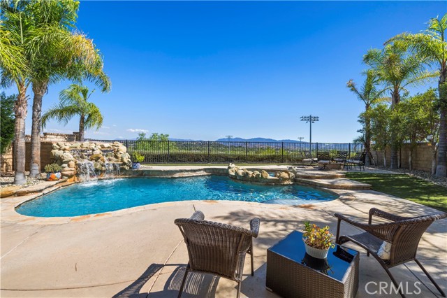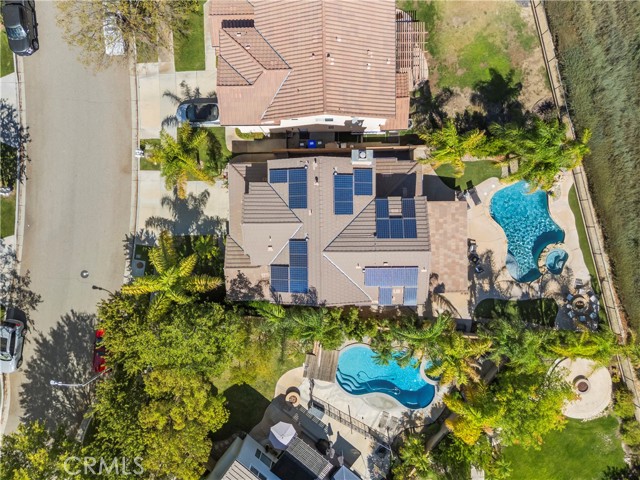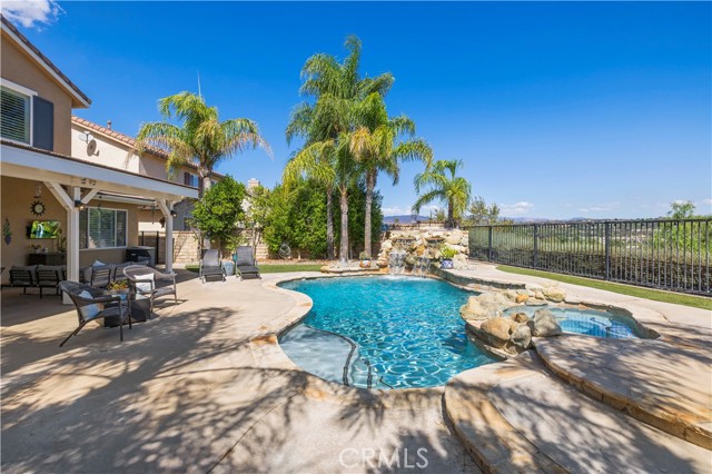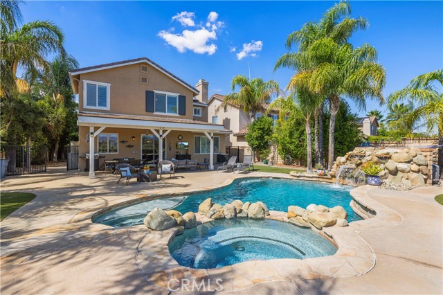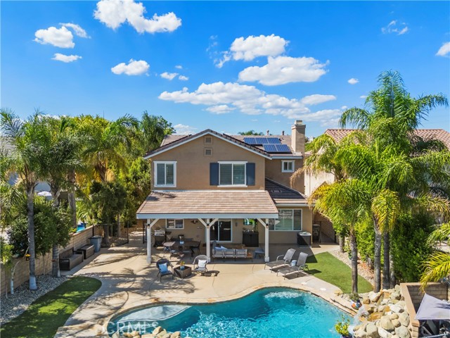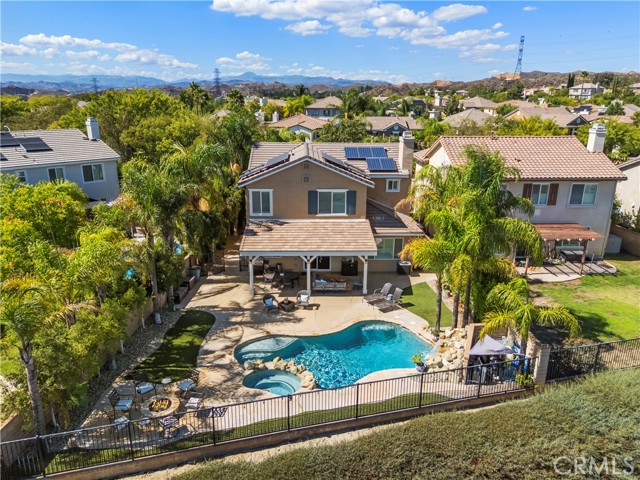 PANORAMIC VIEWS + OWNED SOLAR IN THIS GORGEOUS ALTA VISTA HOME! Welcome to this beautifully upgraded 4-bedroom, 2.5-bath POOL home, perfectly positioned on a premium lot with no rear neighbors, sweeping views of Santa Clarita PLUS perfect views of 4th of July fireworks! This beautifully maintained home offers incredible curb appeal with lush landscaping, nearly 20 palm trees, a cozy covered front porch, plus a spacious backyard designed for entertaining! Inside, you’ll find a bright, flowing layout with recessed lighting, plantation shutters, and tasteful finishes throughout. The upgraded kitchen boasts white cabinetry, granite countertops, a center island, stainless steel appliances including a double oven and beverage cooler, plus backyard views and a walk-in pantry. The adjacent family room is spacious with a cozy fireplace and custom built-ins. A main floor versatile office with built-in cabinetry offers functionality for work or study. Upstairs, the primary suite offers scenic views plus an ensuite bath with dual sinks, soaking tub, and separate shower. Two additional bedrooms share a full bath with double vanities, and a convenient upstairs laundry room completes the layout. Step outside to your own resort-style backyard featuring a sparkling saltwater pool with waterfall feature, relaxing spa, fire pit, and a covered patio with ceiling fan creating the perfect setting to enjoy peaceful evenings and incredible views! New air conditioner and water heater both installed in 2024! With OWNED solar, no rear neighbors, a 2-car garage, and NO Mello-Roos, this is a rare opportunity to enjoy privacy, comfort, and the very best of Santa Clarita living!