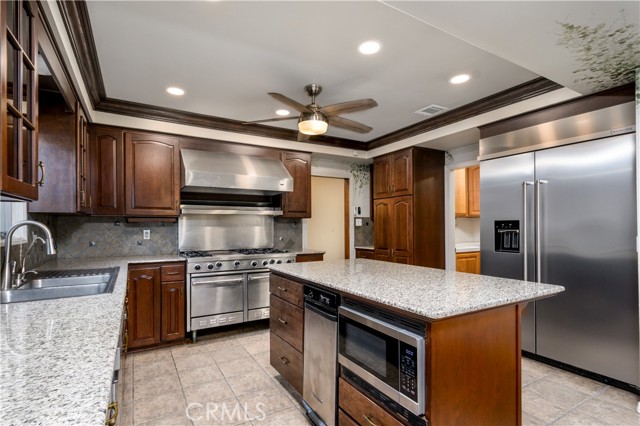 Welcome to 14120 Wyant Lane — a beautiful 5-bedroom, 4-bath home with 2,863 sq. ft. of living space, ideally situated on a 9,100 sq. ft. lot at the end of a quiet cul-de-sac. Step inside to discover an open and spacious floor plan designed for comfort and entertaining. The formal living and dining rooms each feature cozy fireplaces, while the expansive family room offers plenty of room to gather. At the heart of the home, the chef’s kitchen impresses with a Viking 6-burner gas stove, oversized built-in KitchenAid refrigerator, center island, and abundant counter and cabinet space. The primary bedroom offers privacy at one end of the house, with doors leading to outdoor patio dining area, an en-suite bathroom with dual sink vanity, walk-in shower and a soaking tub. Four additional bedrooms provide flexibility for family, guests, or home office space. Notable upgrades include dual-pane Anderson windows, a tankless water heater, and an inside laundry room with extensive cabinetry. Outside, the private backyard features a fully equipped outdoor kitchen—perfect for summer barbecues and year-round entertaining.