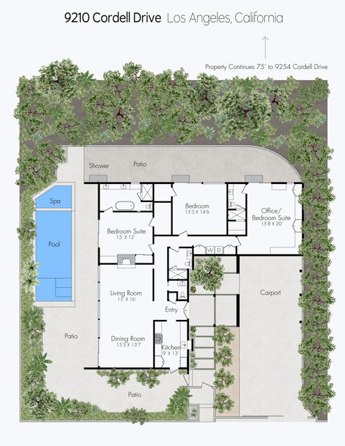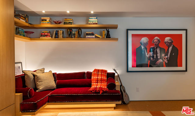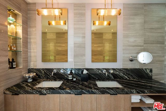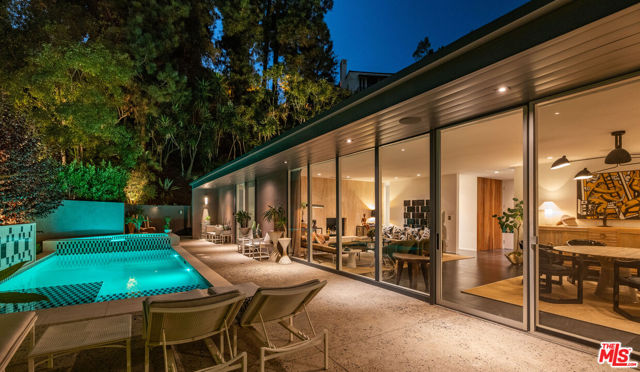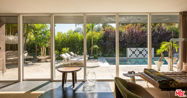 THE ULTIMATE BESPOKE BIRD STREETS JEWEL BOX. This sleek mid-century set behind gates and incredibly private, exudes elevated design at every turn. Inside, you'll find a superb floor plan separating the private quarters from principal spaces, creating ideal flow and functionality. The interiors are bathed in natural light, with floor-to-ceiling glass framing lush greenery outside while providing perfect walls for art inside. Black slate floors anchor the main living areas, while the living room features a striking stone clad fireplace. The gourmet galley kitchen features custom white oak cabinetry with brass mesh inserts, honed marble countertops, and exquisite detailing with top-line appliances and generous counter space. Every bathroom has been completely remodeled down to the studs with timeless materials and elegant finishes. The primary bath showcases travertine floors and walls, quartz countertops, and custom white oak wood paneling. The middle guest bath features a full travertine design with quartz counters and a tempered ribbed glass shower enclosure. A newly added guest powder room dazzles with black marble floors, Fornasetti designer wallpaper, and a one-piece Viola marble sink. The third bedroom features an ensuite bath adorned with oxblood and lavender marble finishes, burnished gold tile, and a relaxing sauna for the ultimate spa experience. Refined details abound throughout: most fixtures are unlacquered brass designed to develop natural patina over time, brass switch plates accent bathrooms and kitchen, and all lighting is dimmable. Quartz flooring adds durability to bathrooms and the newly added section. Outdoors, the home's mid-century architecture continues to shine. The completely redone pool features a new jacuzzi, waterfall feature, and automatic cover serving as the centerpiece of this tranquil retreat. Professionally designed landscaping and mature plantings create a seamless indoor-outdoor connection. Multiple sitting areas invite both quiet reflection and stylish entertainment, while a secluded outdoor shower adds resort luxury. Perimeter walls surround the driveway, with a security gate and LED strip lighting. The home can also be purchased fully furnished for an additional $200,000. By appointment only.