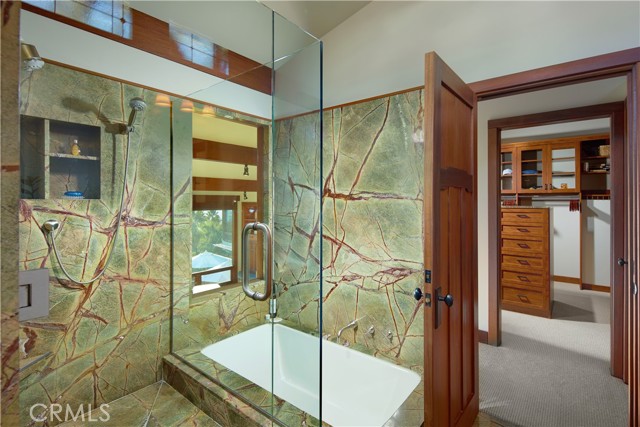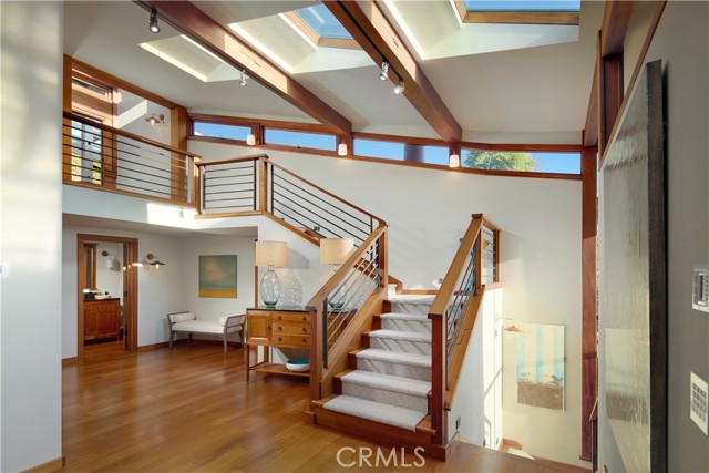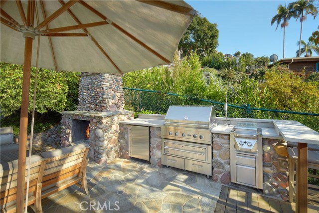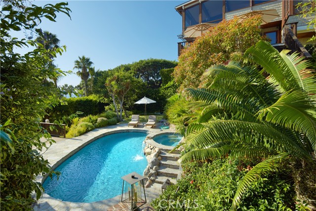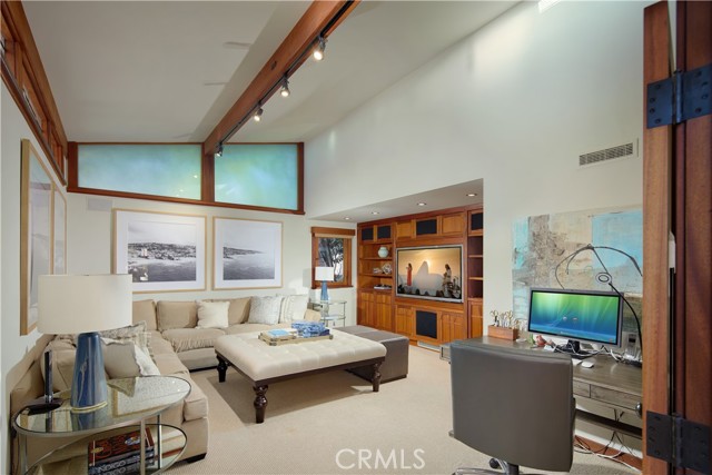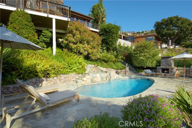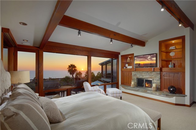 Designed by renowned architect Horst Noppenberger, this breathtaking approx. 3,665-square-foot coastal residence blends warm wood and glass elements with inspired modern design to capture panoramic ocean views and effortless indoor/outdoor living. Spanning three levels, the home welcomes you from the street-level entry with a light-filled foyer featuring clerestory windows, skylights, and custom woodwork, along with interior access to a two-car garage and four additional uncovered parking spaces. Descending to the main level, expansive living and entertaining spaces unfold—a great room anchored by a stone fireplace and rich custom cabinetry opens completely to covered terraces, creating a seamless connection between the interiors and the outdoors. This level features an ocean-view dining nook wrapped in glass, a well-appointed kitchen with polished Afyon white marble countertops, a media room, a half bath, and the ocean-view primary suite—a serene sanctuary with its own fireplace, sitting area, private balcony, and a luxurious bath with dual sinks, soaking tub, separate shower, and walk-in closet with built-ins. On the lower level, two oversized ensuite bedrooms and a laundry area provide comfort and flexibility, while stairs lead further down to the lush, terraced backyard centered around a sparkling pool and spa with waterfall feature, multiple seating areas, and a fully equipped outdoor kitchen with bar, grill, and fireplace—perfect for entertaining or sunset gatherings. In total, the home offers approx. 877 square feet of ocean-view decks, enhancing the seamless indoor/outdoor lifestyle. Thoughtfully appointed with premium finishes and technology, the residence features a Vantage lighting system for sophisticated, customizable illumination throughout. Tucked into the hills above Woods Cove, this architectural gem offers the best of Laguna Beach living—sweeping ocean and coastline views, proximity to pristine beaches, the Village, and the town’s celebrated art, dining, and coastal culture—all from a quiet, private setting that feels worlds away.
