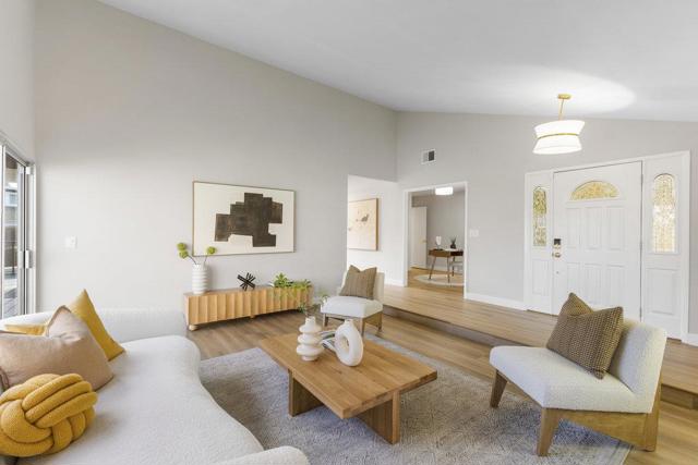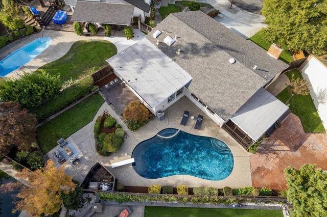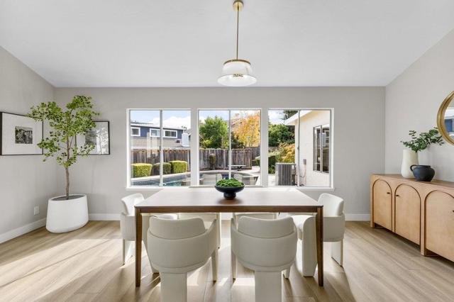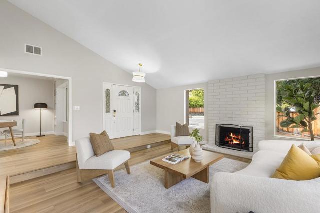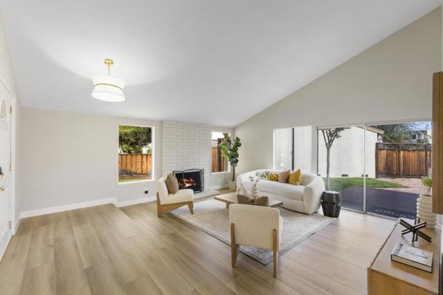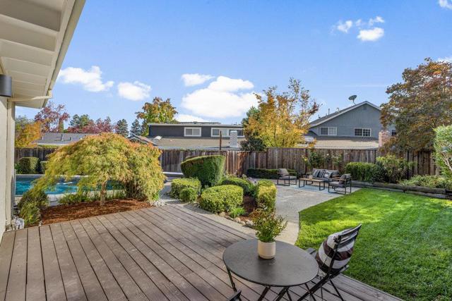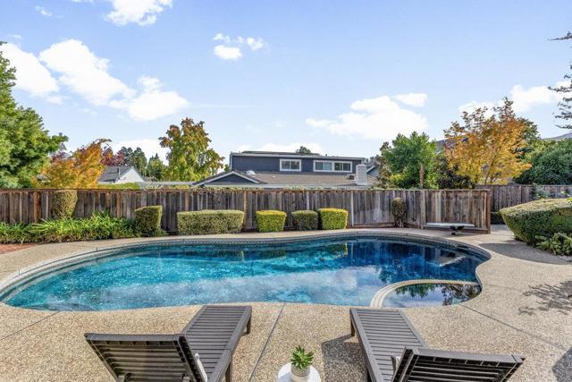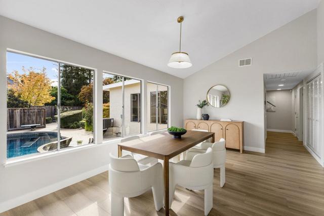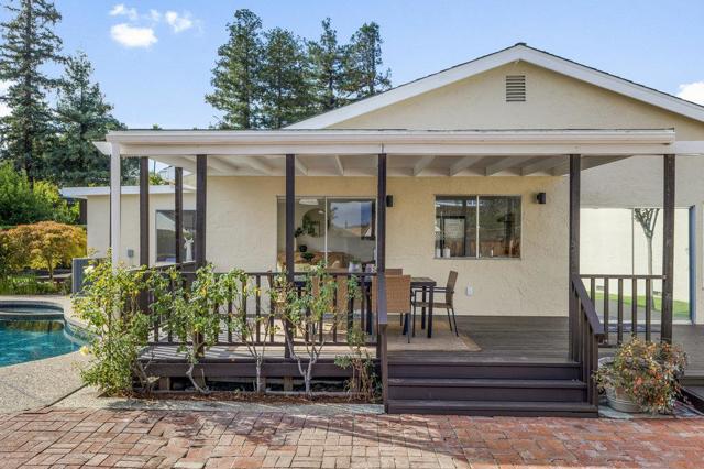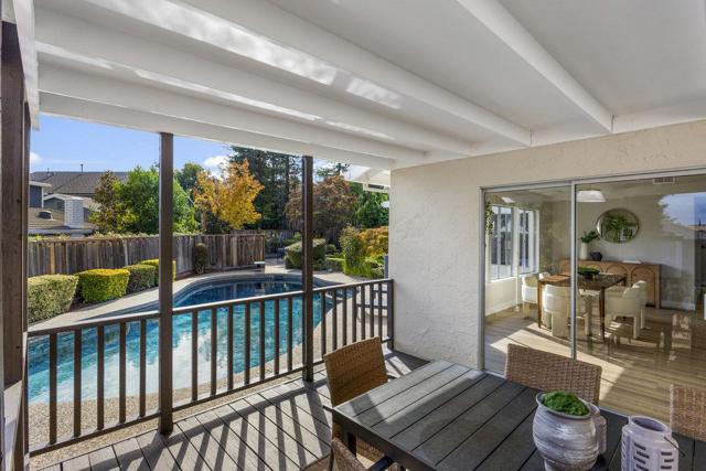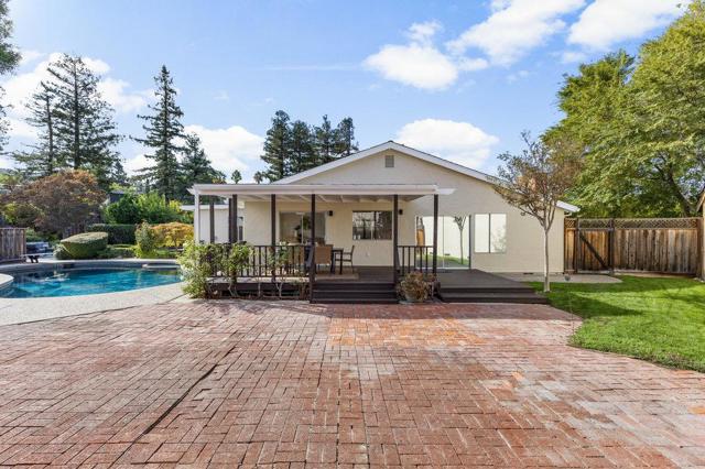 Beautifully updated ranch home on a quiet Almaden Valley cul-de-sac, where turnkey comfort meets seamless indoor/outdoor living. An inviting front yard with a covered porch and lush lawn sets the tone. A modern designer front door with sidelights opens to a dramatic sunken living room with soaring cathedral ceilings and a brick-clad fireplace. The convenient U-shaped kitchen with smart prep zones flows into the dining/family room for effortless connection. Fresh interior and exterior paint provide an ideal backdrop, while new LVT flooring runs throughout for a warm, cohesive finish. Updated bathrooms elevate the feel, and the primary suite offers a spa-like bath plus direct deck access for serene mornings. Sliding doors reveal a private resort-style backyard anchored by a striking black-bottom pool. Expansive redwood decks off the family, living, and primary spaces extend daily living for entertaining or unwinding. Front and back lawns add flexible space for play, pets, and gardening. A new high-efficiency HVAC system ensures year-round comfort. Attached 2-car garage with insulated automatic door. Minutes to parks, trails, schools, and shopping with easy Silicon Valley access. Top-rated San Jose schools: Los Alamitos, Castillero, Pioneer. Dont miss this stunning turnkey retreat!