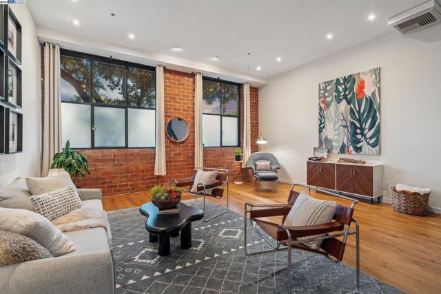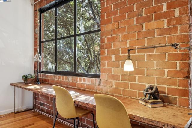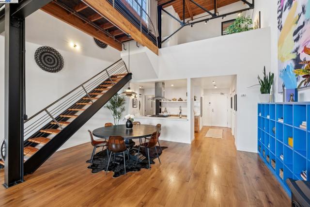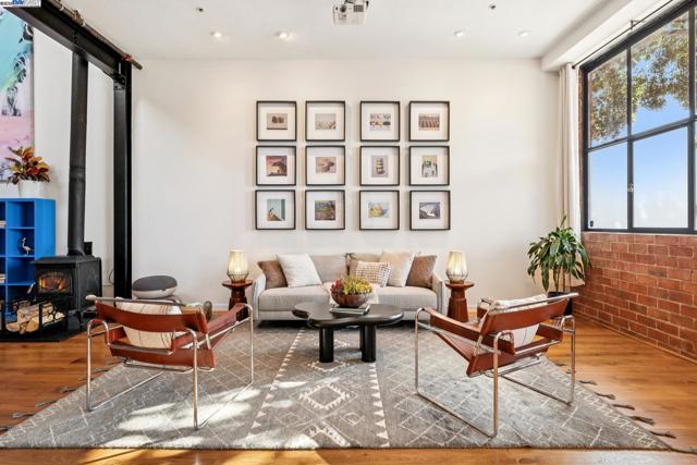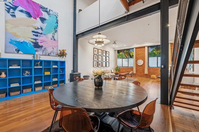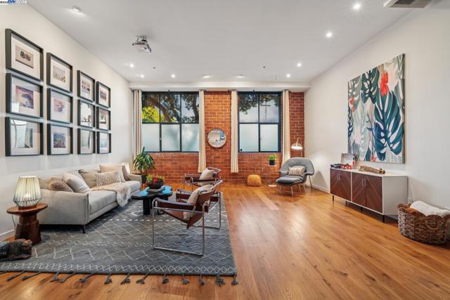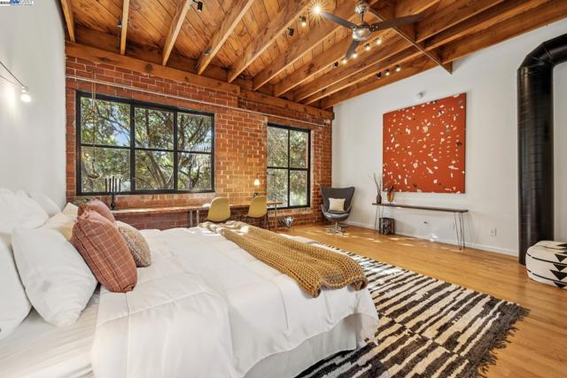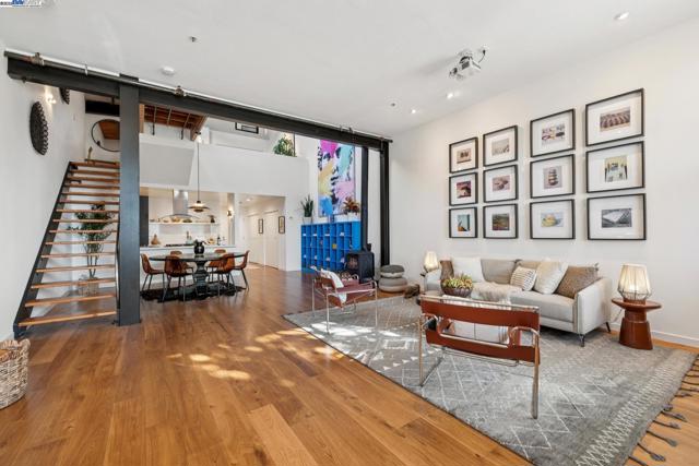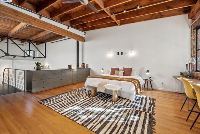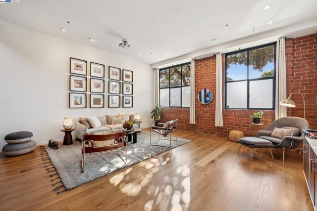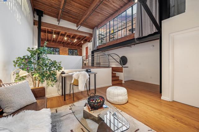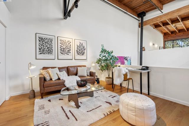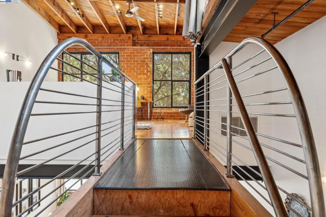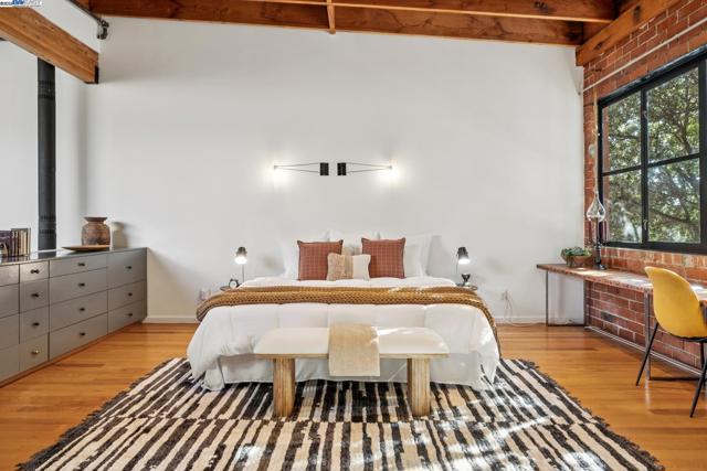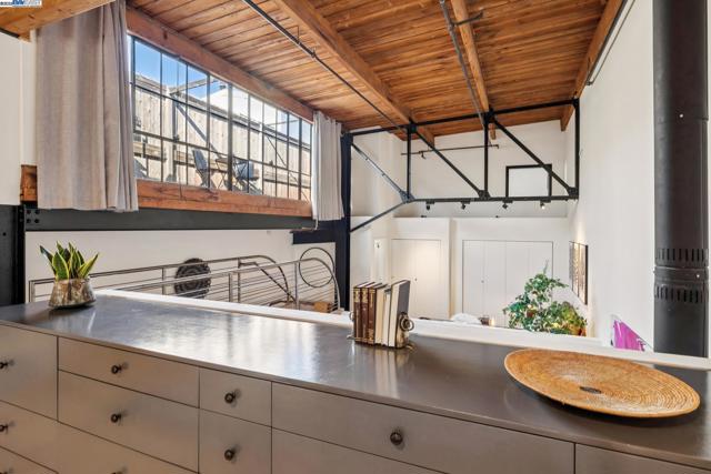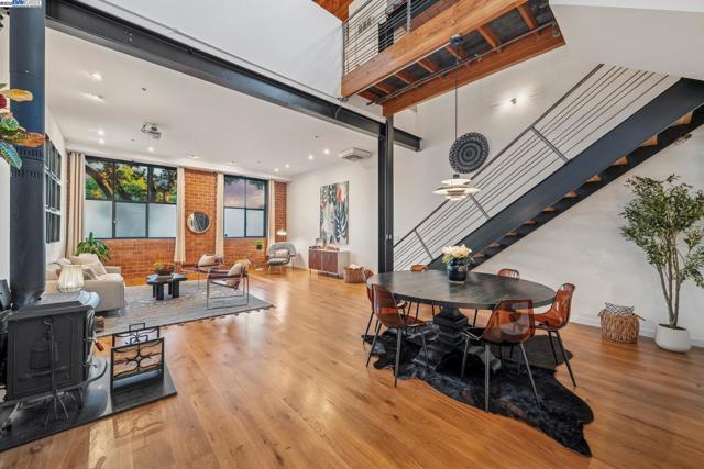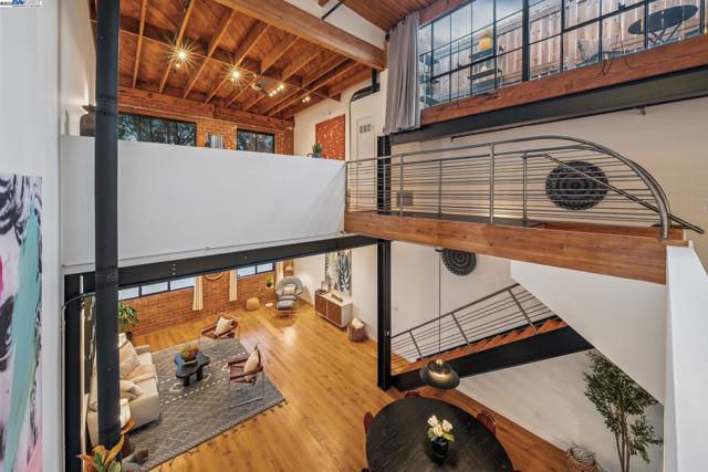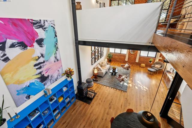 Enormous, ultra-chic loft awaits in this 2BD/1.5BA Emeryville live-work building offering dramatic and flexible space for an extraordinary and creative lifestyle. Originally built in 1941, the sunny 1701 SQFT loft surrounds you with great architectural details including exposed brick, soaring open beamed ceilings, Bauhaus windows, a floating staircase, and gorgeous hardwood floors. On the lower level, cook in the stylish, open kitchen while community gathers around the breakfast bar and dining area, or unwind in the spacious living area where sunlight streams through the large windows and a fireplace keeps it cozy. The lower level is complete with two large closets, a pantry, and a powder room. Upstairs, the flexible area allows you to work in privacy with sunshine and treetop views or potentially convert the space to a second bedroom. This level includes a full bath, laundry, and closet. Across a floating bridge, the primary bedroom includes a huge built-in dresser, exposed brick, beamed ceiling, and sunny windows. A gated entry, garage parking with storage, private roof garden, common roof deck plus nearby Amtrak, BART, and Emery Go-Round offer commuting ease. Enjoy the neighborhood’s great shopping, dining, and entertainment, SF Bay Trail, & lovely Emeryville Marina. Views: Downtown