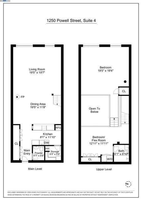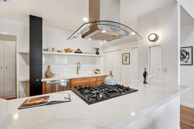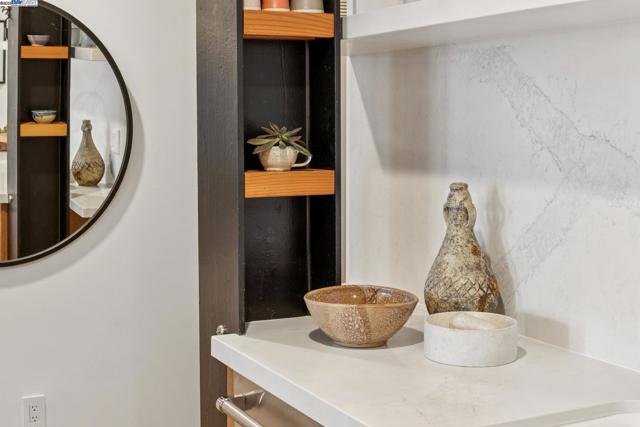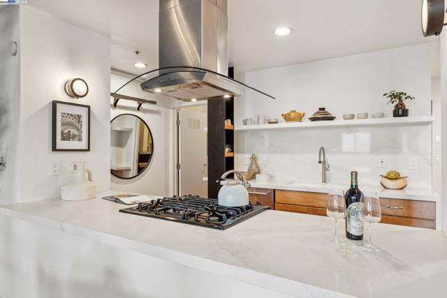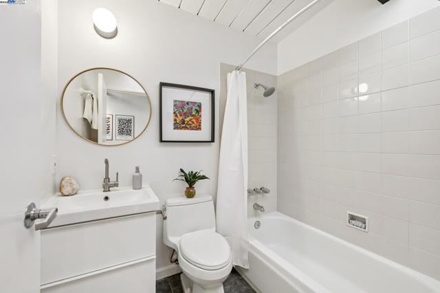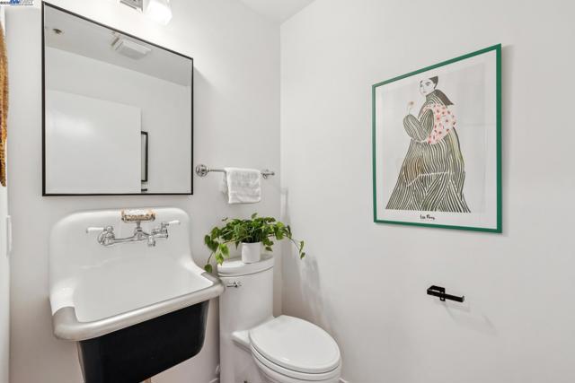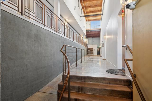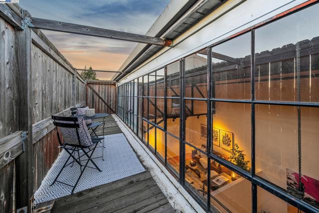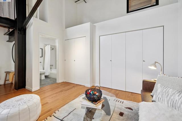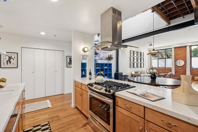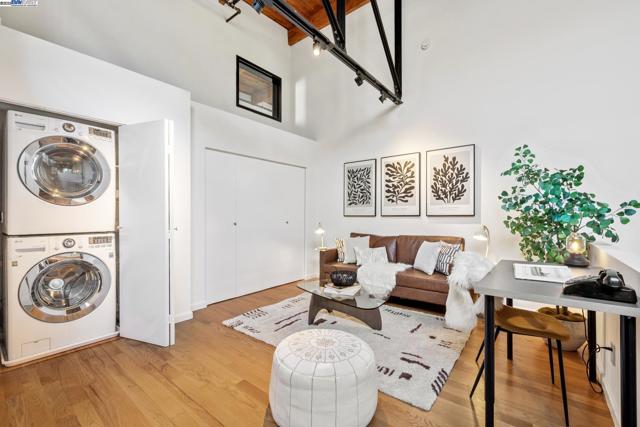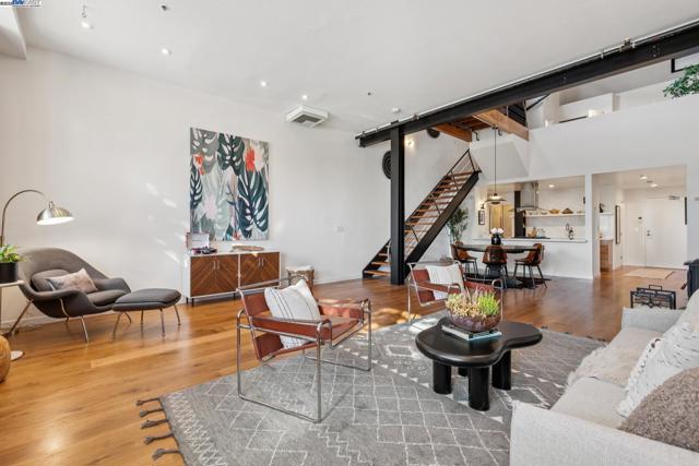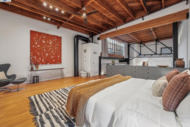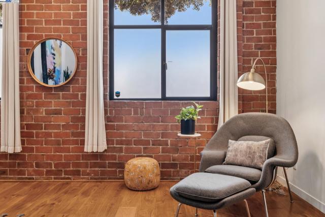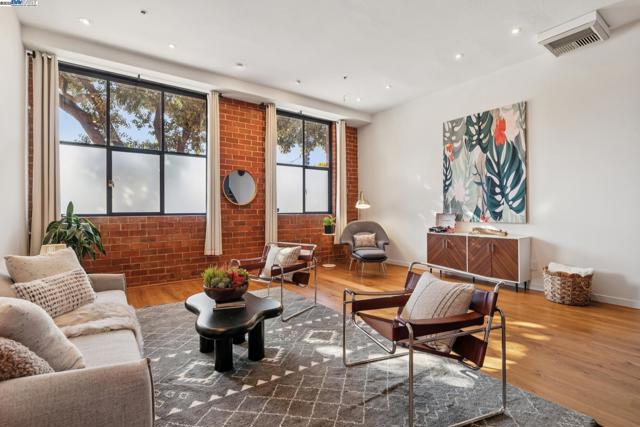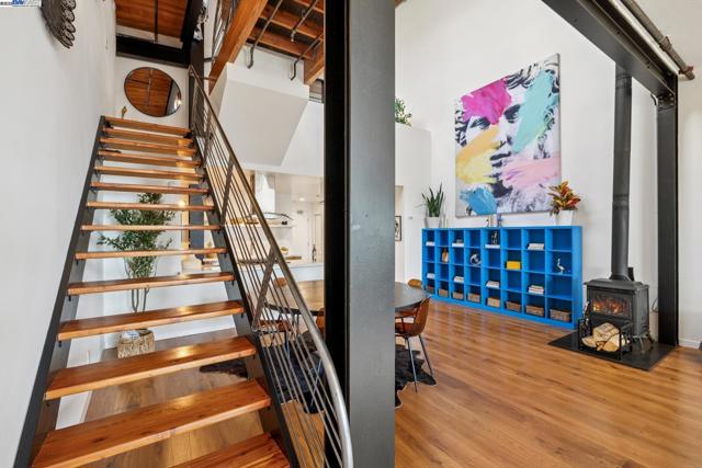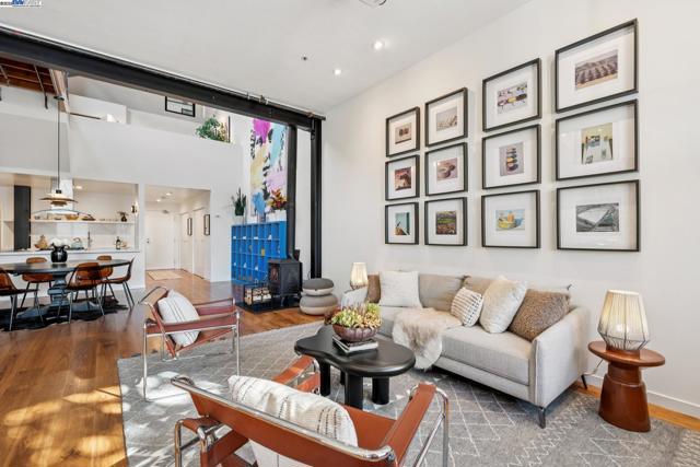 Enormous, ultra-chic loft awaits in this 2BD/1.5BA Emeryville live-work building offering dramatic and flexible space for an extraordinary and creative lifestyle. Originally built in 1941, the sunny 1701 SQFT loft surrounds you with great architectural details including exposed brick, soaring open beamed ceilings, Bauhaus windows, a floating staircase, and gorgeous hardwood floors. On the lower level, cook in the stylish, open kitchen while community gathers around the breakfast bar and dining area, or unwind in the spacious living area where sunlight streams through the large windows and a fireplace keeps it cozy. The lower level is complete with two large closets, a pantry, and a powder room. Upstairs, the flexible area allows you to work in privacy with sunshine and treetop views or potentially convert the space to a second bedroom. This level includes a full bath, laundry, and closet. Across a floating bridge, the primary bedroom includes a huge built-in dresser, exposed brick, beamed ceiling, and sunny windows. A gated entry, garage parking with storage, private roof garden, common roof deck plus nearby Amtrak, BART, and Emery Go-Round offer commuting ease. Enjoy the neighborhood’s great shopping, dining, and entertainment, SF Bay Trail, & lovely Emeryville Marina. Views: Downtown