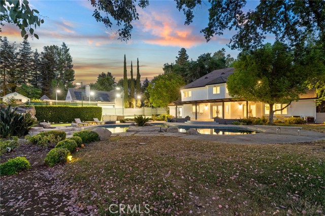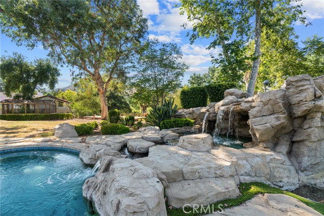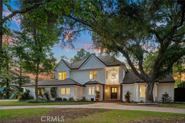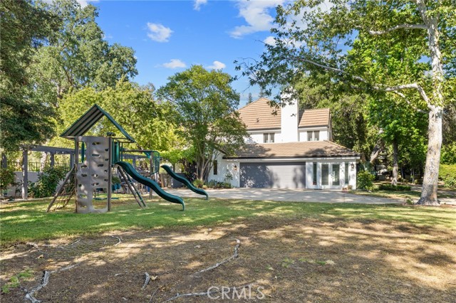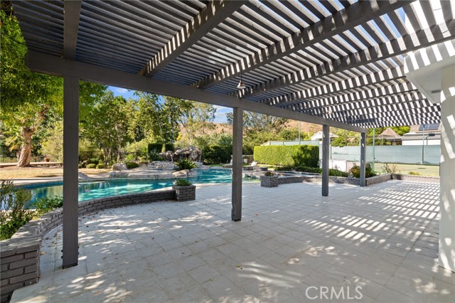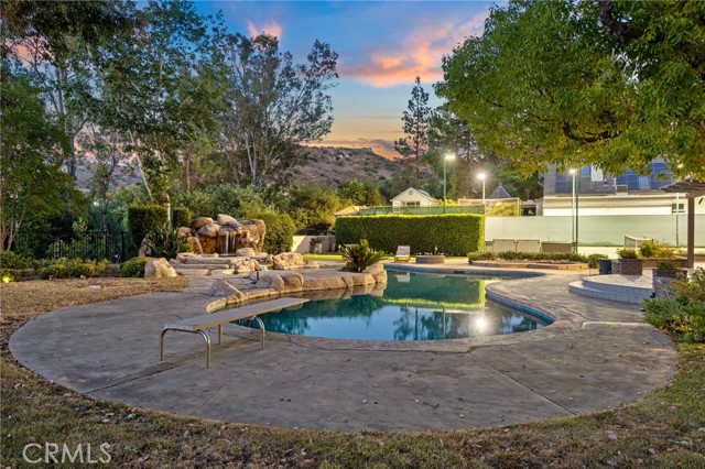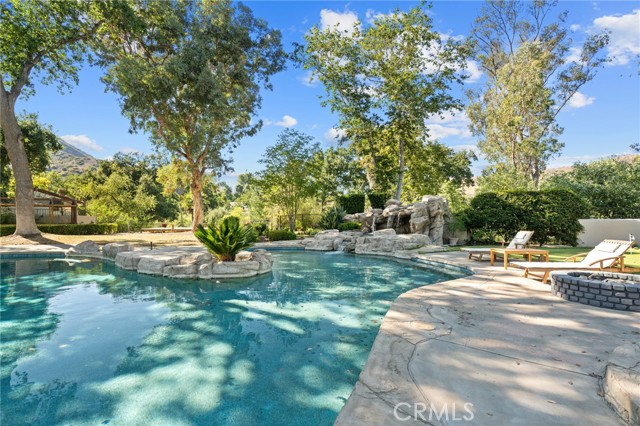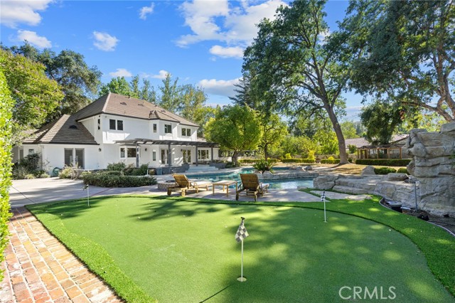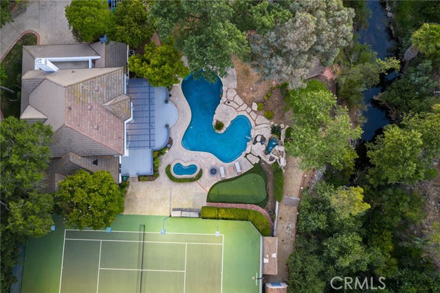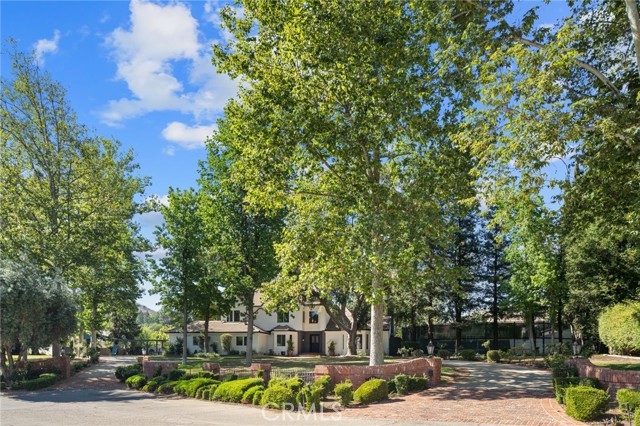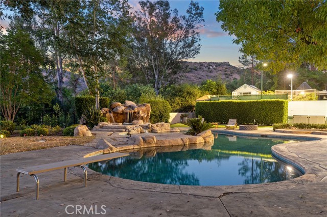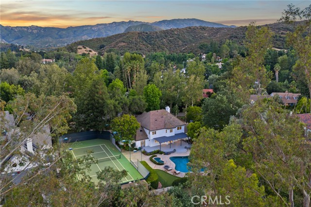 Stunning tennis court estate located at the base of the scenic Santa Monica Mountains, within the prestigious Countryside Estates community, adjacent to Paramount Ranch. Set on approximately one acre of lush, landscaped grounds, this home offers the ultimate in privacy, comfort, and resort-style living. Step into your own private backyard oasis—perfect for entertaining or unwinding in paradise. Enjoy a full-size lighted tennis court, putting green, and a sparkling swimming pool with a waterfall and spa. Mature landscaping includes oak trees, redwoods, and 30+ rose trees. Inside, the home boasts 5 spacious bedrooms, including a junior suite on the main level with its own sitting area and ensuite bath—ideal for guests or multigenerational living. Upstairs, the primary suite features two walk-in closets, a private patio, and a cozy gas fireplace. Two additional fireplaces warm the formal living room and family room, adding ambiance throughout. The upgraded kitchen is a chef’s dream with stainless steel appliances, a Thermador cooktop, and double oven. Recent improvements include new windows with 50/50 wide-plank plantation shutters, flooring, hand-made glass chandeliers, and whole home filtered water system, blending modern updates with timeless elegance. Situated on a peaceful cul-de-sac, the semi-circular driveway offers ample guest parking and plenty of space for RV parking. The third-car garage has been transformed into a fully equipped fitness/yoga studio. This exceptional property combines luxurious amenities, privacy, and an unbeatable location—truly a rare offering in one of the most desirable neighborhoods.