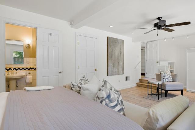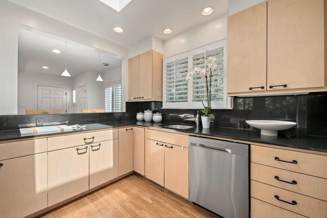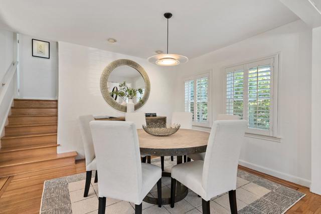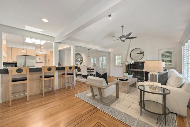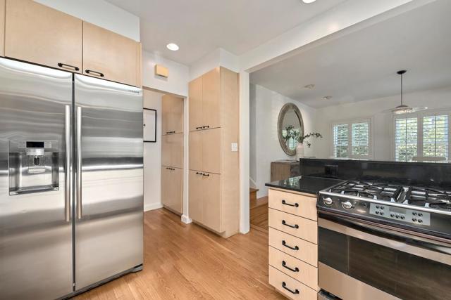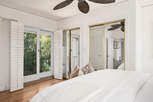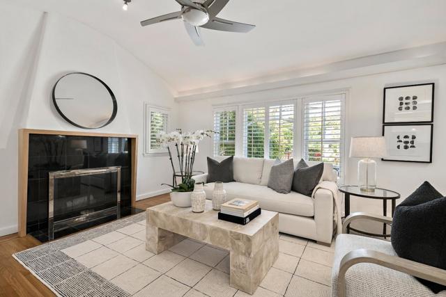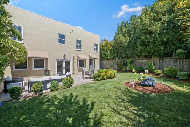 This beautifully maintained Mediterranean-style split-level home blends original architectural details with contemporary upgrades. The lower level features a spacious 3rd bedroom (converted with permits) with recessed lighting, and bright accent windows, complemented by a second full bathroom. French doors open to a large, tiled courtyard ideal for outdoor entertaining. The private, lushly landscaped garden and yard offers a serene retreat. Inside, the elegant open-concept living, dining, and kitchen areas showcase a coved ceiling and a striking granite-faced fireplace. The updated kitchen includes granite countertops, stainless steel appliances, skylight, birch cabinetry, and a welcoming breakfast bar. Upstairs, two full bedrooms feature custom plantation shutters, gleaming hardwood floors, and double-pane windows. The remodeled designer bathroom boasts marble and tile accents, a relaxing soaking tub, and a separate stall shower. The larger bedroom offers French doors opening to a period-inspired tiled balcony with wrought iron railing. Additional highlights include a full basement with laundry area, abundant storage, and potential for a wine cellar or home gym. This unique and versatile home is a true gem that combines sophistication, comfort, and classic Mediterranean appeal.