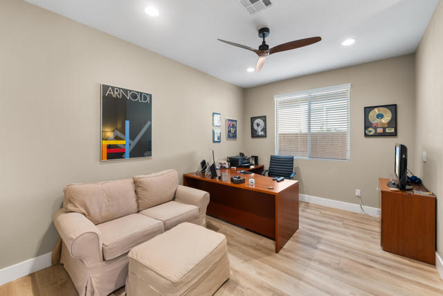 A 10+! This highly upgraded 2,348 sq. ft. home featuring 3 BRS, 4 BAS & a den/office, sits on a beautifully landscaped lot in a quiet cul-de-sac. The interior features multiple upgrades, including LVP floors throughout (except the primary BR, which has designer carpet), 5'' baseboards, a built-in entertainment center, suitable for almost any size TV, custom window treatments, frameless shower enclosures & custom paint throughout The beautiful kitchen has a custom backsplash, 2 ovens, quartz counters & much more! The front bedroom is like a 2nd primary bedroom with a walk-in closet, bathroom with dual vanities & more. The home is light and bright and has lovely views! There is also a PAID FOR SOLAR SYSTEM! 3rd bedroom used as a den. See attached document for a full list of upgrades & features. A must see! Just Bring your toothbrush!