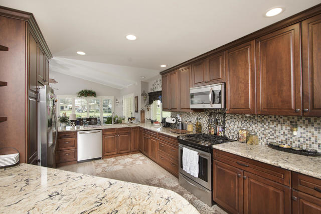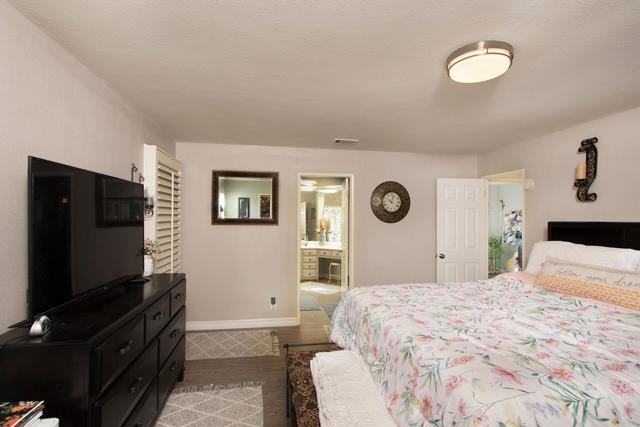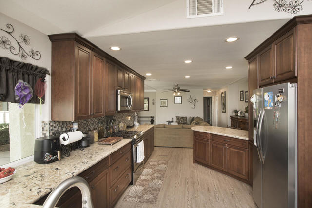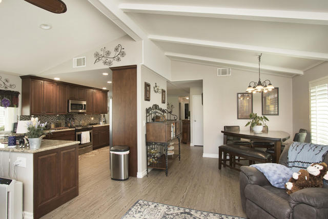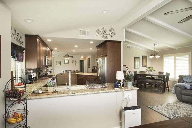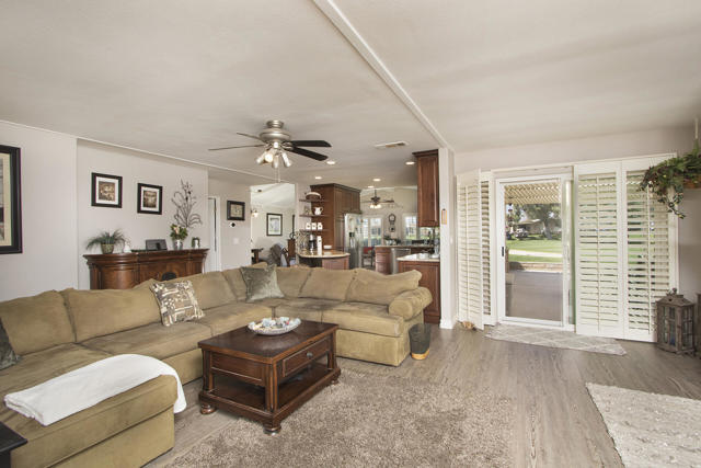 Beautiful remodeled and well-maintained home with stucco exterior offers an expansive views of golf course and mountains from oversized patio. 3 car garage with separate golf cart door facing a driveway that easily holds 2 vehicles. Enter the front door to the living room with a wide open view of the kitchen and adjoining family room on the other side of the kitchen. Two separate dining areas in the family room plus seating at the quartz countertop in the kitchen. Stainless steel appliances are a feature in this sizable kitchen designed for easy meal prep. Laundry room is loaded with storage and leads to the hallway for the guest bedroom and bathroom with the master bedroom/bath situated at the end against the garage wall easily buffering outside noise. Owner upgrades include all vinyl flooring, custom kitchen cabinetry with soft-close doors and new double pane windows and shutters throughout. Ivey Ranch has a par 3 golf course, tennis/pickleball courts, clubhouse, exercise equipment room, and 4 pools w/2 spas.Gated with guard on duty till 3 pm daily.