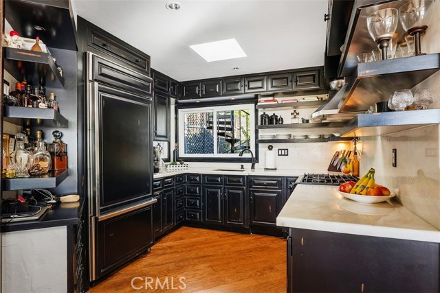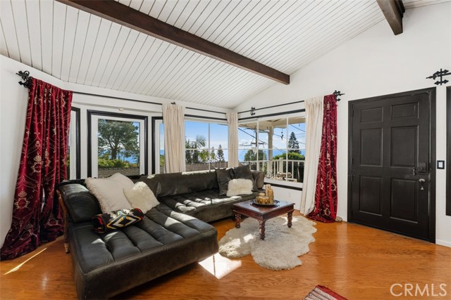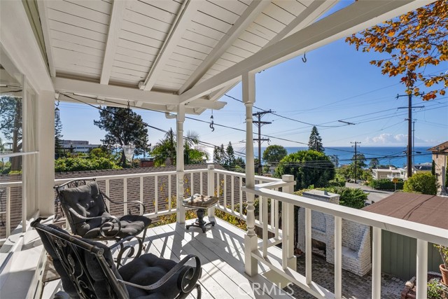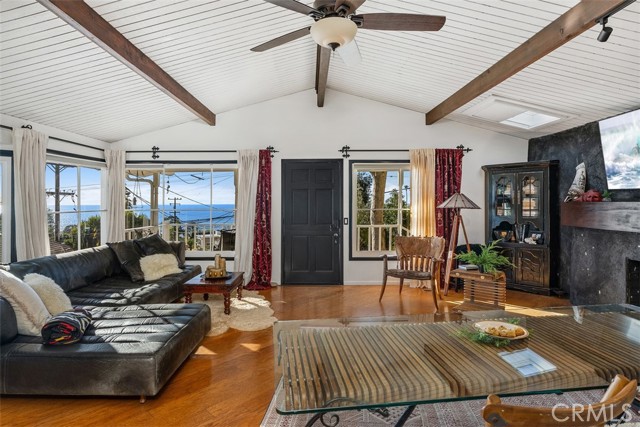 Discover your private sanctuary in this enchanting South Laguna Beach cottage with breathtaking panoramic Pacific Ocean and Catalina Island views. This charming home features an open floor plan with high pitched ceiling with large picture windows to the ocean views allowing an abundant amount of natural light, one bedroom, one and a half bathrooms, an upstairs office, and a downstairs studio with a private entrance, seamlessly blending historic allure with elegant comfort. The home features a custom kitchen with beautifully crafted custom cabinets and white quartz countertops that inspire culinary creativity. Start your mornings on the back deck; where you can enjoy breakfast, a yoga/meditation retreat with calming ocean breezes and amidst a lush landscape with fragrant fig, apricot, and plum trees, grapevine and captivating ocean views accompanied by birdsong. Spend your afternoons on the shaded porch deck under an old sycamore tree, taking in views of the wrap-around ocean and Catalina Island views. As evening descends, the rooftop deck transforms into the perfect setting for a candlelight dinner. Watch as the sun slips into the ocean nightgown, painting the sky in hues of red and orange. A charming brick pathway leads you through the garden, enhancing the home's inviting aura. Located within a short distance to Thousand Steps Beach, Table Rock Beach, and beloved local shops and dining spots, this home perfectly balances peaceful living with seaside convenience. Embrace the coastal lifestyle in this remarkable piece of Laguna Beach history. Proudly listed on the Laguna Beach Historic Homes Registry and benefiting from the Mills Act for significant tax advantages.