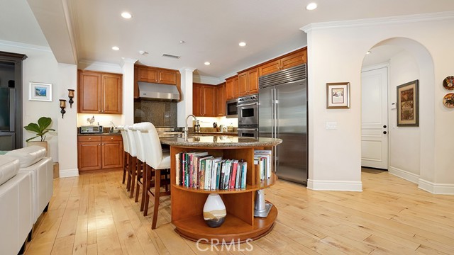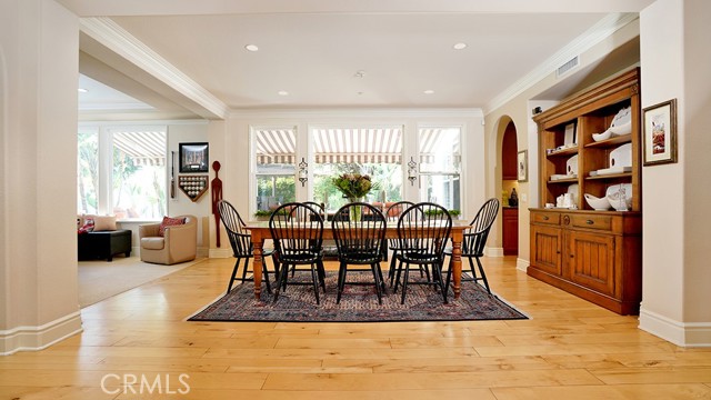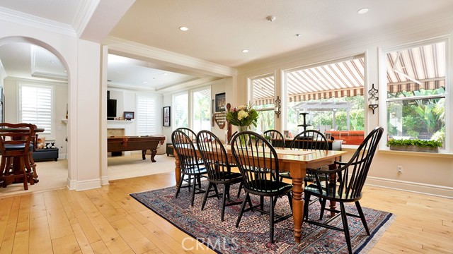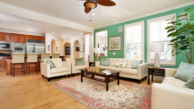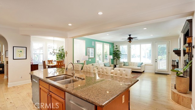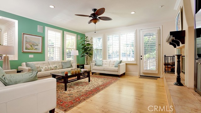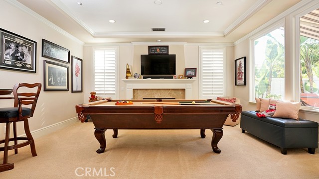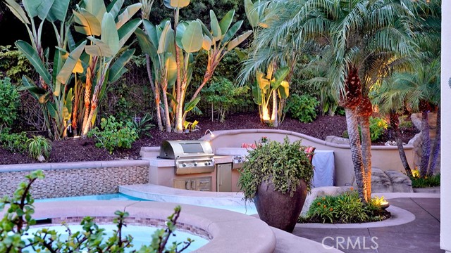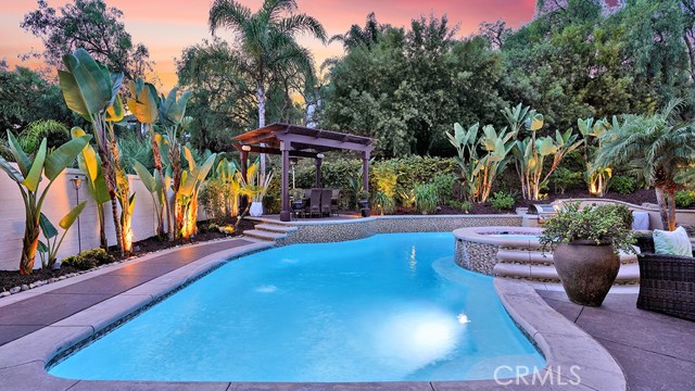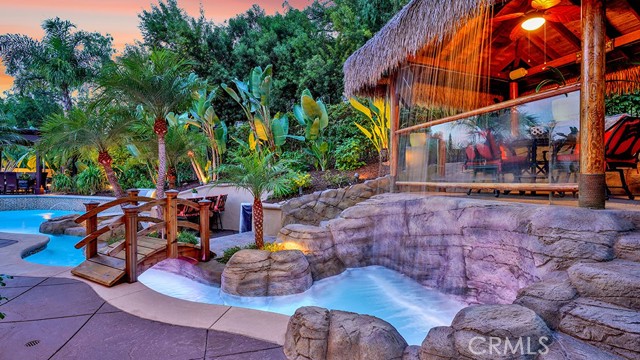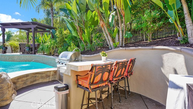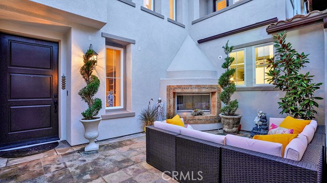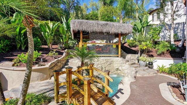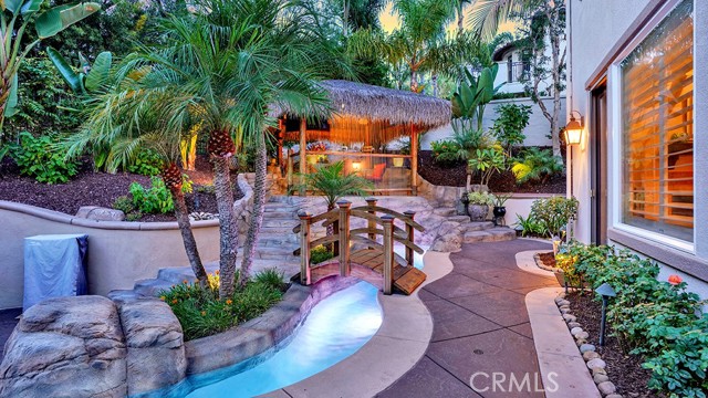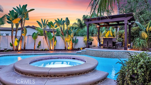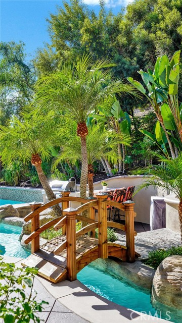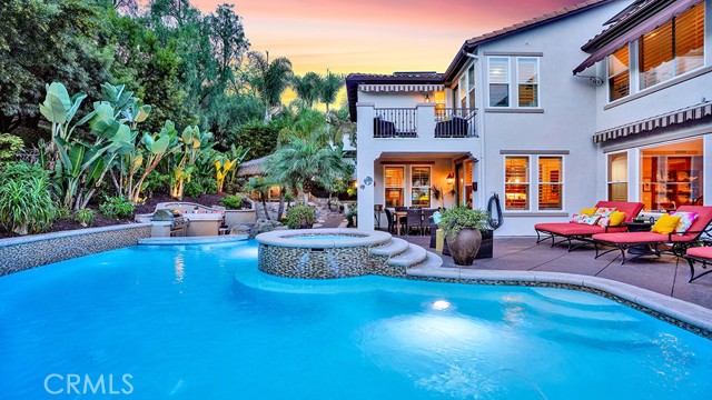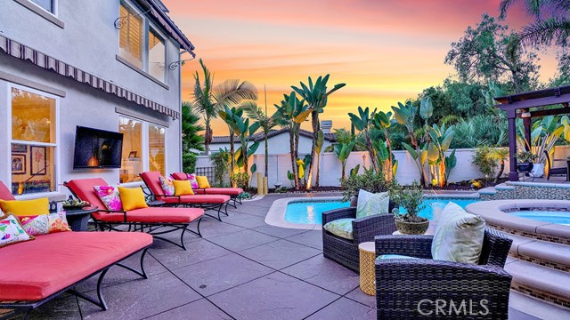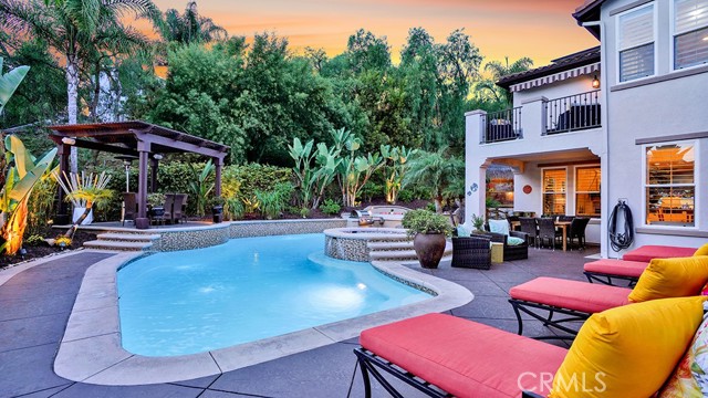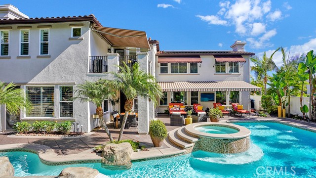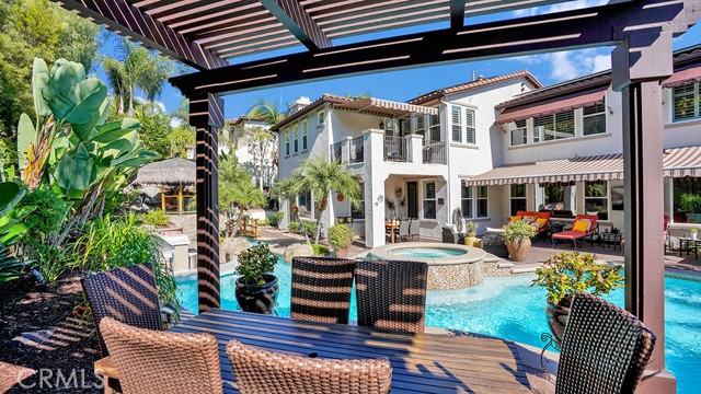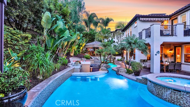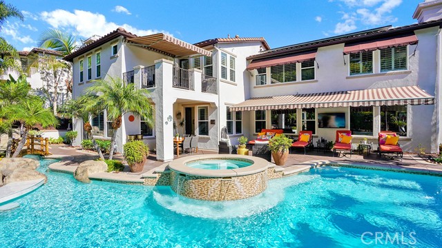 Exquisite Resort-Style Home in Talega’s Coveted Montellano Tract. Pride of ownership radiates throughout this stunning 5-bedroom, 4.5-bath, 4,423 sq. ft. home on an 11,325 sq. ft. lot. This two-story residence blends timeless elegance with modern resort-style living. A dual-step path framed by lush palms and landscaping leads to a gated courtyard with a built-in fireplace and seating area. Inside, the grand formal dining room overlooks the backyard, while the formal living room offers cozy carpet, a fireplace, and abundant natural light. Crown molding and light hardwood floors flow throughout the main level, creating an elegant, open feel. Downstairs features a stylish powder bath and a private ensuite bedroom—perfect for guests or multigenerational living. The gourmet kitchen is the heart of the home, showcasing granite countertops, rich wood cabinetry, a Sub-Zero refrigerator, Viking double ovens, stovetop and hood, dual dishwashers, pantry and a large island with seating and open shelves. A separate breakfast nook complements a butlers pantry with a dedicated coffee/bar. The adjoining family room offers custom built-ins, fireplace, and shuttered windows overlooking the backyard, plus direct outdoor access. A generous laundry room with cabinetry, sink, and counters connects to the three-car garage with new epoxy flooring. Upstairs, elegant white patterned carpet flows throughout. The primary suite features a fireplace, private balcony with retractable awning, and a spa-inspired bath with dual vanities, soaking tub, walk-in shower, and remodeled his-and-hers custom closet. Three additional bedrooms include two ensuites (one with its own balcony) and a third near the spacious loft—ideal for a playroom or office. The hallway includes built-in cabinetry, and all upstairs rooms feature plantation shutters. The resort-style backyard is a showstopper: a sparkling pool with multiple water features, bar seating, and a lazy river leading to a waterfall. A bridge crosses the water to the built-in BBQ area with bar seating, while stairs lead up to a tiki hut with private dining, TV, and a cascading water feature into the pool. Multiple lounging and dining areas surround the pool, the side of the home has built-in garden planters and all planters have individual drip lines for easy care. Additional highlights: new tankless water heater, redone pebble-tech coated driveway, two new gates, new front door, stylish awnings and full exterior paint completed one year ago.