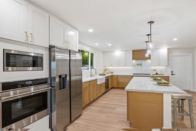 This is a stunning, fully turn-key home with brand-new systems and high-end finishes. Move-in ready with a new roof, new HVAC, and a complete modern redesign that gives the home a fresh, new-build feel. Inside, the bright open layout features brand-new flooring, tile, fresh paint, and all new windows and doors. The designer kitchen includes all-new cabinetry, modern appliances, and brushed-gold fixtures. A separate laundry room adds convenience and extra storage. The home sits on a quiet residential street and offers a beautiful backyard with a panoramic ocean view, the perfect setting for relaxing or entertaining.