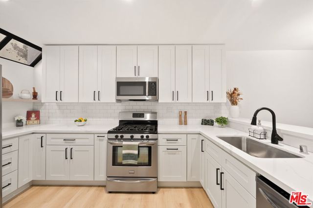 Welcome to this beautifully renovated two story, 2-bedroom, 2.5 bathroom townhome style condo located in the heartbeat of Santa Monica. Experience the perfect blend of effortless coastal living and unbeatable urban convenience in a fantastic location! Nestled on a quiet, tree-lined street in a small modern 8-unit building in one of Santa Monica's most vibrant areas; everything you can possibly need is a short stroll away: If LA driving has got you down park your car for the weekend and enjoy world-class dining and shopping on 3rd St, Main Street and Montana Avenue just minutes away. Stay active with nearby gyms, yoga studios, and bike paths, or unwind at the beach-a mere 10 minute stroll or bike ride! Blocks away from Trader Joe's, Von's, CVS, Santa Monica Library, movie theaters, Farmer's Market, Palisades Park and more! Inside, you'll find new wide-plank flooring in a light oak finish, a bright newly remodeled open kitchen, with ample cabinetry, stainless steel appliances, quartz countertops, tile backsplash and recessed lighting. The spacious living room is anchored by a cozy Venetian Plaster fireplace and opens to an expansive outdoor patio, perfect for entertaining and relaxing evenings under the stairs. Upstairs, the light-filled primary suite boasts a custom closet, dual vanity, and private bath with a second bedroom and separate full bathroom nearby. A tucked-away in unit laundry area, Ecobee thermostat, central HVAC, tankless water heater and smart entry lock complete the home's conveniences. Additional highlights include plenty of storage with an oversized hallway closet and two private storage cabinets in the community garage. 2 separate parking spaces (not tandem). NOT SUBJECT TO RENT CONTROL and also is pet friendly. Conveniently located near freeway access and the Metro Expo line for easy connectivity to greater Los Angeles; Situated in top rated Roosevelt and Lincoln school districts. This property is a rare find with its pefect blend of style and comfort ready for you to make it your own. This is truly Westside living at its best!