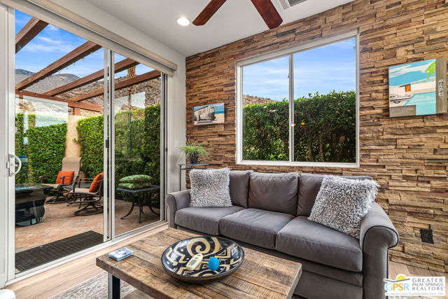Palm Springs 2 bedroom 2 bath condominium, 2102 square feet of living space on FEE land (No Land Lease). Located in the community of Canyon Heights offering stunning panoramic views of the surrounding desert landscape and is known for its natural beauty, tranquility, and upscale living. Inside, an open concept floor plan- living room, dining, kitchen and breakfast room with quartz countertops, updated appliances (built in wall ovens w/convection) microwave, dishwasher, Wolf gas cooktop and designer hood vent. Walk in pantry, kitchen island, and dry bar. Two generous size ensuites, suite one with extra large walk in closet, stall shower and soaking tub with double sided fireplace to bath and bedroom. Suite two with private bath and generous size room. This property lives like a single family home, is in move-in ready condition upgraded with: vinyl flooring throughout, ceiling fans, recessed lighting, built ins, dry bar, stone accent walls, remodeled baths, dual zone a/c, dual pane windows, smart thermostats, customs window treatments, two car garage, two outdoor private terraces with stunning mountain views. The Canyon Heights community offers resort style living with pools/spas, tennis/ pickle-ball courts, clubhouse, fitness room, putting green, and gated access to the Lykken hiking trail & Oswit Canyon Preserve, two golf courses nearby, this is a perfect Palm Springs lifestyle property, very reasonable HOA fees, and a well maintained community on FEE LAND (no lease). Conveniently located close to downtown Palm Springs, which offers a variety of shopping, dining, and entertainment options.
