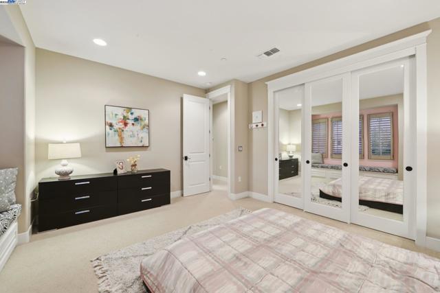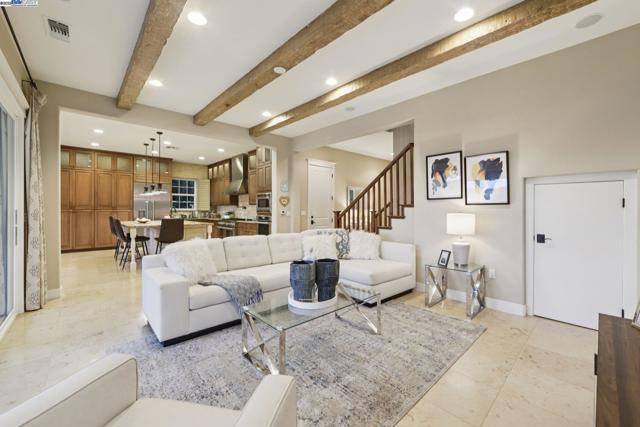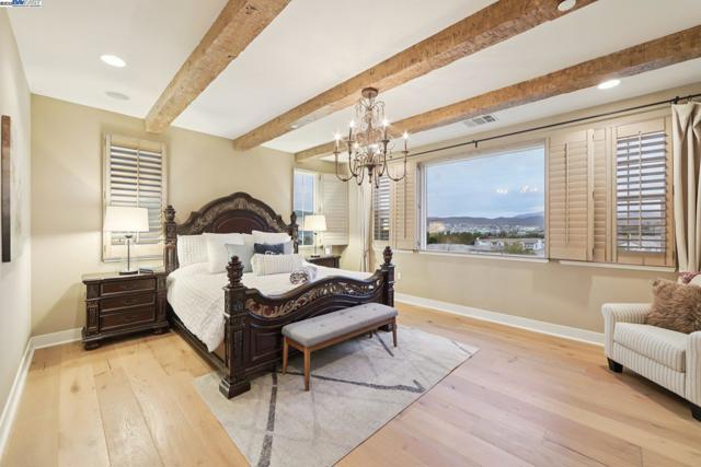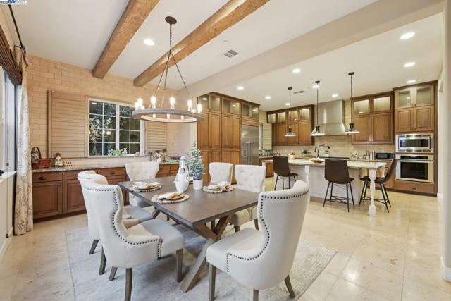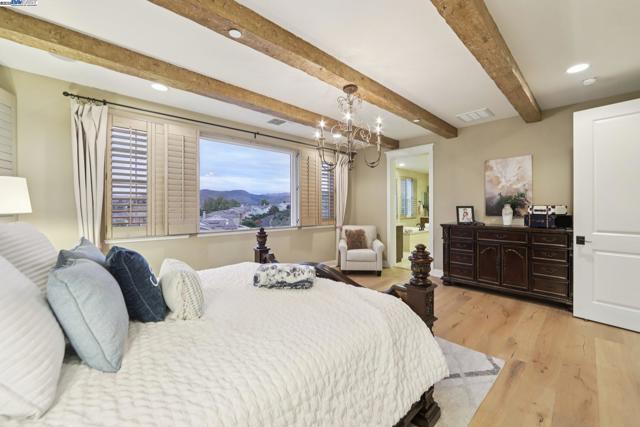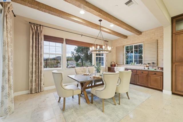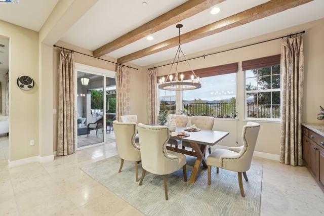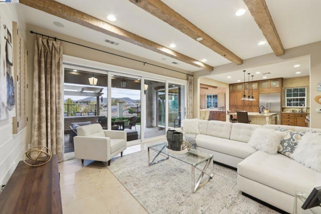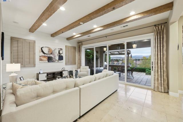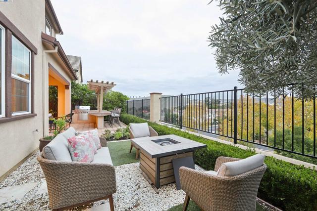 Stunning former model home with breathtaking hill views from both floors and approximately $300K in premium upgrades on a highly desirable view lot. The interior boasts hardwood and stone tile floors, French maple cabinetry, beamed ceilings, built-ins, stone accents, wooden shutters, and surround-sound prewire. The gourmet kitchen features ceiling-height cabinets, a large island, and Thermador stainless steel appliances, including a 48" oven and pot filler. The great room flows effortlessly through an expandable glass wall to a covered patio, creating seamless indoor-outdoor living. A convenient first-floor bedroom and full bath add flexibility. Outdoors, enjoy a finished backyard with a covered tile patio, faux beams with pendant lighting, a built-in KitchenAid BBQ with seating, and a gas fire pit—all overlooking rolling hills. Ideally located near top-rated schools with excellent access to commute routes, this home offers luxury, style, and unparalleled views at every turn.