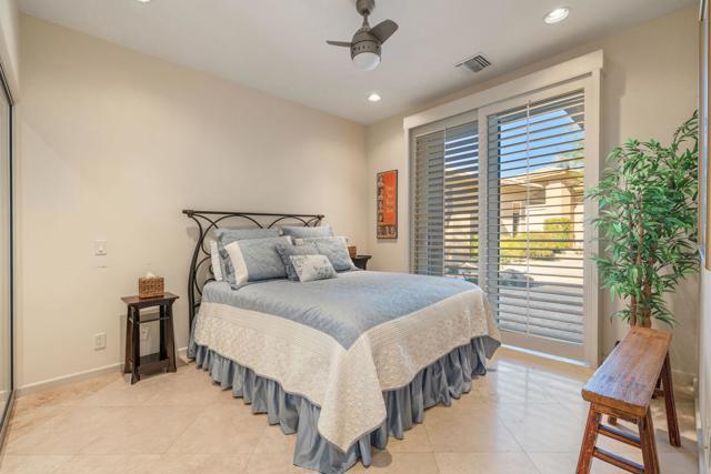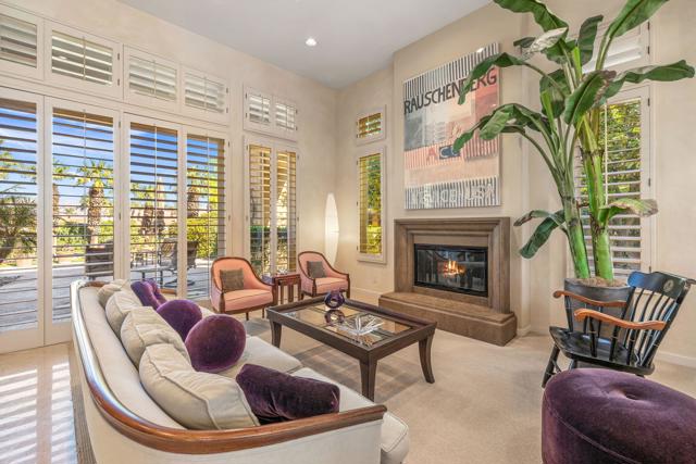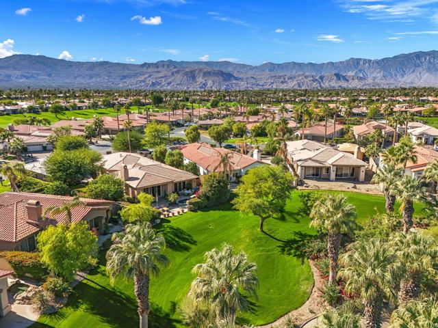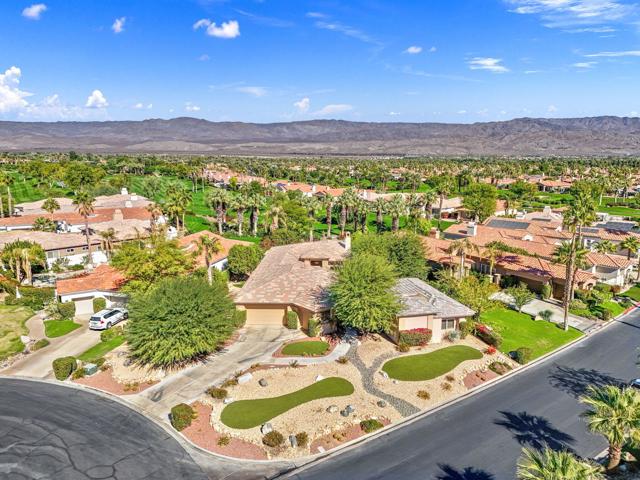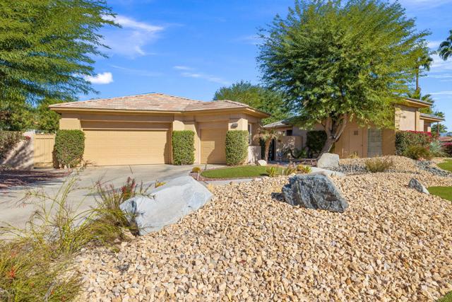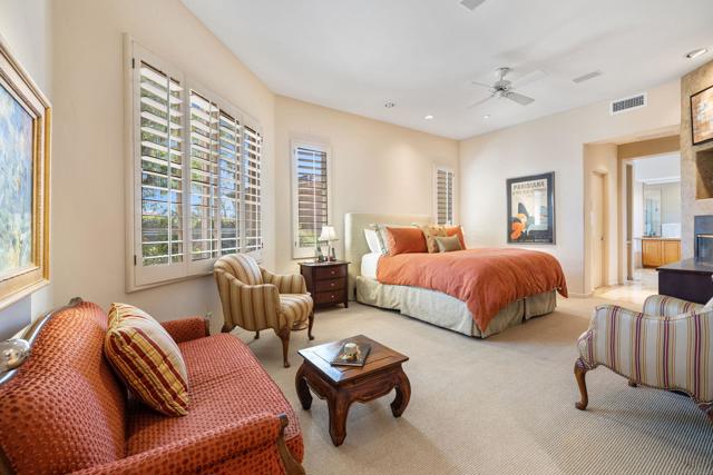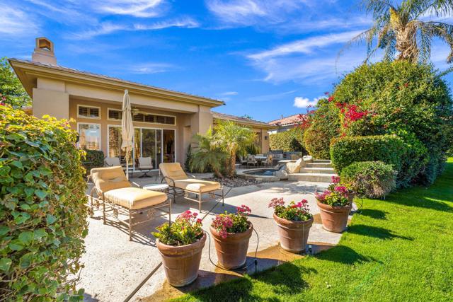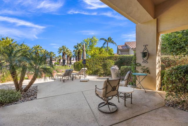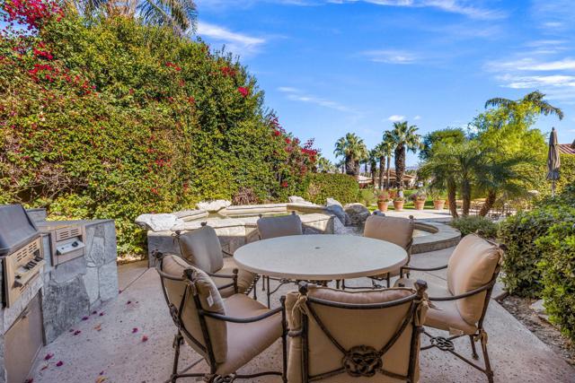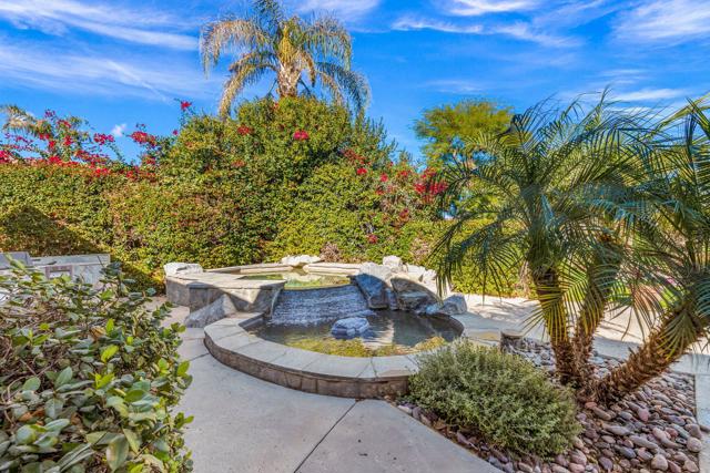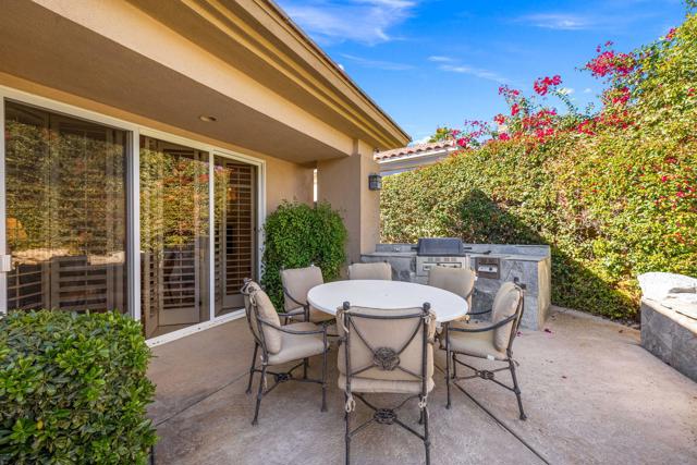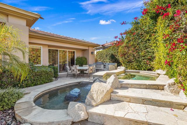 Discover your dream home in Indian Ridge, Palm Desert! This rare Bougainvillea 2 with custom casita sits on a spacious .04-acre corner lot at Dove Run and Tomahawk--a size seldom found in the community. The main house features a well-designed Bougainvillea 2 floor plan with 3 bedrooms, 3.5 bathrooms, and builder upgrades including granite countertops, travertine flooring, surround sound speakers and plantation shutters throughout. You'll find cozy fireplaces in both the great room and primary suite, creating a warm ambiance. Additionally, the property includes a custom-built casita with a comfortable living room, two bedrooms, and a full bathroom--perfect for guests or extended family. Step outside to an expansive outdoor living area featuring a spool, built-in BBQ and a private patio with views of the stunning Chocolate Mountains and a park-like setting overlooking the 18th hole of the Arroyo Course. The drought-tolerant landscaping with turf and rock ensures a low-maintenance, beautiful yard. Just a short distance to the south driving range and community pool, this home offers exceptional space for family living and entertaining. Plus, it's furnished per inventory, and there's no wait for Club membership--your ideal lifestyle awaits!