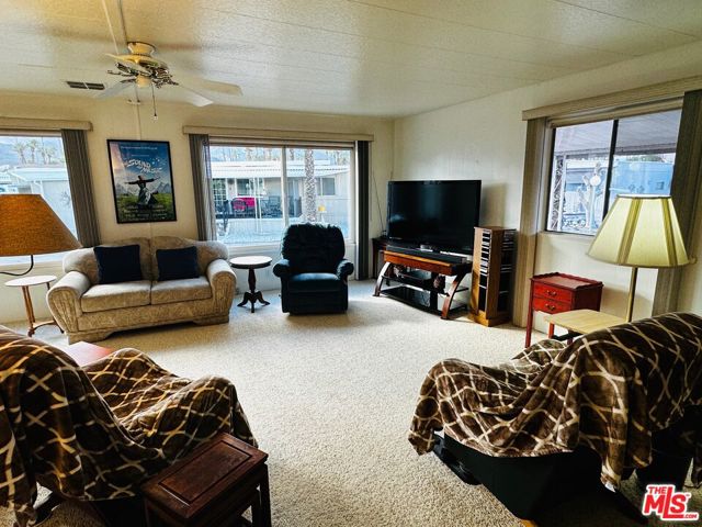 Offered fully furnished & completely turn-key, this METICULOUSLY maintained home is move-in ready! Featuring 1,480 square feet of living space, including 2 bedrooms & 2 bathrooms, this super clean mobile home sits on a corner lot in pet-friendly Royal Palms! Upgraded where it counts, yet maintaining just the right amount of original charm, the home features a massive great room with grand picture windows and mountain views, a formal dining area, a pristine kitchen with breakfast bar, indoor laundry, upgraded flooring in the kitchen and baths, central HVAC and a swamp cooler, a large elevated deck with newer carpet, dual carports with parking for four, three storage / garden sheds, additional foundation support piers... The list goes on and on. Royal Palms has many outstanding amenities, including indoor shuffle board courts, four pickle ball courts, a clubhouse, community pool & spa, fitness center, putting green, 2 dog parks, and more. This is the one you've been waiting for! With a low monthly lot rent of just $895 that includes sewer and trash, this one won't last! Schedule your tour today! Royal Palms is a 55+ community.