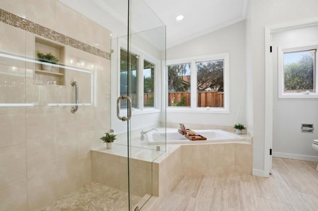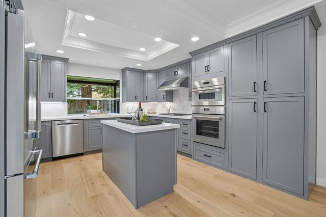 This three-bedroom, two-and-a-half-bathroom single-story home offers approximately 2,470 square feet of living space. The open-concept living area seamlessly integrates the kitchen, dining, and living room, creating an inviting atmosphere for entertaining or daily living. The kitchen boasts a large center island, abundant cabinetry, and high-end appliances. Sliding glass doors open to a private outdoor patio, providing a seamless transition between indoor and outdoor living. The primary bedroom features ample natural light and an en-suite bathroom with dual sinks and a walk-in shower, and an oversized soaking tub. The two additional bedrooms are well-proportioned and provide versatile space for personal use or as home offices. The remaining bathrooms are appointed with modern fixtures and finishes, natural stone, and ceramic tile. The property features a professionally landscaped yard mixed with mature landscaping, offering a serene and peaceful retreat. The attached 3-car garage also provides additional storage space. This home is situated in a desirable neighborhood on a quiet street. All this with the benefit of solar panels and highly ranked local schools.