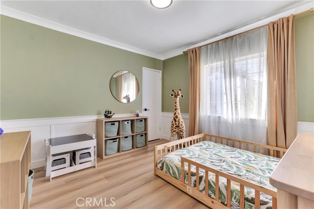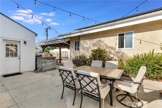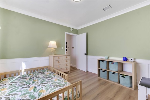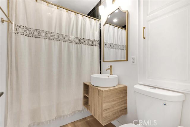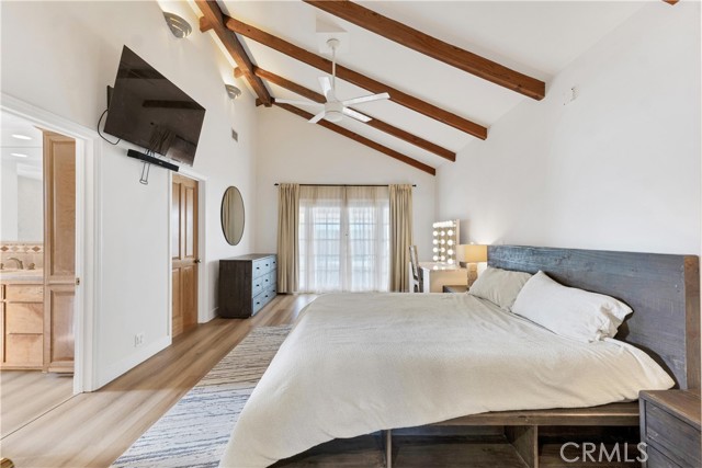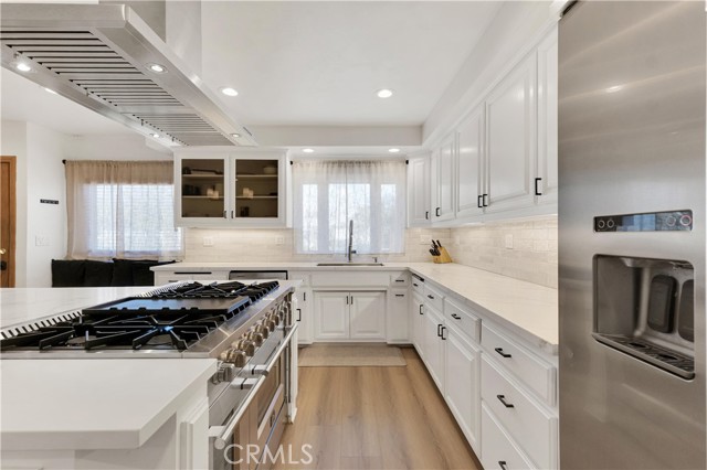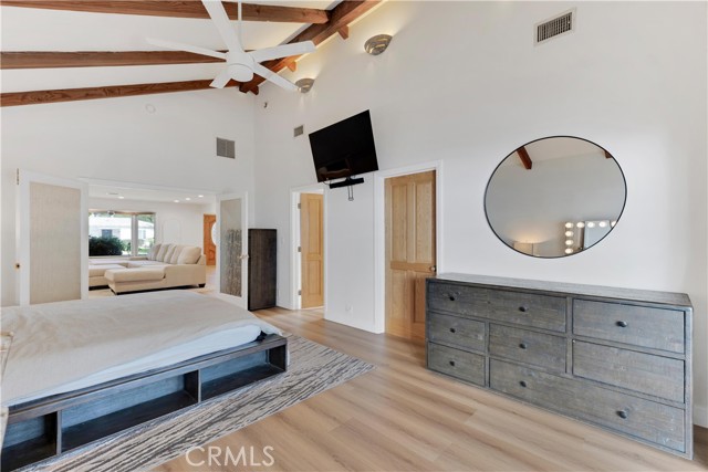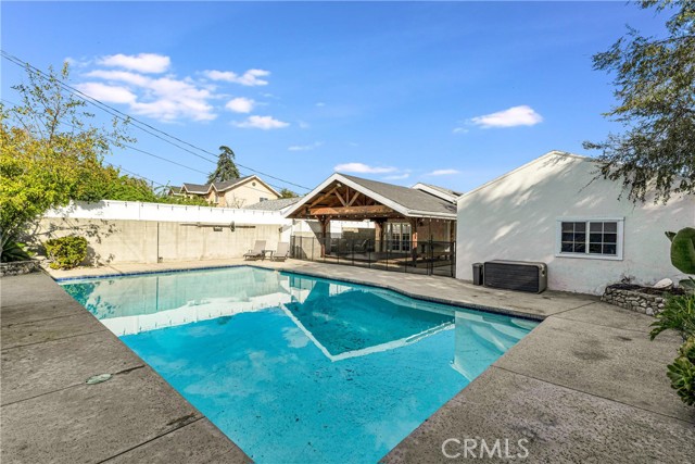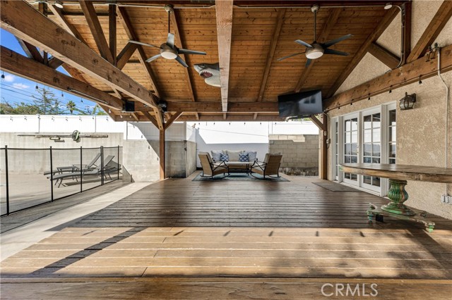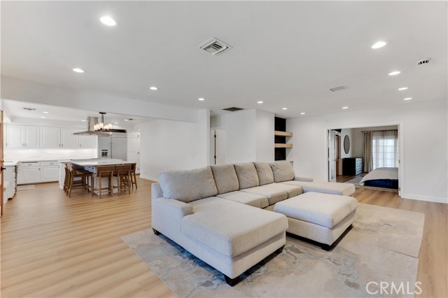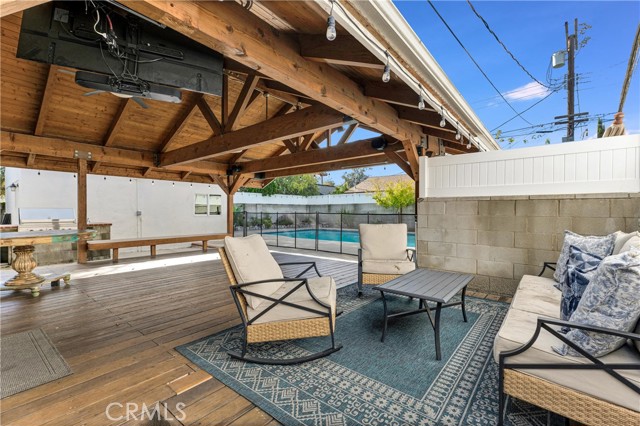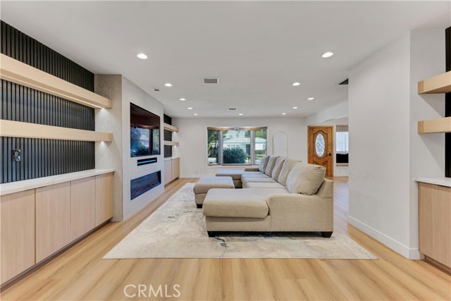 Beautifully modernized, single-story mid-century home in a highly sought-after North Hollywood neighborhood, blending classic architecture with sleek contemporary updates. Set on a quiet street with great curb appeal, the home has been updated with modern touches and clean lines, upgraded recessed lighting, custom built-ins, new toilets throughout, and luxury vinyl plank flooring. Step inside to a bright and spacious great room featuring a custom media wall with lighted floating shelves, abundant storage space, and a custom buildout with a 72” electric fireplace insert and wired niches for AV equipment. A custom bar area mirrors the media wall aesthetic and includes additional storage space. The open layout flows seamlessly into the updated kitchen, finished with crisp white quartz countertops, white subway tile backsplash, new sink and faucet, stainless-steel appliances including a brand-new 48” 8-burner gas range and hood, an 8’ center island that doubles as a bar-height dining table with adjacent built-in bench seating with storage. The primary suite offers an impressive double-door entry, high vaulted ceiling with exposed beams, a remodeled walk-in closet with built-ins, and French doors leading to the expansive back deck, along with a luxurious en-suite bath featuring a separate spa tub and shower with seating. The secondary bedroom has been refreshed with contemporary wainscoting and crown molding, while the full hall bath has been completely reimagined with a tiled shower enclosure, floating vanity, modern finishes, and new lighting. The outdoor living space is exceptional, featuring a large, covered deck with open-truss beamed ceiling, built-in BBQ area, and a unique extra-deep 11-foot pool originally designed for scuba training, complete with a pool security fence and self-closing gate. A convenient ¾ bath off the deck is perfect for outdoor entertaining or added convenience while enjoying the backyard. A garage conversion (unpermitted) provides additional flexibility as a guesthouse, studio, home gym or separated office space. Additional highlights include newer fencing and gate, drought-conscious artificial grass, and an extra-wide driveway with room for multiple vehicles and potential RV parking. Well situated close to dining, shopping, recreation, entertainment, and major commuter routes, this home offers a rare blend of mid-century character and contemporary sophistication—don’t miss out on this great property!