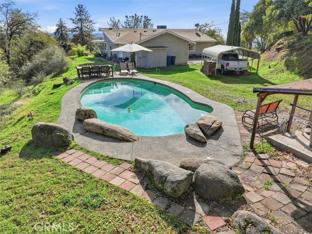 This home is sure to MAKE A SPLASH! Tucked away in the quaint town of North Fork, you’ll enjoy the quiet charm of mountain living with the convenience of Fresno just 45 minutes away, Bass Lake only 15 minutes & Yosemite National Park approximately 30 minutes from your doorstep. Nature lovers & adventure seekers will appreciate having world-class recreation nearby—yet you can easily escape the crowds & cool off right at home in your private in-ground pool. Set against a backdrop of stunning mountain views, this property flourishes with mature oak, pine, & manzanita trees, offering a serene retreat that feels worlds away from city life. The lovingly updated 3-bedroom, 2-bathroom, 1,457 sqft home showcases thoughtful touches & modern refinements throughout, including engineered hardwood flooring. Step inside to a charming teal subway-tiled foyer—a space so stylish that “darling” doesn’t begin to cover it. The original 1979 textures have been replaced with smooth, freshly painted walls & ceilings, creating a clean, contemporary feel. The inviting living room features a shiplap ceiling, recessed lighting & a free-standing woodstove, making it the perfect cozy gathering space. Just beyond, an attached sunroom offers year-round enjoyment of your scenic surroundings from the comfort of indoors. The dining area shines beneath a modern chandelier flowing seamlessly into the updated kitchen, where refinished cabinetry, corian counters & brushed-gold hardware elevate the space with a warm, modern aesthetic. Down the hall, you’ll find two guest bedrooms—each with generous closet space—and an updated guest bathroom complete with a subway-tile shower/tub combo, newer vanity, & refreshed fixtures. The spacious primary suite includes an ensuite bathroom with a tub/shower combo & a unique dual-access closet that connects the bedroom and bathroom for added convenience. Situated on 3.62 acres across two parcels (1.77 acres with the home and 1.85 acres of raw land), this property provides exceptional possibilities. The second parcel includes a cut-in road and building pad, offering the perfect opportunity for an additional home, ADU, garden, or hobby farm—while still remaining tucked away from the main residence. Additional features include hook-ups for a whole-house generator and a large water storage tank, giving you peace of mind during power outages or dry seasons. Priced to sell, and truly one-of-a-kind—don’t let this mountain oasis slip away. Schedule your showing today!