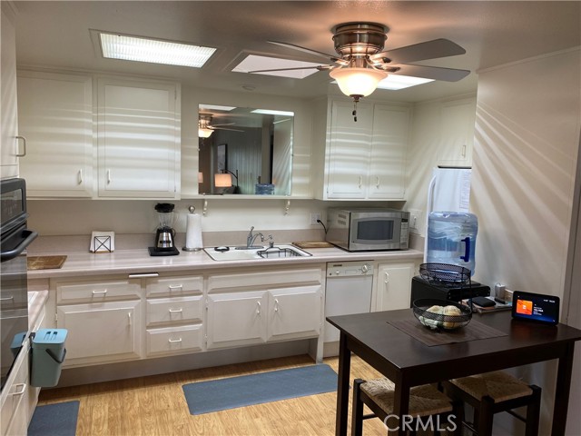 Welcome to this light, comfortable, and well-kept Mutual 9, 2-bedroom / 1-bath home overlooking a peaceful greenbelt and ideally situated near the carport. This unit offers an inviting combination of upgrades, storage, and outdoor living space that makes daily life easy and enjoyable inside Leisure World Seal Beach. Inside, the home features vaulted ceilings, multiple skylights in the kitchen and bathroom, and a split A/C–heat system for year-round comfort. The kitchen is open and functional with abundant cabinetry, a pantry, and a clean, neutral color palette. The adjacent living area opens to a large front patio with floor-to-ceiling windows, providing an ideal indoor–outdoor flow and a perfect spot for morning coffee or afternoon breezes. Both bedrooms are generously sized, and the unit includes excellent storage throughout, plus a dishwasher, newer lighting, and easy-care wood laminate flooring. The patio includes additional storage and overlooks a quiet greenbelt near the back of the community. A great location, a great layout, and a welcoming outdoor setting—this home is clean, bright, and ready for its next owner to add their personal touch. Mutual 9 (Carport 113, Space 14) SENIOR COMMUNITY-OFFERS THE FOLLOWING AMENITIES: 9 Hole Golf Course, Swimming Pool, Jacuzzi, Gym, Table Tennis, Shuffle Board, Billiards, Pickle Ball, and Bocce Ball courts. Amphitheater, 6 Clubhouses featuring: Art Room, Sewing, Crafts, Wood Shops, Lapidary, Pool Tables, Over 200 Clubs, LWSB is a Security-Guard-Gated Community. Also Library, Friends of Library Bookstore, Credit Union, Health Care Center, Pharmacy and Post Office.