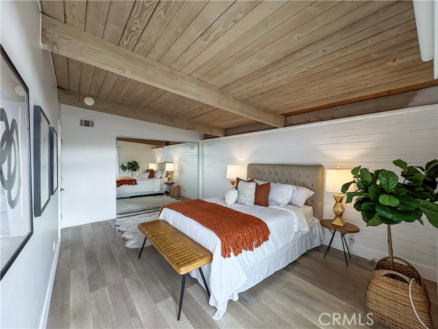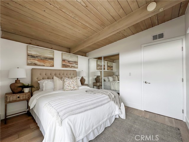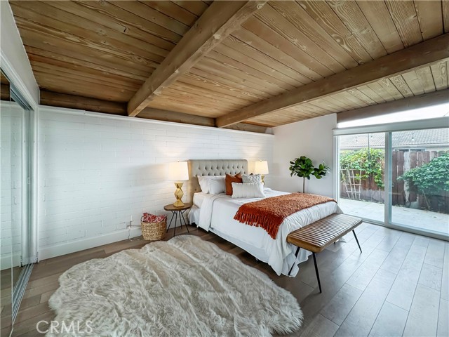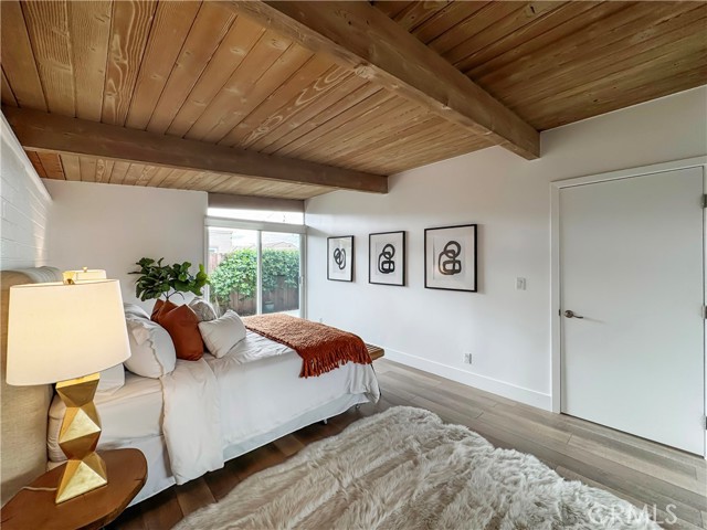 Located just a quarter mile from the beach, this charming mid-century modern bungalow is nestled in the highly sought-after Vista Del Gado community. With only 54 residences designed by acclaimed architect Chris Abel, the neighborhood seamlessly blends timeless architecture with a quintessential beach lifestyle. Residents can easily access San Clemente or Dana Point via the paved path along PCH, offering convenient access to beaches, dining, coffee shops, and nightlife. This turnkey 912 sqft bungalow has been remodeled with many upgrades. Enter through the gate to a spacious front patio perfect for lounging and easy entertaining, with views of the neighborhood and distant mountains. Indoor/outdoor living is easy through the French doors into the thoughtfully designed home which boasts beamed ceilings with dark accents, true to mid-century modernist architecture and creating a “floating” effect in the structure. A light and bright kitchen opens to the main living area with abundant storage space in custom cabinetry, a large peninsula with bar seating, quartz counters, and stainless appliances. The generously-sized primary bedroom, warmed by an accent brick wall, leads to a private back patio with composite decking. The secondary bedroom also shares back deck access through a sliding door. The full remodeled bathroom features dual vanities, and tasteful updates throughout. Other property offerings include central air conditioning (uncommon in this neighborhood), cool roof, luxury vinyl flooring throughout, dual-paned windows and doors, upgraded electrical panel, and a detached 1-car garage closeby. Opportunities to own in this community are more than rare, making this offering a unique chance to own a mid-century timepiece in a community just steps away from all the treasures that San Clemente has to offer