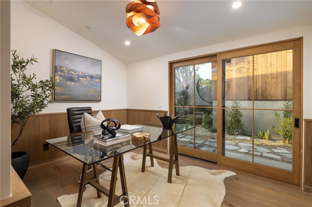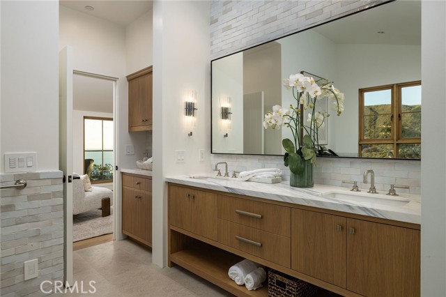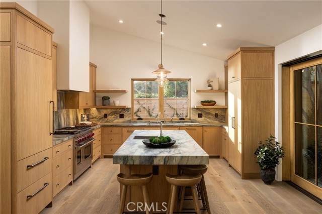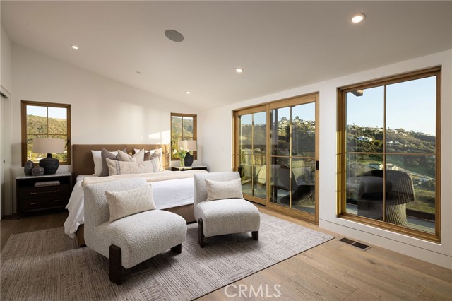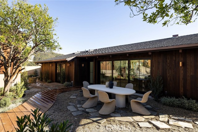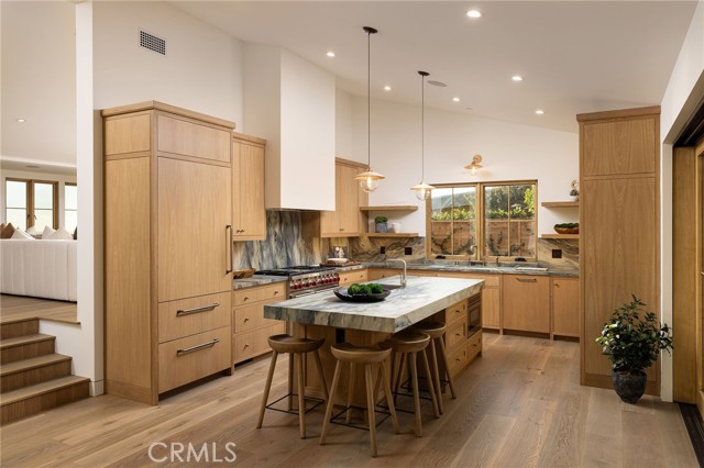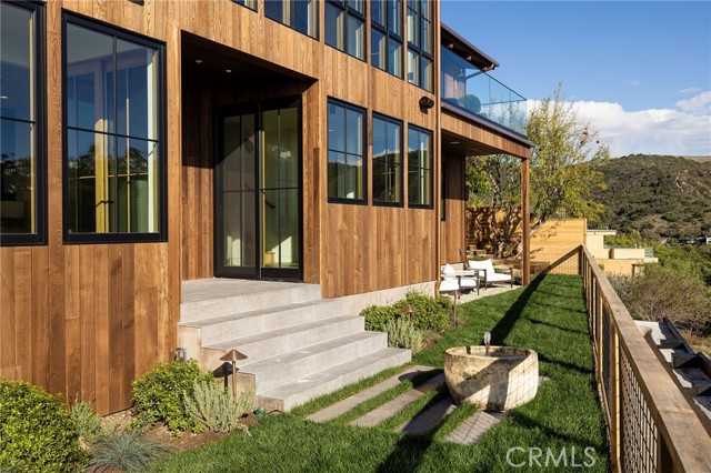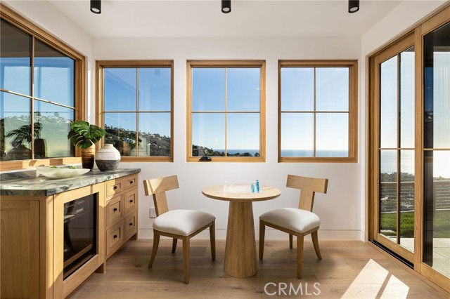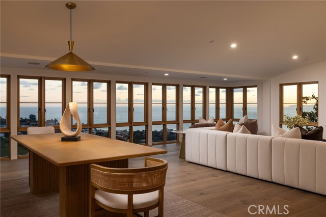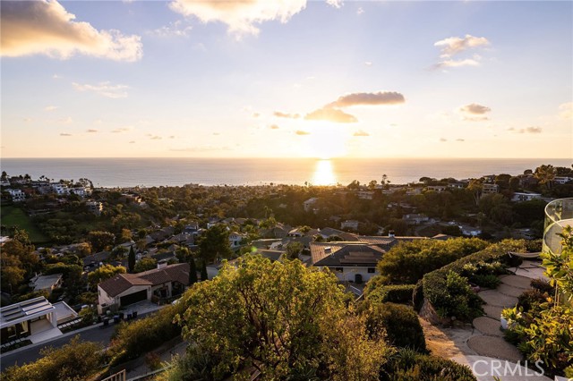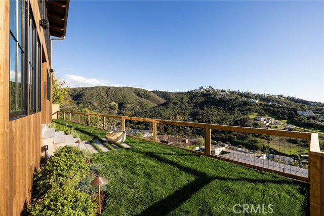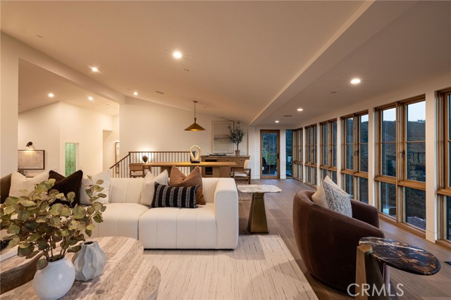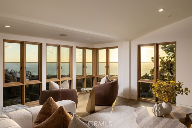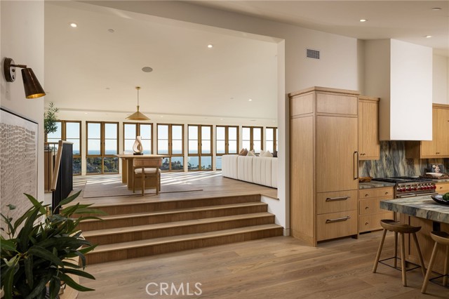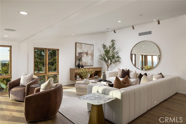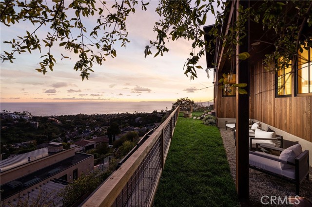 Truly a piece of art. Perched on a secluded hilltop cul-de-sac, this newly completed coastal residence captures sweeping 180-degree ocean, coastline, Catalina, and rolling-hill views across approximately 2,897 square feet of thoughtfully crafted living space. Set on a 7,410 SF parcel, the 4-bedroom, 4-bath redesign was created in collaboration with architect Marshall Innis, designer Andra Miller, and builder RLB. Glassed entry doors open to an elevated great room ideal for ocean-view lounging, dining, and taking in sunset tranquility over Catalina Island. The professional chef’s kitchen features a striking quartzite fusion island, Sub-Zero wood-clad refrigerator, 48" Wolf range, and inset white-oak cabinetry. Fifteen-foot La Cantina doors connect seamlessly to an expansive courtyard with al fresco dining, BBQ center, flagstone paths, fountain, specimen trees, private alcoves, and lush professional landscaping—indoor-outdoor living at its finest. The spacious ocean-view dining area with Sub-Zero wine bar leads to a generous view deck. This level also includes a flexible bedroom/den and a private primary suite with deck access, sitting area, large bath with separate shower and tub, and walk-in closet. A sea-green Zellige tile bath and laundry room complete the main level. An open staircase descends to a warm, versatile lower level offering a family/office nook, separate media lounge, ensuite bedroom with 3/4 bath, additional bedroom, another 3/4 bath, and a dedicated yoga/meditation room wrapped in glass and tranquil views. Finishes include wide-plank oak flooring, Zellige tile, Sierra Pacific doors and windows, white-oak cabinetry, Sonos sound, central heat and AC, tankless water heater, security system, fire sprinklers, and high-end details throughout. Outdoor access continues with a spacious lower grass yard featuring a stone fountain, outdoor shower, flagstone, copper accents, and three private sitting retreats—each capturing peaceful ocean and hillside vistas. The oversized driveway accommodates six cars, while the two-car garage includes an EV charger and potential for an ADU. Positioned just minutes from Laguna Beach’s pristine coastline, iconic Main Beach, Heisler Park, boutique shopping, notable galleries, fine dining, and the vibrant art district, this home offers both serene privacy and effortless access to the cultural and recreational heart of the city.