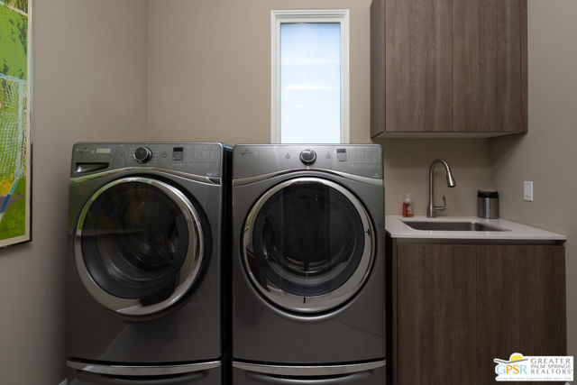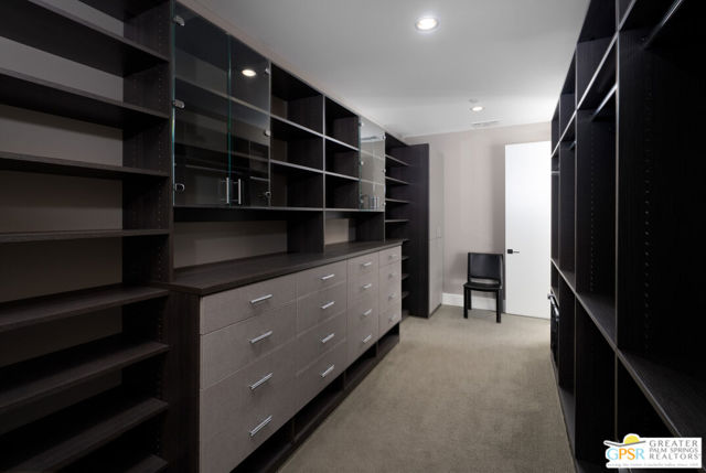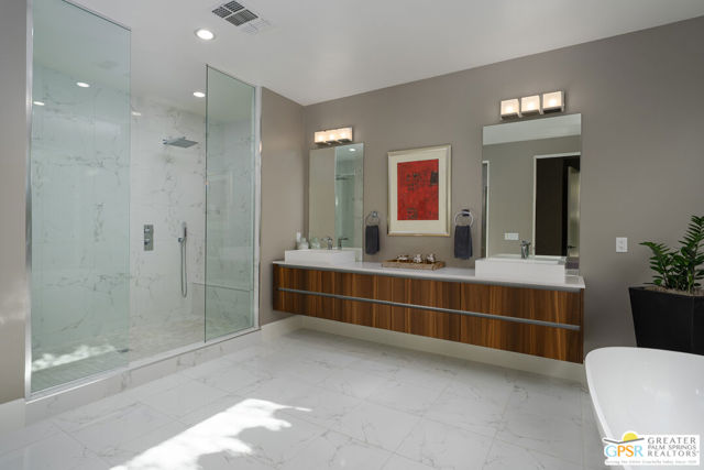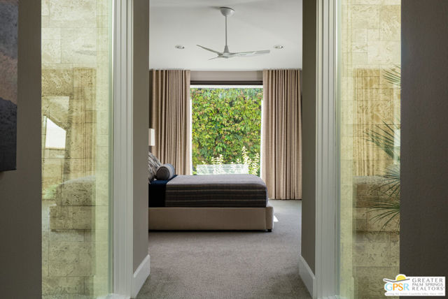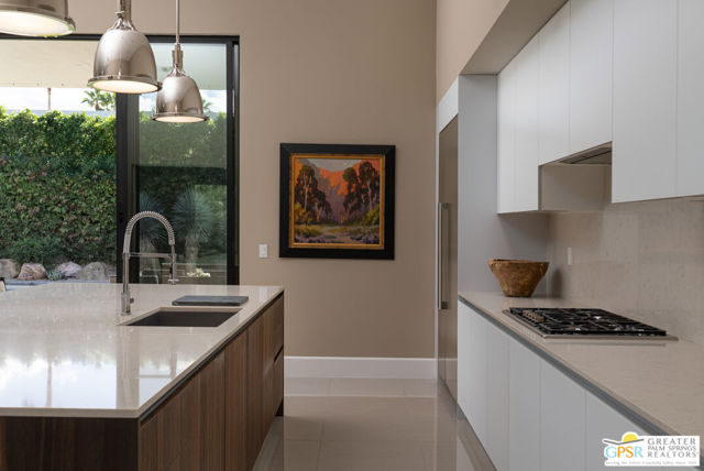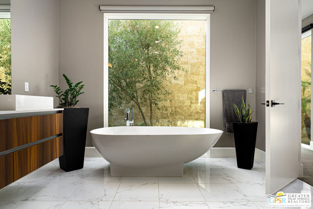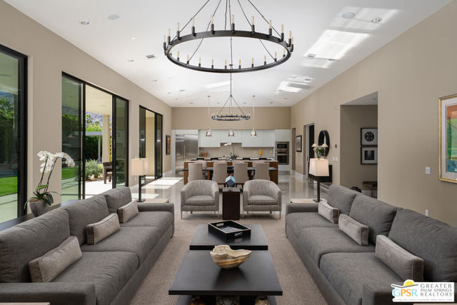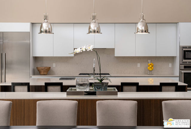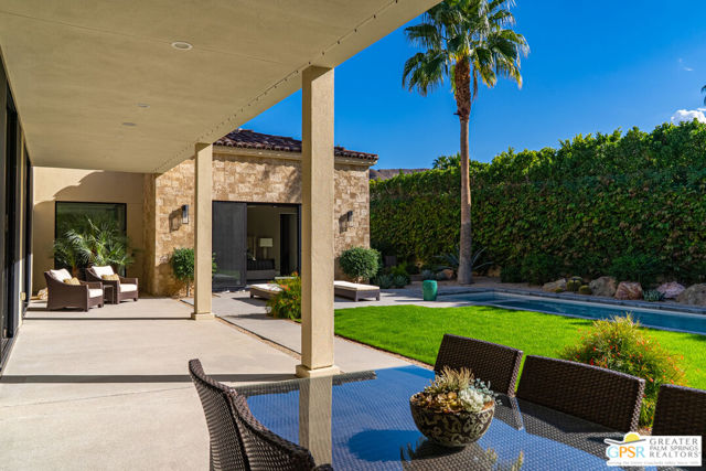 In the guard-gated community of Monte Sereno, this modern villa designed by award-winning architect Anthony Poon is a masterclass in proportion, restraint, and refined modernism. Architecture, light, and landscape come together to capture the essence of Palm Springs living at its very best. Located on fee land in South Palm Springs, the home sits on a premium south-facing lot with unobstructed western views of Mt. San Jacinto from both the pool and primary suite. Interiors by Paxton Lockwood Design of Aspen unfold in a palette of collected calm. The tremendous great room erases the boundary between indoors and out through walls of glass, centering on a sleek chef's kitchen with dual islands, premium cabinetry, high-end appliances, and designer lighting. The primary suite is a true retreat, with oversized sliders opening directly to the pool and lawn, an expansive walk-through closet, and a spa-caliber bath featuring walk-in dual shower and a freestanding tub framed by a verdant exterior landscape. Two additional generously sized ensuite bedrooms offer excellent separation and privacy for guests. Outside, an architectural pool reflects the mountain backdrop, while the pool pavilion functions as an additional lounge with fireplace, outdoor shower, and a hidden raised garden. Landscape architecture by Steve Rogers of Studio Desertscape layers native plants, boulders, and textures into a tranquil desert oasis. A rare combination of architectural pedigree, elevated interiors, and a premier location this villa represents modern desert living at its finest. Additional features include: owned solar, an air-conditioned four-car tandem garage, and oversized laundry and pantry storage.