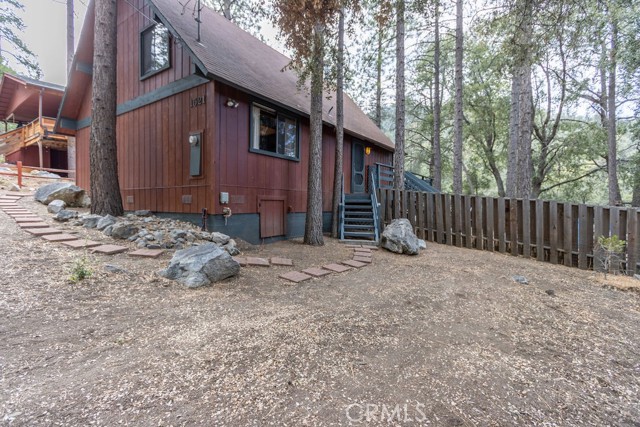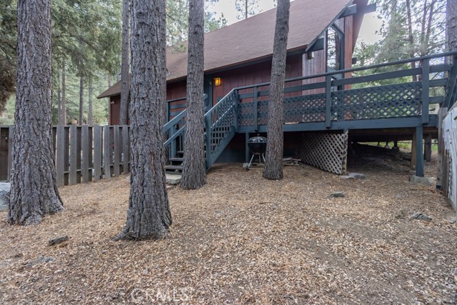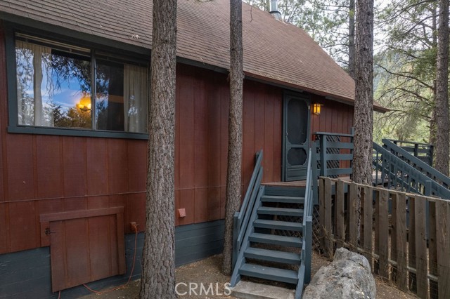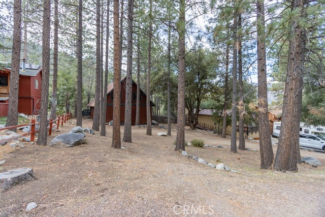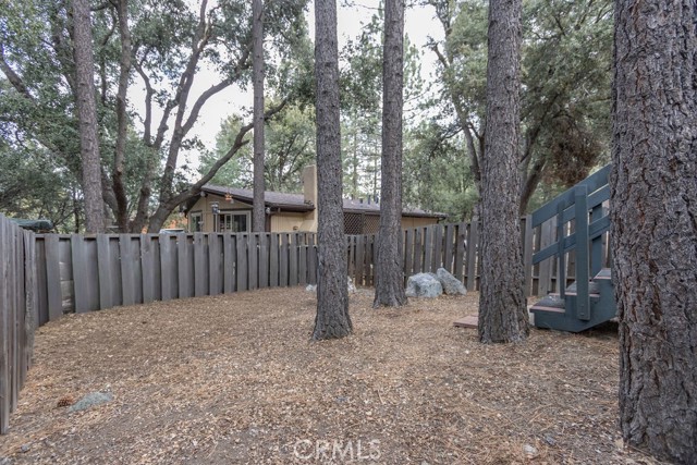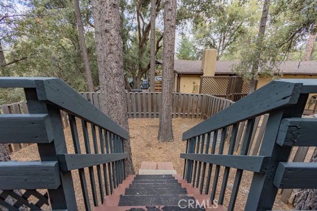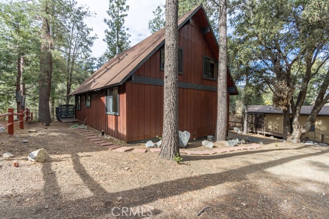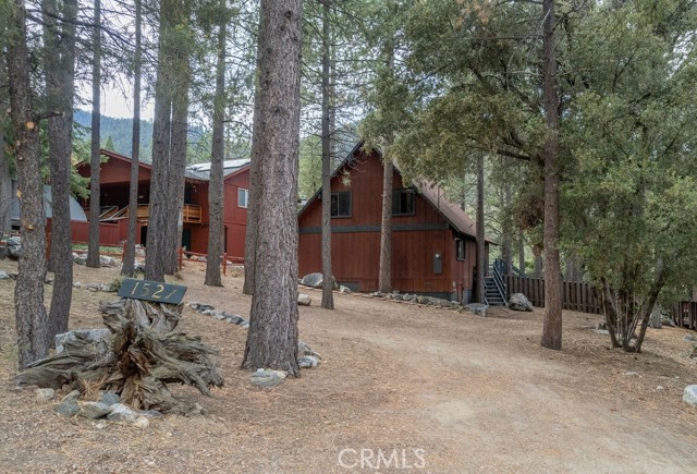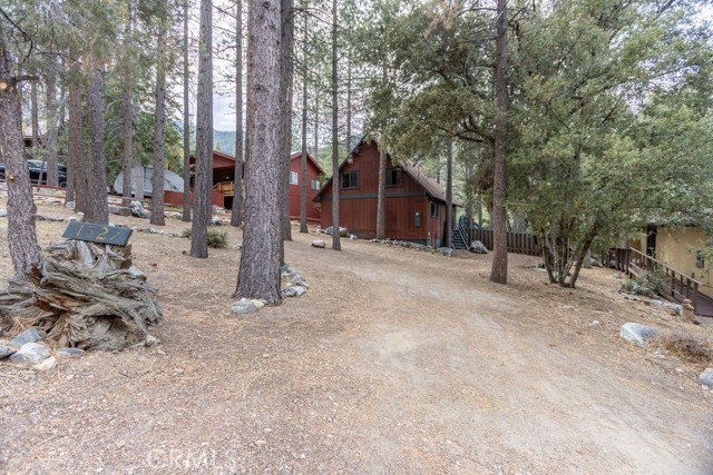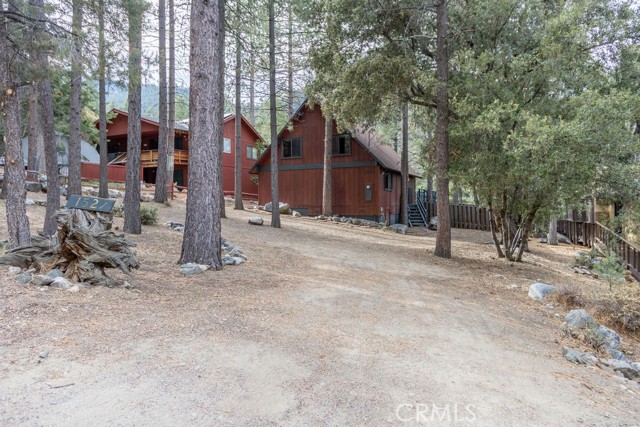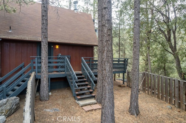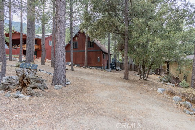 Tucked under towering pines, this 3 bedroom, 1.5 bath cabin has a two-story high great room ceiling with windows looking into the trees and two sets of sliding glass doors opening onto a deck looking into the trees. The kitchen is open to the great room. Also on the main level is a laundry closet, two bedrooms and a bath. Upstairs is an open loft which can be used as a large bedroom as well as a half bath. The slate living room floor adds a special beauty to this home. The bedrooms are carpeted and vinyl floors serve the bathrooms, kitchen and laundry closet. Outside, enjoy the flat front yard with 2 driveways and huge trees, the fenced side yard, large back deck and the green space behind the house. Look into the trees and relax. Come take a look and see if this home calls to you. Enjoy the 1973 vibe or update it as you choose. Check out the community amenities including the clubhouse, pool/spa, golf course, tennis/pickle ball courts, park, stables, hiking and riding trails and more, as well as the activities available every week. Make an appointment to see this well priced home while you still can.