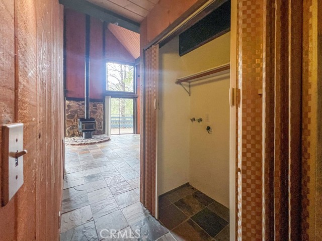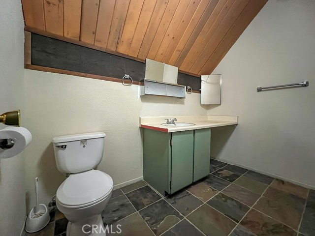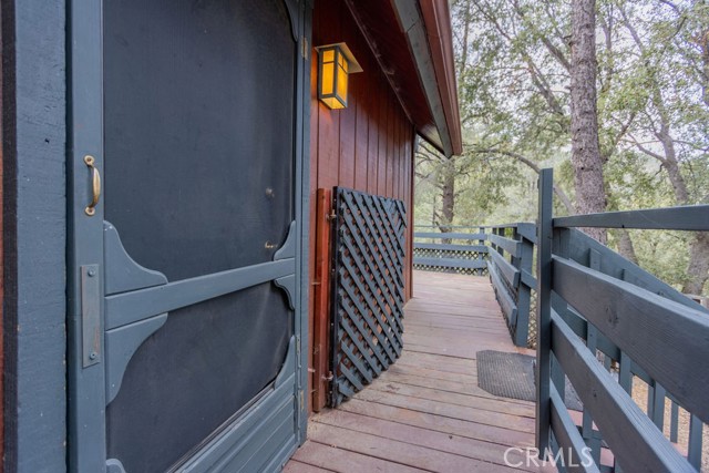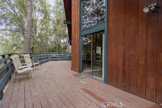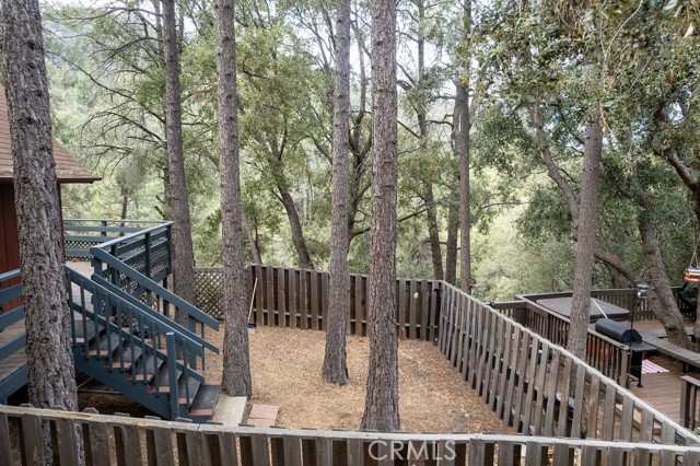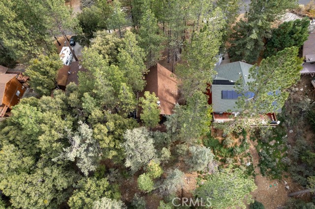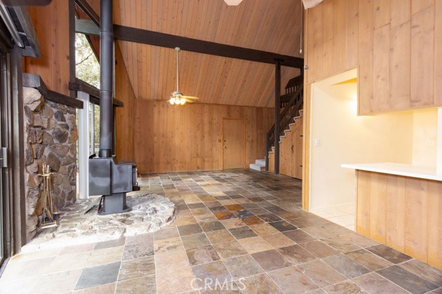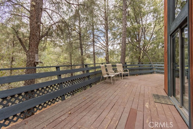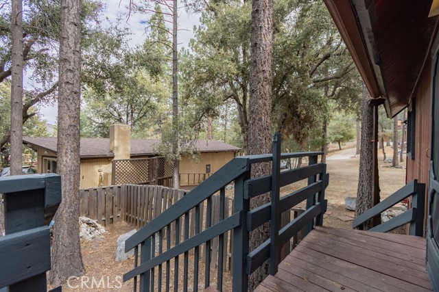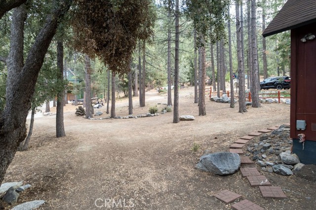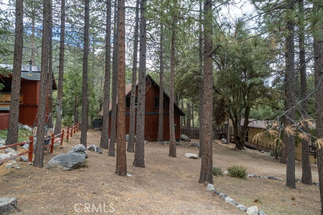 Tucked under towering pines, this 3 bedroom, 1.5 bath cabin has a two-story high great room ceiling with windows looking into the trees and two sets of sliding glass doors opening onto a deck looking into the trees. The kitchen is open to the great room. Also on the main level is a laundry closet, two bedrooms and a bath. Upstairs is an open loft which can be used as a large bedroom as well as a half bath. The slate living room floor adds a special beauty to this home. The bedrooms are carpeted and vinyl floors serve the bathrooms, kitchen and laundry closet. Outside, enjoy the flat front yard with 2 driveways and huge trees, the fenced side yard, large back deck and the green space behind the house. Look into the trees and relax. Come take a look and see if this home calls to you. Enjoy the 1973 vibe or update it as you choose. Check out the community amenities including the clubhouse, pool/spa, golf course, tennis/pickle ball courts, park, stables, hiking and riding trails and more, as well as the activities available every week. Make an appointment to see this well priced home while you still can.