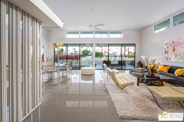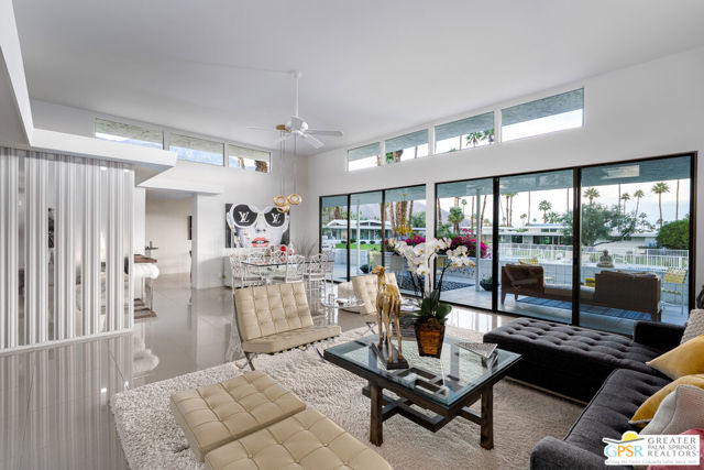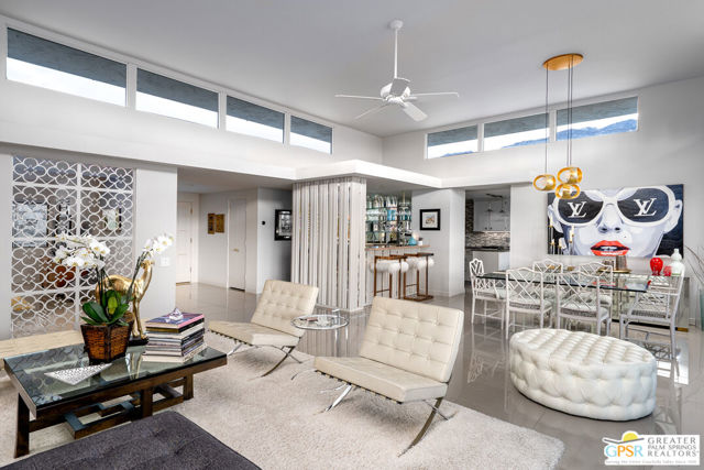 In South Palm Springs iconic Canyon Estates, this architecturally significant Charles Du Bois residence captures the best of 1970s desert modernism with clean lines, clerestory windows and seamless indoor-outdoor flow. Sited on a serene interior street, this home enjoys a north facing orientation that frames the San Jacinto mountains in full dramatic scale from the largest private patio in the community. Soft morning light, shaded afternoons, and glowing sunsets create an outdoor living experience that is unmatched in the neighborhood. Inside, the generous floor plan offers two large bedrooms, three bathrooms and a large den or office that can also become a bedroom, providing excellent flexibility for modern living. The expansive great room encompasses the living room, dining room, and a chic full-size wet bar all opening through walls of glass to the terrace, drawing the mountain views directly into the home. The kitchen and breakfast room elegantly respect the original plans of the architect and open onto the terrace as well. The primary suite is generously proportioned with an oversized bath, dressing area, multiple closets and direct access to the terrace, offering mountain views from the moment you wake up. Canyon Estates offers a true resort style living experience with an executive nine-hole golf course, fifteen pools, twelve spas, a clubhouse, fitness room and tennis courts. HOA dues of $925 per month include exterior landscape, exterior building insurance, exterior paint, pest control, premium cable and internet. The community sits just minutes from Indian Canyons and Andreas Hills, providing immediate access to some of Palm Springs most beautiful hiking trails and natural preserves while being just minutes from downtown's shopping, dining, and entertainment. Balancing architectural pedigree, expansive outdoor living and a premier South Palm Springs location, 2324 Camino Vida is a unique and timeless offering.