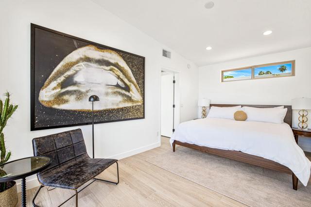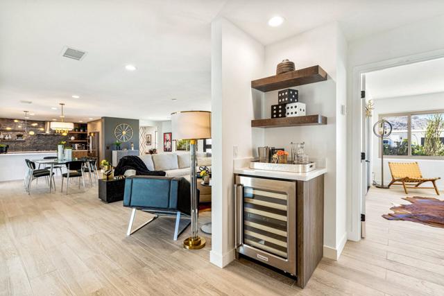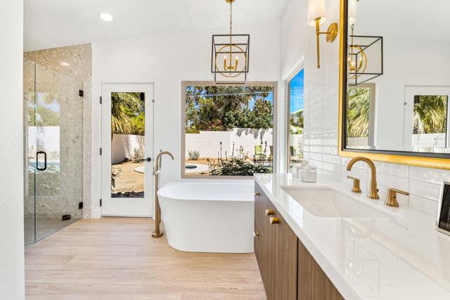 Fully renovated from top to bottom! Location- steps away from El Paseo! Great seasonal rental income! Delight in Mid-Century Ranch architecture on this expansive .35 acres with stylish updates, separate CASITA, and just 2 short blocks from El Paseo in desirable south Palm Desert. This newly remodeled 1950 MCM with NEW pool & spa plus NEW A/C has three private bedrooms including the poolside Casita, open concept great room, bonus room/study, & chefs kitchen with professional grade appliances, floating shelves & white marble waterfall countertop. Retreat to the primary bedroom with sitting area, walk-in closet & recessed lighting. Primary bath is completely Renovated with modern finishes & boasts double vanity, soaking tub & shower with direct access to pool & spa. The great room features gas-burning fireplace with modern tile design, new tile flooring & mountain views.Connected by a breezeway, the newly added Casita is en-suite with poolside views & offers the luxurious finishes of the main home, while the oversized garage has epoxy floors & additional parking in the drive for RV and more. Outside, enjoy heated pool & spa, large lounge area & covered dining all nestled in the private landscaped desert gardens. The perfect location for your desert getaway.
