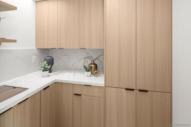 Welcome to a stunning, fully remodeled home showcasing classic mid-century architecture just moments from the sand in North Pacific Beach. This residence blends iconic design with modern luxury, offering an elevated coastal lifestyle in one of San Diego’s most desirable beach communities. The heart of the home features a gorgeous designer kitchen with a large waterfall island, sleek custom cabinetry, statement backsplash, and premium finishes throughout. Just off the kitchen is a beautifully appointed butler’s pantry with its own sink, ideal for prep, storage, and entertaining, along with a custom floor-to-ceiling built-in hutch complete with a wine fridge, creating the perfect space for display and hosting. The primary suite is a true retreat, showcasing breathtaking views of Mission Bay to the downtown skyline — views you can enjoy directly from bed. The spa-inspired primary bathroom features custom vanities, exquisite tilework, and a spacious walk-in closet with beautiful built-ins designed for both style and organization. Step outside into your private resort-style backyard, finished with travertine stone throughout, a sparkling pool, and a built-in BBQ and bar area, perfect for entertaining or relaxing in true Southern California fashion. Two additional bedrooms are generously sized, each offering custom-built closets, designer lighting, curated modern finishes, and seamless indoor-outdoor living.