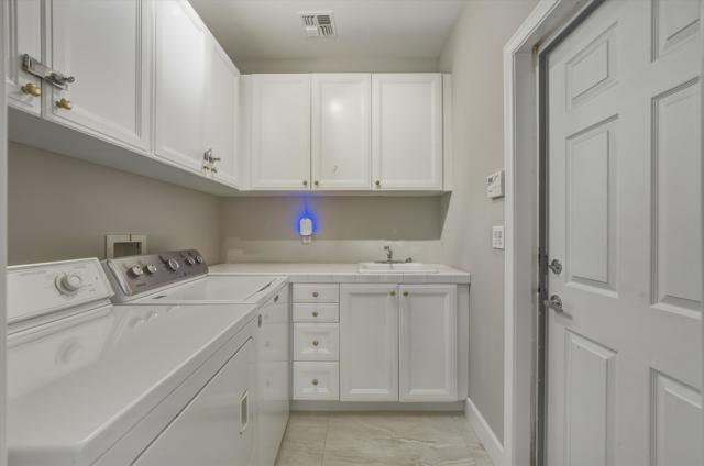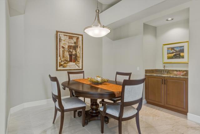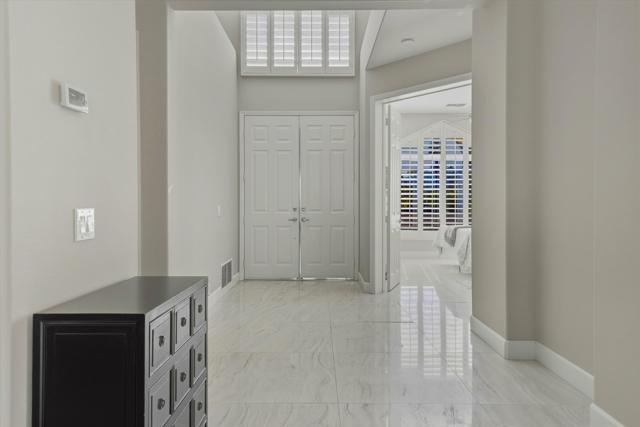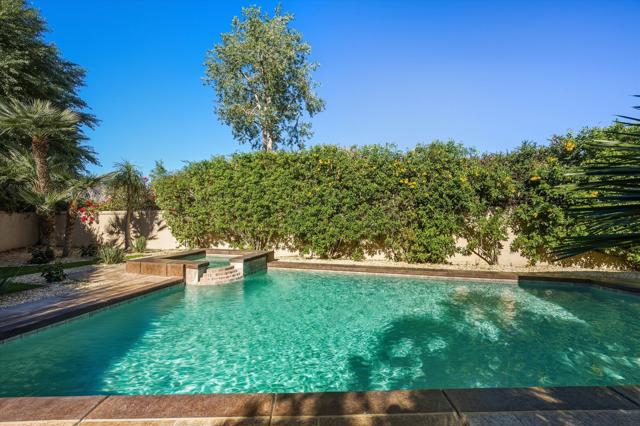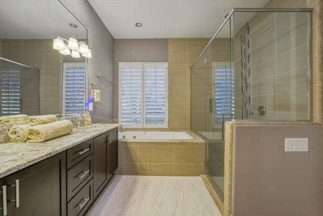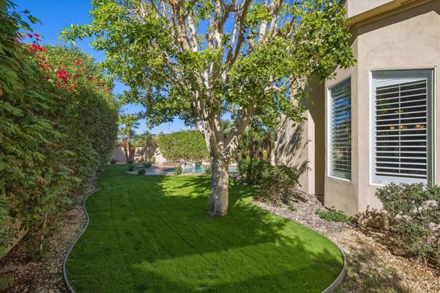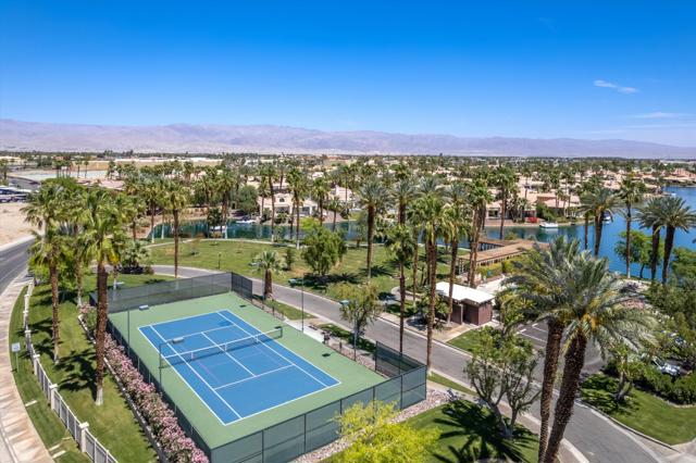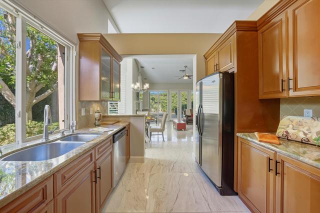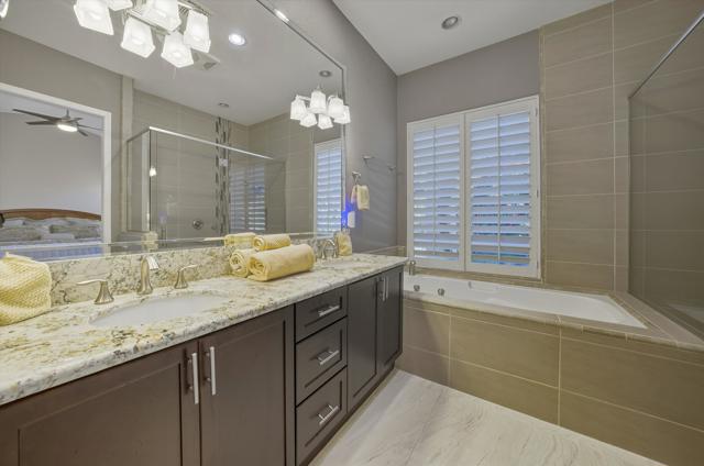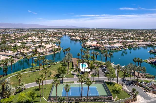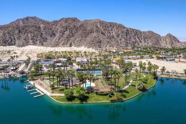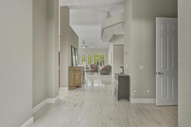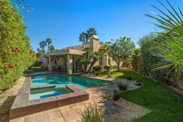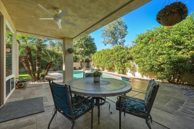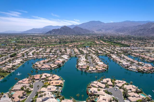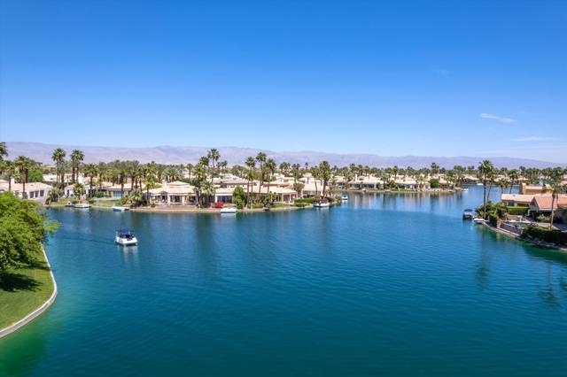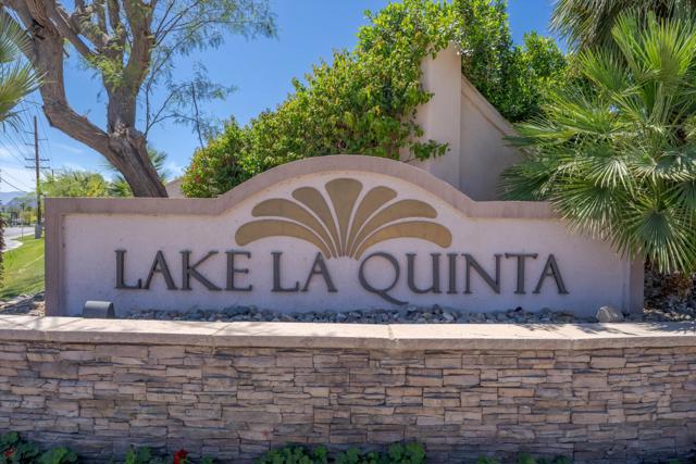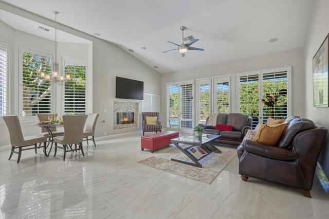 Welcome to Lake La Quinta, a resort style security gated community surrounded by a 25 acre lake for boating and fishing. This 3 bedroom, 3 bath open concept floor plan is designed for entertaining, with the great room opening to the pool, spa and lush park like landscaping, perfect for a family with pets to romp around. Soaring ceilings and 20 x 20 cream porcelain tile floors throughout create a clean neutral palate, for many personal design looks. The 3 upgraded en-suites are located on separate wings for privacy. The kitchen has granite counters and stainless steel appliances and has access to the breakfast nook and great room with a fireplace for chilly desert winter evenings. Crisp,quality plantation shutters throughout all windows and French doors, give the home a contemporary finished look. The dining area is separate but open to the great room with a convenient dry bar for serving. The back bedroom is furnished as an office however it can function as a 3rd bedroom suite and includes a wall of closets. Landscaping front, sides and backyard have been neatly refurbished including professional pruning of all the trees. The pool is being maintained to perfection as well. Lake La Quinta is conveniently located to Trader Joe's,, Sprouts, and many retail shops and restaurants. A park pavilion hosts many community events and offers tennis, pickleball, bocce ball and a community heated pool. Cable, internet and 24 hour security are included in the HOA dues. This property is priced to sell and easy to show.