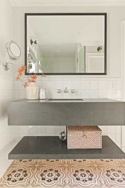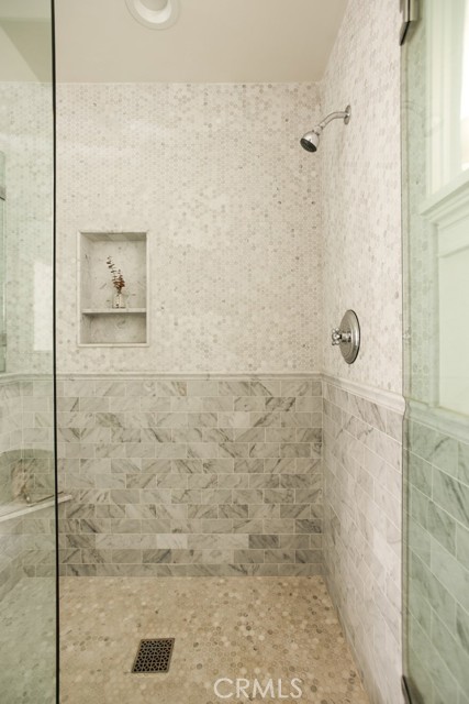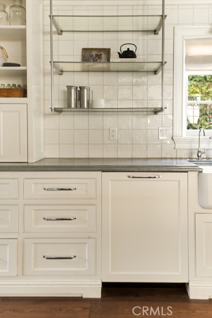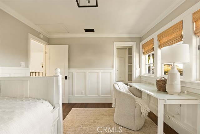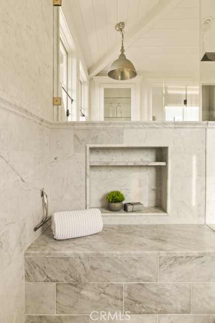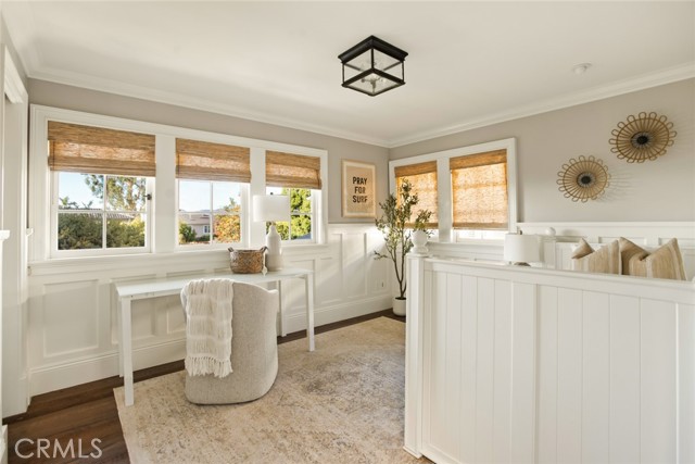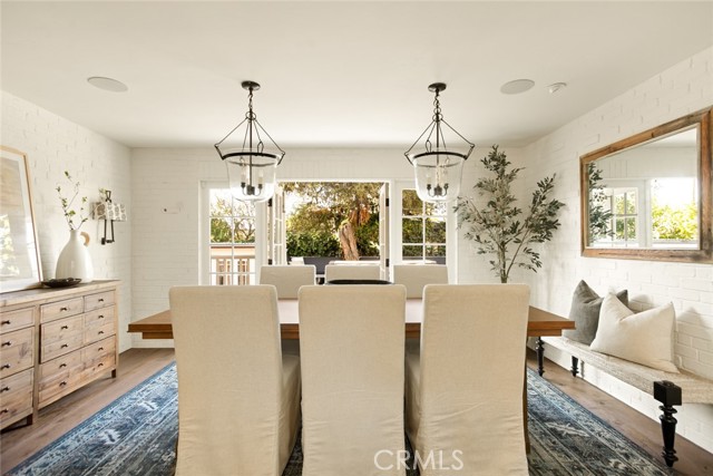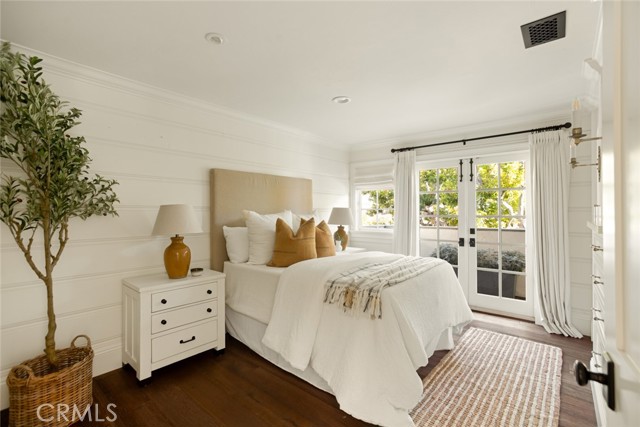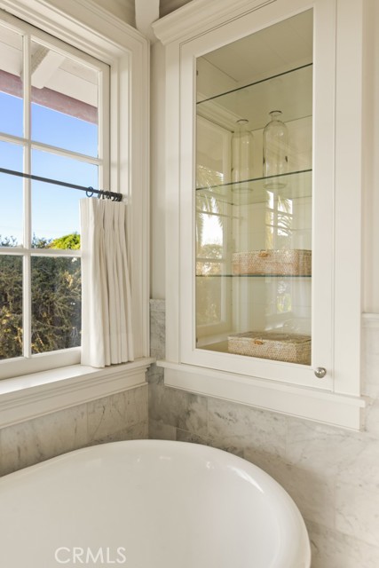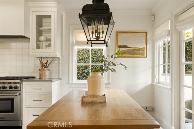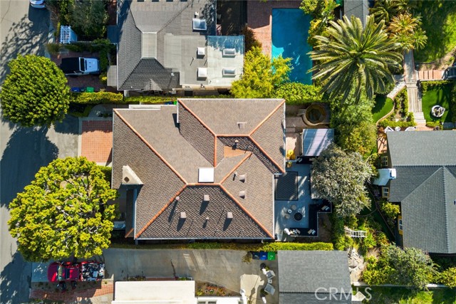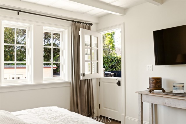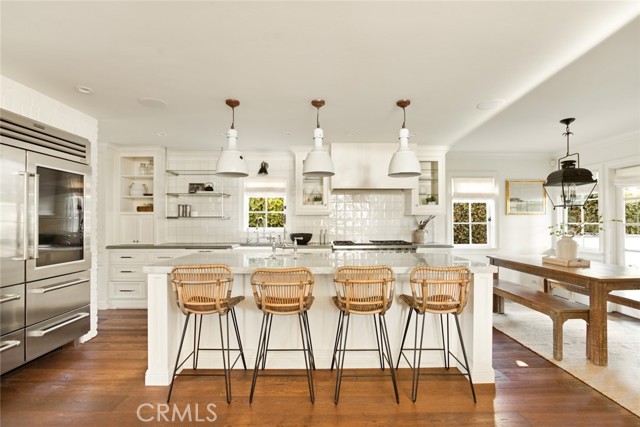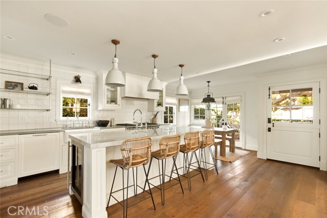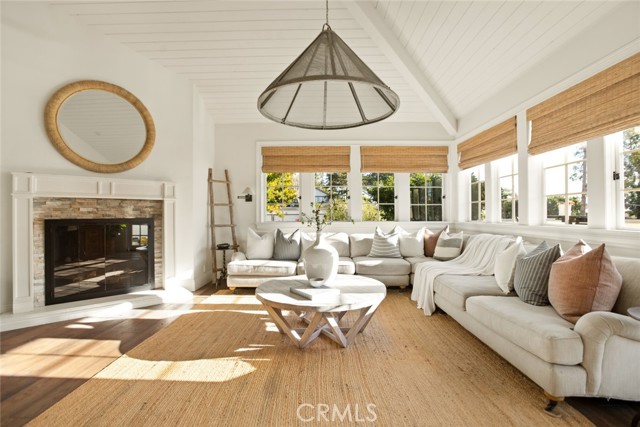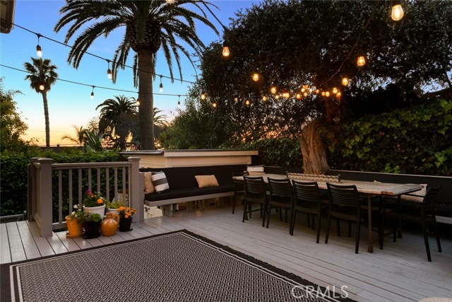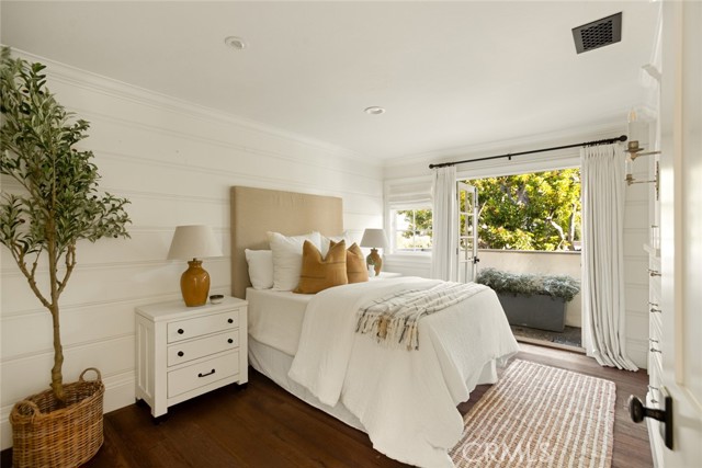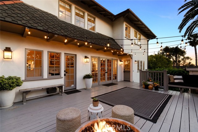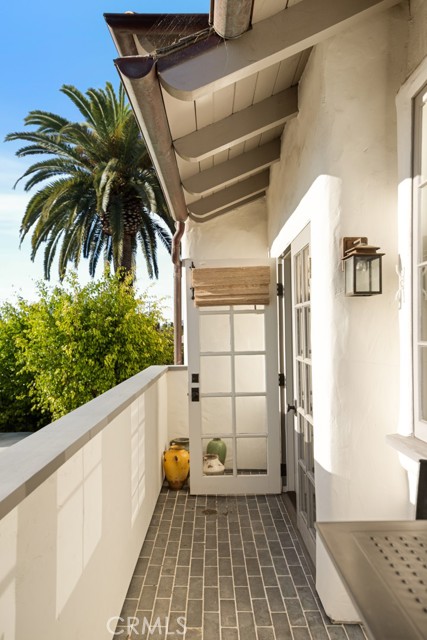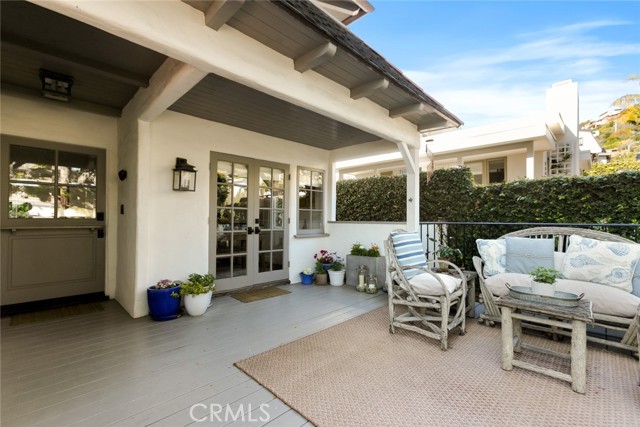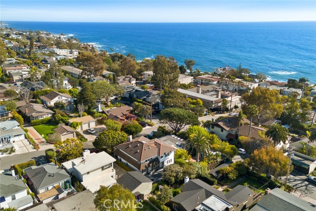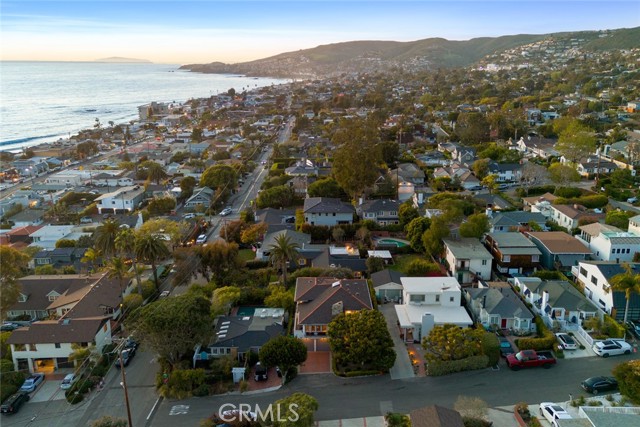 Just three blocks from the sands of Laguna Beach's gorgeous Woods Cove, this ocean-view coastal cottage-inspired home blends luxury, elegance and a touch of classic European flair. Remodeled by award-winning local designer Andra Miller, the custom residence showcases beautiful views of the Pacific Ocean and Laguna Beach coastline from indoor and outdoor living spaces, which easily flow from one to the other through glass doors leading to private patios and sunny balconies. Impressively sized at approximately 2,762 square feet, the four-bedroom, three- and one-half-bath design elevates open-concept living with a split-level main floor. A Dutch entry door welcomes friends and neighbors to a family room with corner fireplace, vaulted ceiling and an ocean-view balcony. High ceilings continue in a double-height foyer that showcases a skylight, elegant staircase and an built-in under-stairs office niche with desk. The foyer seamlessly transitions to a formal dining room that opens to the backyard and a phenomenal designer kitchen with a nook leading to a covered front porch. Enjoy top-of-the-line stainless steel appliances that include a six-burner Wolf range with griddle, and a Sub-Zero refrigerator that boasts a glass door and convenient drawers. An island topped with Carrara marble includes bar seating, an under-counter beverage refrigerator and a prep sink, and zinc countertops, white cabinetry with glass uppers, open shelving, farm sink and a full tile backsplash complete a truly stunning culinary showplace. Traditional and contemporary details are led by high open-beam tongue-and-groove ceilings, extensive custom built-ins in bedrooms and living areas, wide-plank French oak flooring, elegant crown molding and wainscoting, white-paneled walls, marble-finished baths, designer floor tile, in-ceiling speakers, and classic lighting fixtures including antique European pendants. Guests will appreciate a main-level suite that opens to the backyard, an upstairs secondary bedroom that presents an ocean-view balcony, and the refined primary suite displays ocean views and a walk-in closet. Pacific vistas continue in the primary bath, which shines with a freestanding cast-iron sink, brick floor, two sinks and a frameless glass-enclosed multi-head shower. A towering shade tree enhances the private front-yard patio, and the backyard features a spacious deck, built-in seating, spa, and a versatile artist shed. Restaurants, galleries and shops are just down the street.