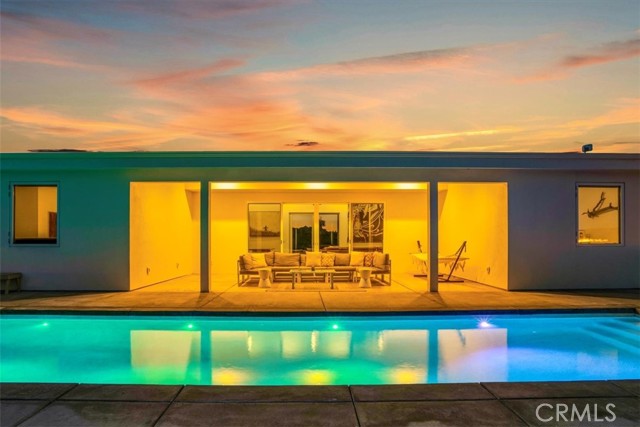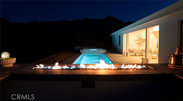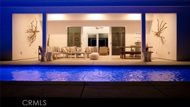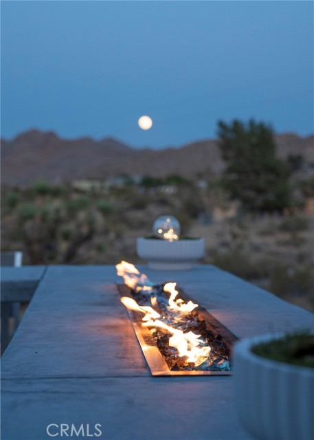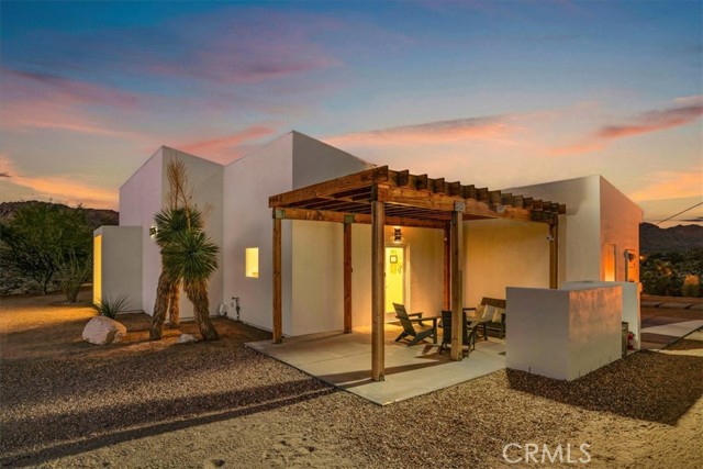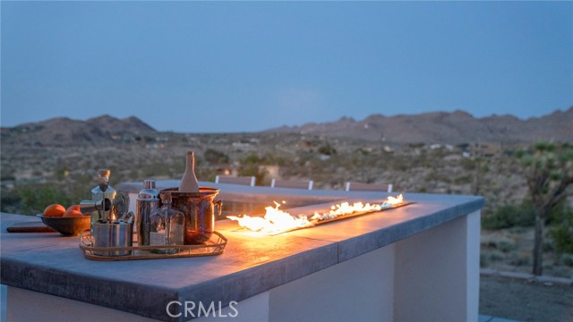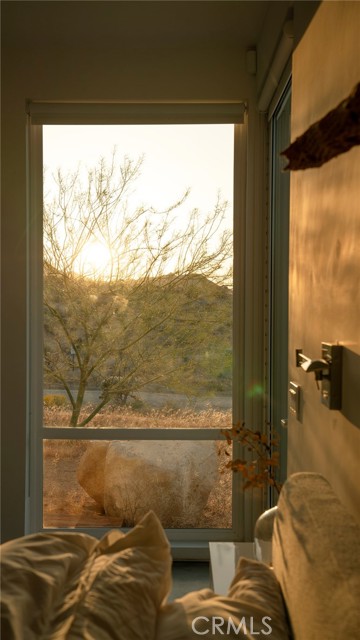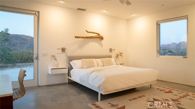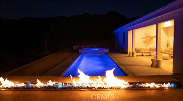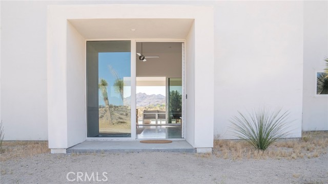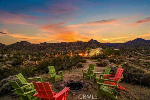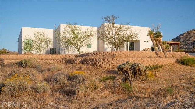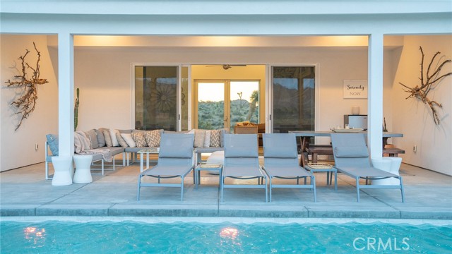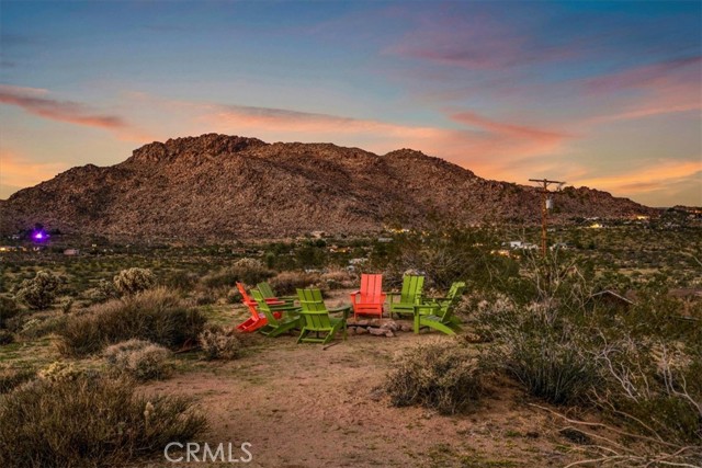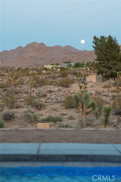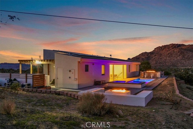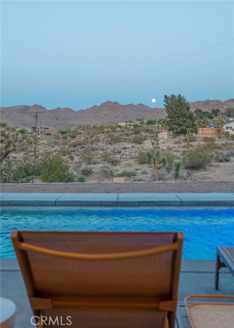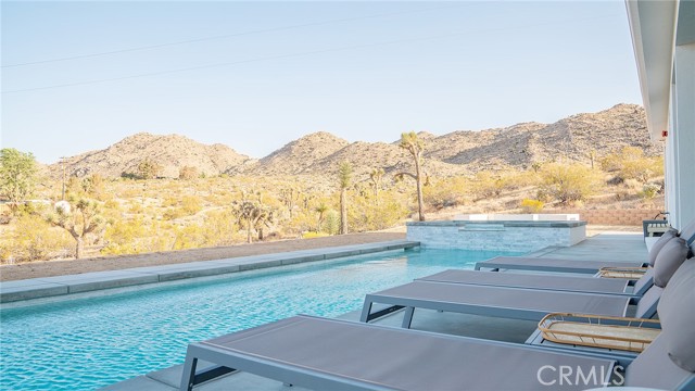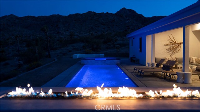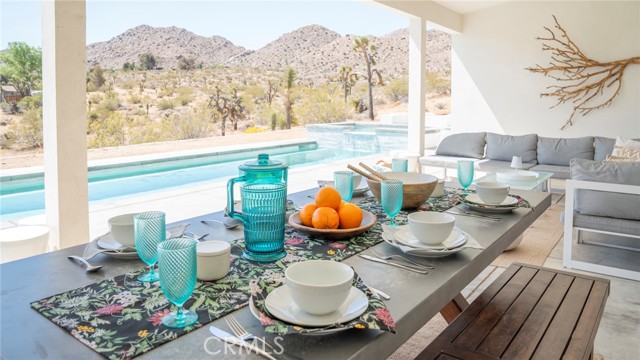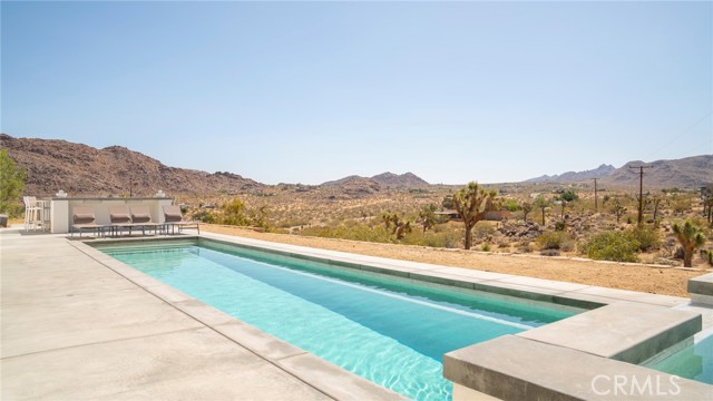 Set against the stunning backdrop of Joshua Tree National Park, this fully furnished 3-bedroom, 2-bath home is a rare offering in highly sought-after Monument Manor. Built in 2017 and thoughtfully designed with the modern desert dweller in mind, the home offers 1,806 square feet of contemporary living space nestled among rolling hills and lush, natural landscaping. From the moment you arrive, you’ll be struck by the property's serene seclusion and panoramic views, which frame the dramatic desert terrain in every direction. The landscaping is a work of art, featuring native species such as mesquite trees, yuccas, Joshua trees, ocotillos, acacia, and palo verde—all enhancing the sense of harmony with the natural surroundings. Inside, the home showcases sleek concrete floors, soaring ceilings, and 8-foot exterior doors that invite light and air throughout the open-concept floor plan. The expansive living and dining areas flow effortlessly into a custom-designed kitchen equipped with high-end Bosch appliances, an induction cooktop, a water filtration system, and custom cabinetry tailored for those who love to cook and entertain. Every detail has been considered for both luxury and functionality. The bedrooms are generously sized, while the bathrooms feature tasteful, high-end finishes and thoughtful design touches. Climate control is handled by a Nest-managed central HVAC system, and the home is powered by paid solar, making it fully electric and energy-efficient. Stepping outside, the property transforms into your own private resort. A custom in-ground pool and spa create the perfect setting to cool off or unwind under the stars. The outdoor bar, built-in firepit, and multiple patios and lounge areas provide ideal spaces for hosting gatherings, enjoying peaceful sunsets, or simply soaking in the tranquil atmosphere. While the property offers an exceptional sense of privacy and escape, it also functions as a permitted short-term rental, delivering strong investment potential. With its combination of luxury, thoughtful design, and unparalleled location, this is more than a home—it’s a lifestyle. Whether you're searching for a high-end vacation rental, a personal retreat, or a forever home, this extraordinary Monument Manor property offers it all.