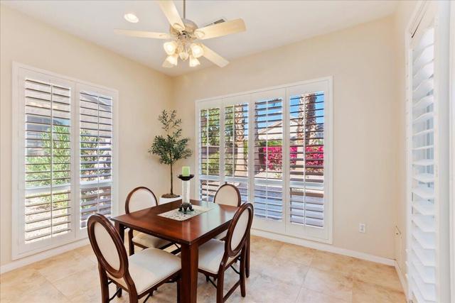 Beautifully appointed **MONACO ESTATE MODEL** located on an oversized corner lot in Sun City Palm Desert, just a short distance from the Sunset View Clubhouse. A private gated front courtyard leads to elegant double leaded-glass entry doors. Inside, the foyer and great room impress with 12 ft. ceilings, recessed lighting, and a double slider that opens to the north-facing backyard featuring multiple seating areas, a built-in BBQ, gorgeous desert landscaping, and peek-a-boo mountain views.The beautifully updated kitchen offers granite countertops, new stainless steel appliances, a large island with breakfast bar, pendant and under-cabinet lighting, and a skylight that fills the space with natural light. The adjoining family room includes a custom built-in media center, plantation shutters and recessed lighting. Tile flooring is throughout the main living areas, with carpeting in the bedrooms.The spacious primary suite features a bay-window slider opening to the backyard, a large walk-in closet with custom storage, dual-sink vanity, seated makeup vanity, spa tub, and bidet. The extended first guest suite includes plantation shutters and an ensuite bath with a stall shower. A second guest suite also offers shutters and an ensuite bath with a shower/tub combination.Additional features include dual A/C units with electronic air filtration, a recirculating hot water pump, and an extended laundry room with abundant cabinetry and a utility sink. The extended 2-car plus golf cart garage provides extensive cabinetry, overhead hanging storage, and its own dedicated A/C.