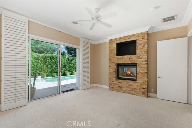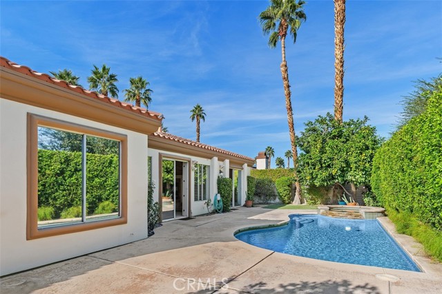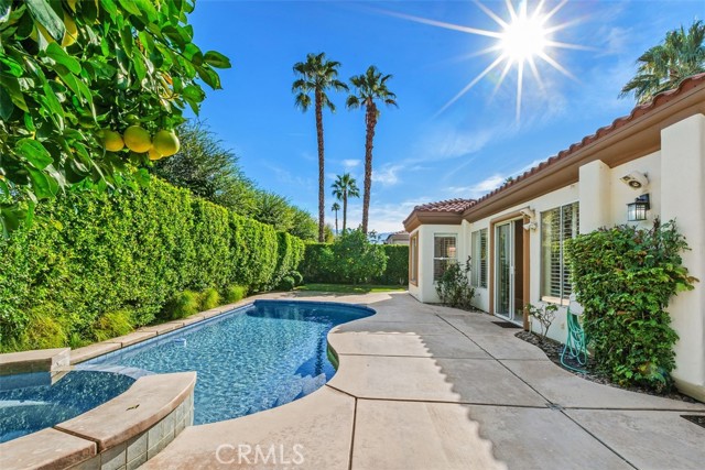 Welcome to the epitome of Indian Wells living! Discover this well designed 4-bedroom, 3-bathroom, approximately 2700 square foot single-story home, perfectly nestled in a quaint, charming gated community. Just minutes away from an array of shops, restaurants, the famous El Paseo shopping district, golf courses and hiking trails, this location offers the perfect blend of tranquility and convenience. Step inside to an open floor plan that boasts soaring ceilings and an abundance of natural light, creating an inviting and airy atmosphere. The large great room, situated off the kitchen, features a cozy fireplace, ideal for gatherings and relaxation. The spacious living and dining room also include a fireplace and offer seamless access through sliders to the private backyard oasis. The expansive primary suite is a true retreat with a large fireplace, generous walk-in closet, and an indulgent soaking tub. Sliding doors lead directly to a secluded lanai and peaceful yard, offering privacy and serenity. Two additional bedrooms share a convenient Jack and Jill bathroom, while a third guest bedroom or office boasts an ensuite bathroom with a walk-in shower. This fabulous single-story design is set in a private, gated community with low HOA fees and three car garage. The backyard is a sanctuary of relaxation with a sparkling pool, inviting lanai, lawn, and fruit trees, complemented by stunning mountain views from the front of the home. Whether you're seeking a full-time residence or a vacation home, this property is perfect for both. Don't miss the opportunity to call this exquisite Indian Wells home your own!