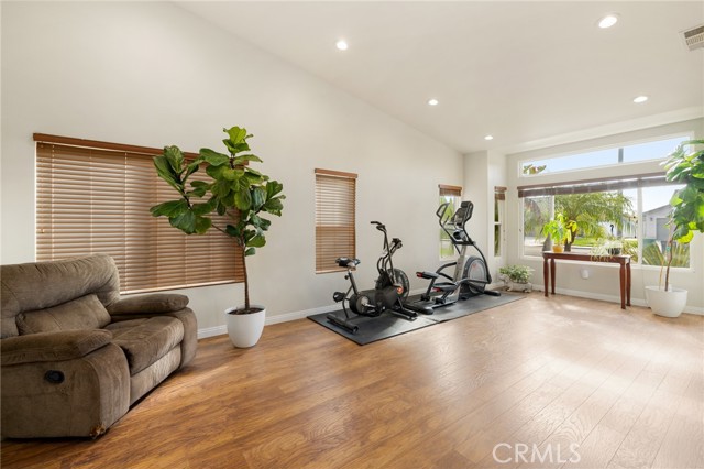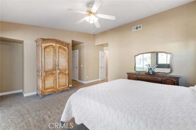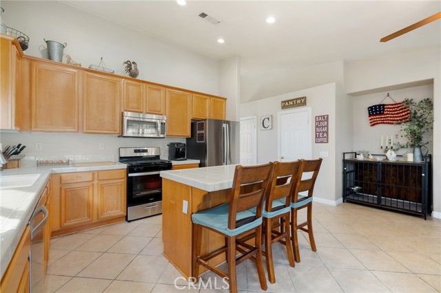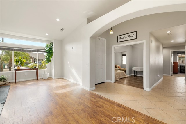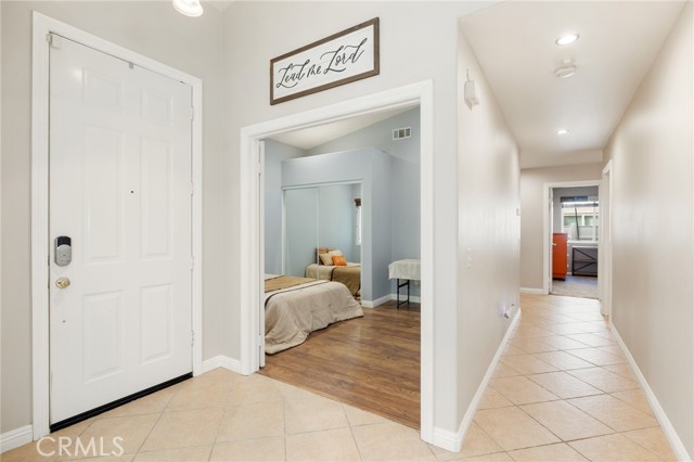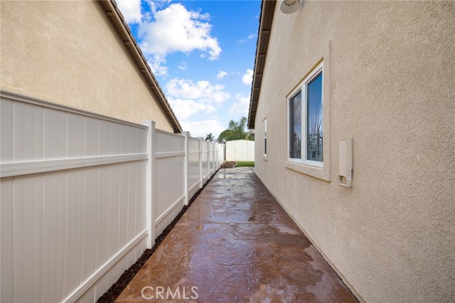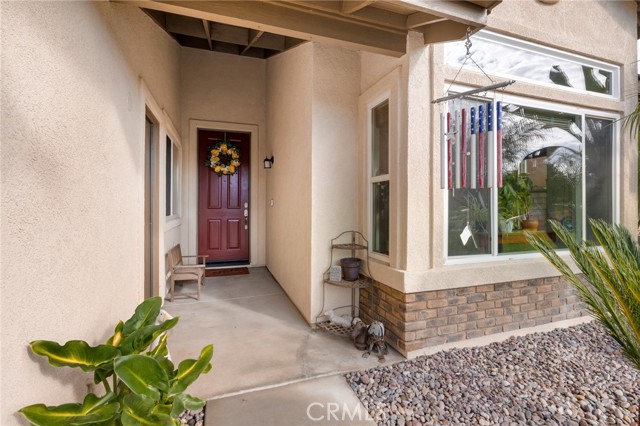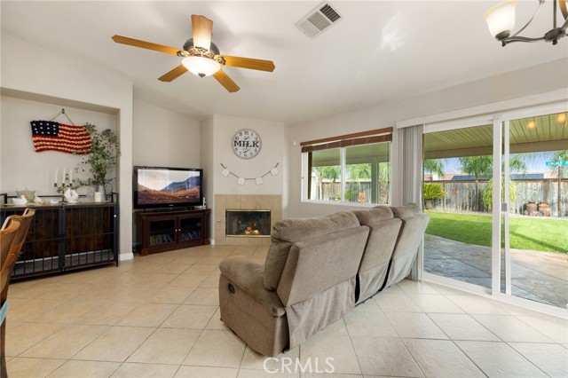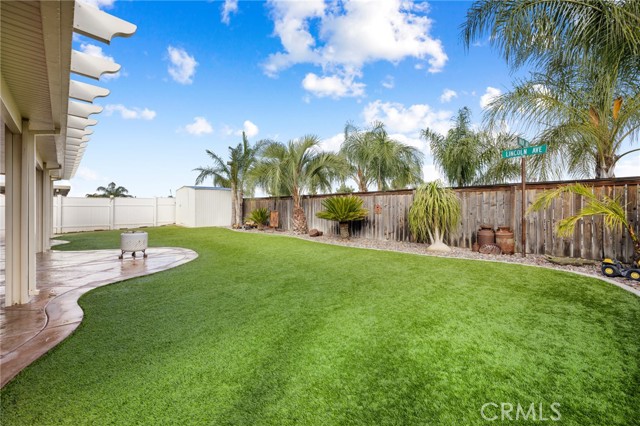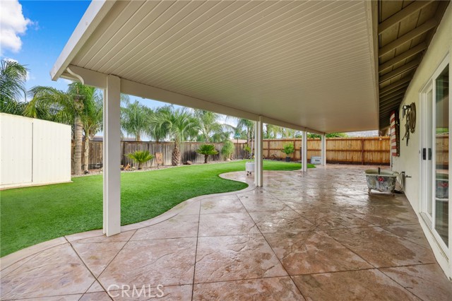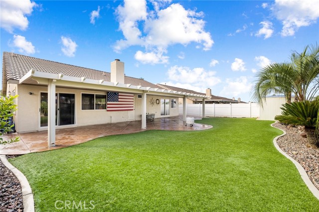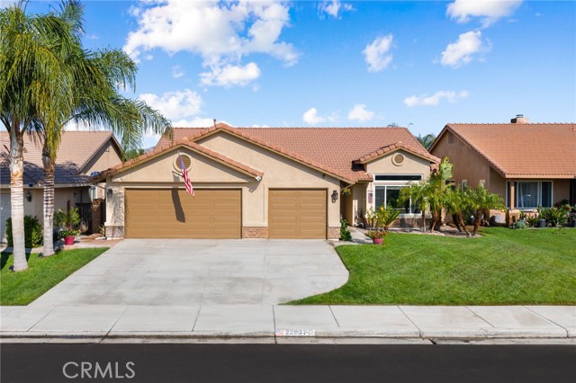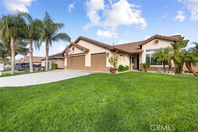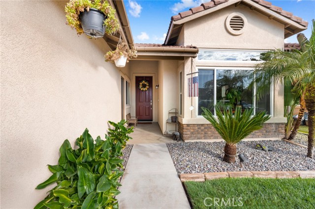 Welcome home to Via Santana where stunning curb appeal invites you into a gorgeous single story, 4 bedroom, 2 bath home in the heart of Nuevo, in the highly desirable community of Nuevo Ranch. Enjoy super low taxes, and low HOA. As you enter the property you are greeted by lush grass and an extra wide driveway! Once inside the 2000 sqft Ranch style layout you are greeted by LVP and tile floors, custom paint, and a desirable floor plan that offers a formal living and dining room with large windows allowing natural light to flood the home. The heart of the home is the kitchen boasting real tile counters with an island and eat up bar, stainless steel appliances, walk-in pantry and is open to the eating nook and family room featuring a gas fireplace. The first secondary bedroom is adjacent to the living room and features double doors, mirrored closet doors and LVP floors. Down the hall is the large laundry room with access to the 3-car garage. The other two large secondary bedrooms feature carpet, custom paint and mirrored closet doors. The rooms share the secondary bath appointed with a dual vanity, tile counters and shower/tub combo. The stunning primary boasts carpet and private access to the backyard via a glass sliding door. The attached bath is appointed with two separate white tile vanities, a shower/tub combo and walk-in closet. The pool size yard features a large alumawood patio cover spanning the entire back side of the home, artificial turf, stamped concrete for entertaining, a storage shed equipped with electrical and air lines for a compressor, along with two large side yards! The property also boasts a 4 year old AC unit, new water heater, two fence sides less than a year old, and two year old exterior paint! The home is located in the Nuview Elementary School district and part of Perris HS. The home is within one hour to Idywild, Big Bear, and the Temecula wineries. Only minutes to horse amenities and just 2 hours to beaches. This home is a must see!