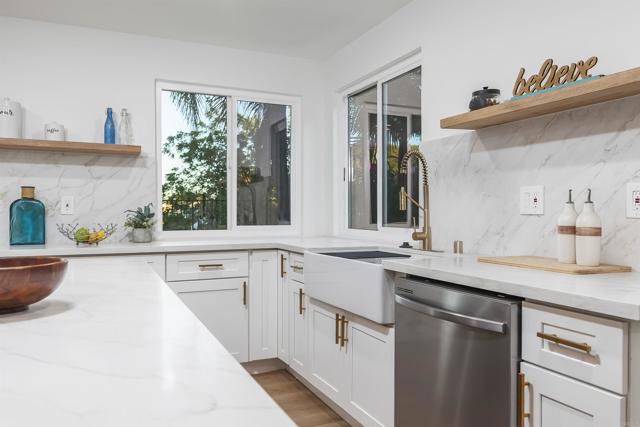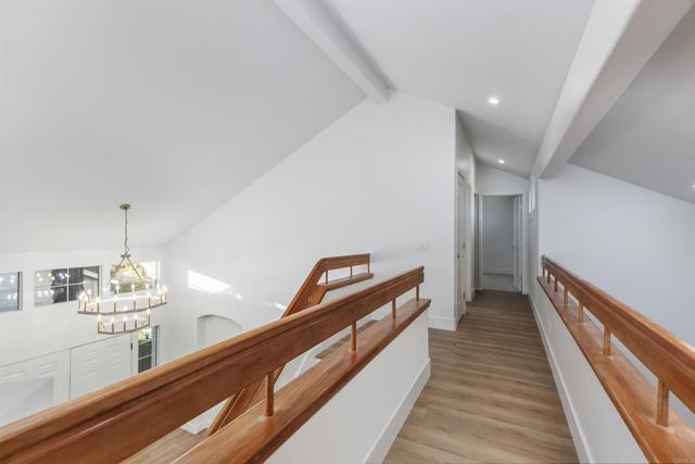 Beautifully remodeled home in a quiet and well-maintained Oceanside community, featuring modern finishes, an ideal floor plan, and impressive architectural details throughout. The home welcomes you with vaulted ceilings in both the living room and family room, creating an open and spacious feel the moment you enter. The newly redesigned kitchen offers quartz countertops, white shaker cabinetry, stainless steel appliances, and upgraded fixtures, blending style and functionality. The primary suite is located on the first floor and features vaulted ceilings, a large layout, and a resort-style bathroom with designer tile and a walk-in shower. An additional downstairs bedroom provides flexibility for guests, multi-generational living, home office, or nursery. Upstairs offers two more bedrooms and a fully upgraded bathroom, giving the home a total of four bedrooms with excellent separation of space. All three bathrooms in the home have been tastefully remodeled with modern finishes. Additional upgrades include dual-pane windows, luxury flooring, updated lighting, and a fresh interior design throughout. The community is peaceful and conveniently located near Guajome Regional Park, walking and biking trails, shopping, restaurants, schools, and just a short drive to Oceanside beaches and the harbor. This move-in ready home combines quality renovations, a highly functional layout with two bedrooms downstairs, and a desirable location close to outdoor recreation and everyday conveniences.
