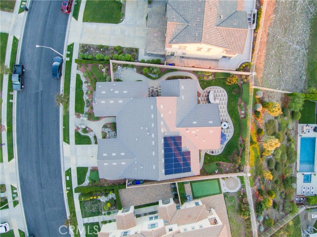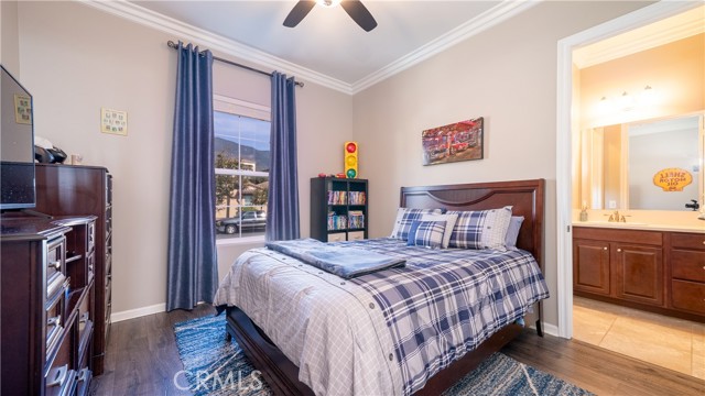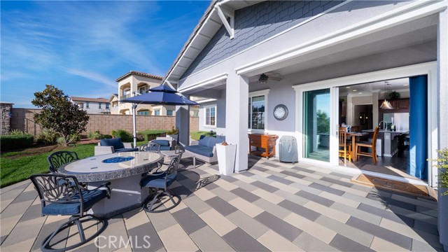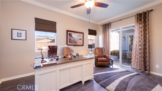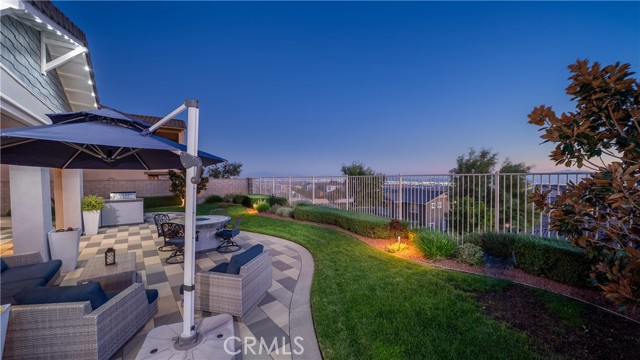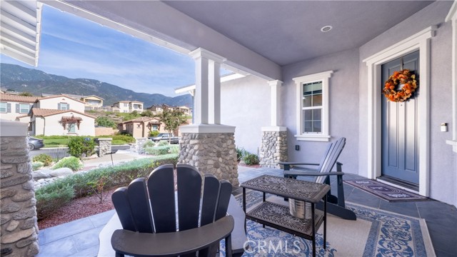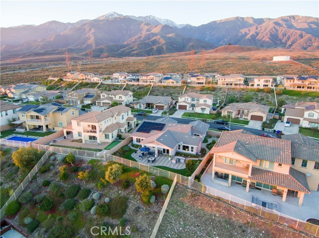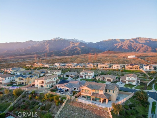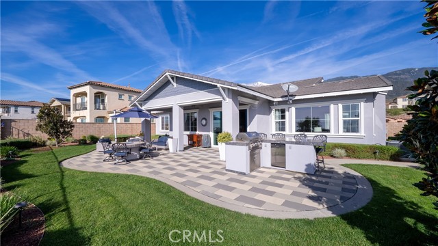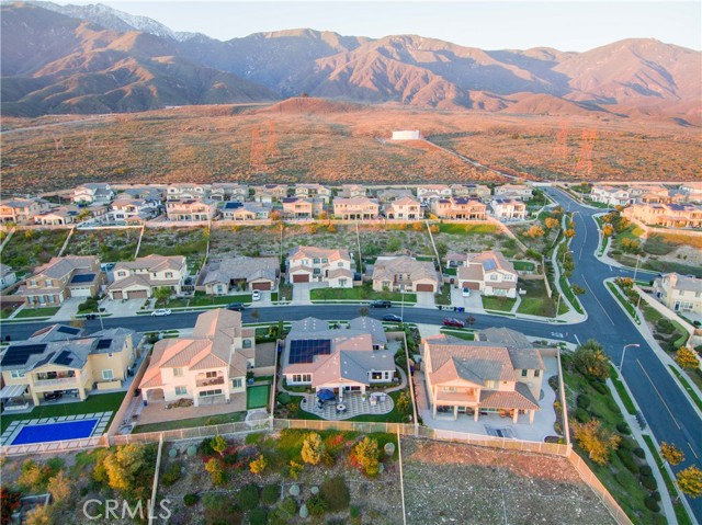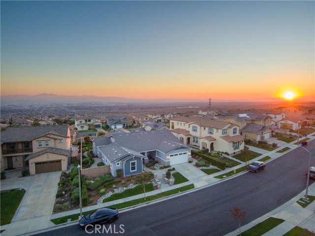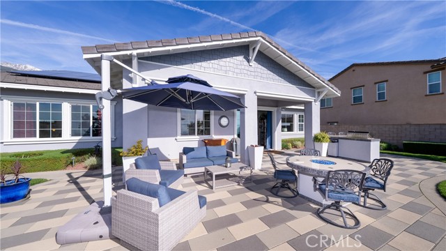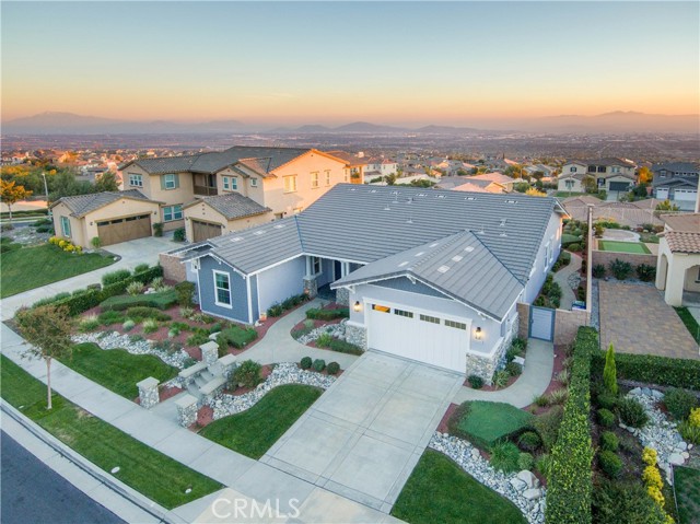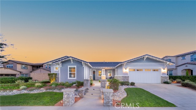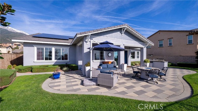 Rancho Etiwanda Estates Single Story with Unobstructed City Light & Mountain Views. This beautiful single-story home sits in Rancho Etiwanda Estates and delivers rare panoramic city light and mountain views. The curb appeal is impressive, featuring custom professional landscaping, hardscape lighting in front and back, LED lighting wrapped around the exterior, and fresh paint inside and out. A large, inviting front porch captures a perfect mountain view, & the Ring doorbell adds convenience and security. Inside, the home offers 3 bedrooms plus a dedicated office. Crown molding runs throughout. High-quality Pergo flooring adds warmth, & every bedroom features a ceiling fan with lighting. Each bedroom features an en-suite bathroom with a custom walk-in shower, detailed tile work, linear drains, & frameless glass doors. All closets feature upgraded organizers. The primary bath features a separate walk-in shower and oversized soaking tub, dual vanities, a makeup station, and a large walk-in closet with custom shelving and shoe racks. The office is a peaceful retreat with a ceiling fan and direct access to the serene center courtyard. A large formal dining room with a centerpiece chandelier sets the stage for gatherings. The family room includes a cozy fireplace with a mantle, an oversized ceiling fan, a media niche, and another access point to the courtyard. Natural light fills this home, keeping it bright and welcoming throughout the day. The kitchen opens to the family room and includes a breakfast nook with a panorama door that expands the indoor-outdoor experience. The kitchen features include a center island with a breakfast bar, granite countertops, pendant lighting, a new sink, stainless steel appliances, a cooktop with range hood, and a generous walk-in pantry. 10-foot ceilings create a sense of space and ease. The home also includes a full interior sprinkler system for added safety. The 3-car tandem garage with custom-built-in cabinetry, epoxy-coated floor, a workstation, tankless water heater, 2 sun-powered battery packs at 13 kilowatts each. 18 solar panels produce 430 watts each. The home is also wired for an alarm system. The backyard is designed for enjoyment, and the views are unforgettable. The panorama door leads out to a BBQ island, firepit, custom pavers, detailed landscaping, hardscape lighting, and a California room with fan and lighting. The mountain and city light views are unobstructed and some of the best you will find.