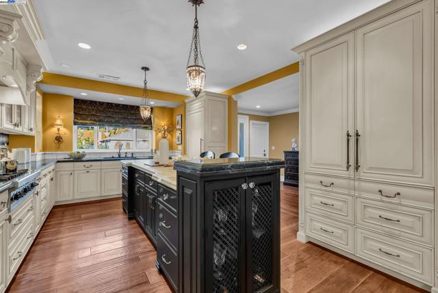 A rare and exceptional offering in Crow Canyon Country Club, this beautifully reimagined single-story home was taken to the studs, redesigned, and expanded, with quality craftsmanship and a warm, timeless aesthetic. Backing to the golf course, this home features rich hardwood flooring, custom millwork, and abundant natural light. At the heart of the home is an expansive great room where French doors frame mature trees and fairway views, creating an effortless indoor–outdoor flow ideal for everyday living and entertaining. A custom cherry-wood library with floor-to-ceiling cabinetry offers a refined space for work or quiet retreat. The gourmet kitchen includes custom cabinetry, stone counters, an oversized island, designer lighting, and high-end appliances, with a wide window showcasing colorful landscaping. The dining area blends seamlessly with the main living spaces, offering flexibility for gatherings large or small. The bedroom wing provides well-proportioned rooms with good light and privacy, while bathrooms feature quality stone, tile, and fixtures. The backyard extends the living space with an expansive patio and tranquil fairway outlook.