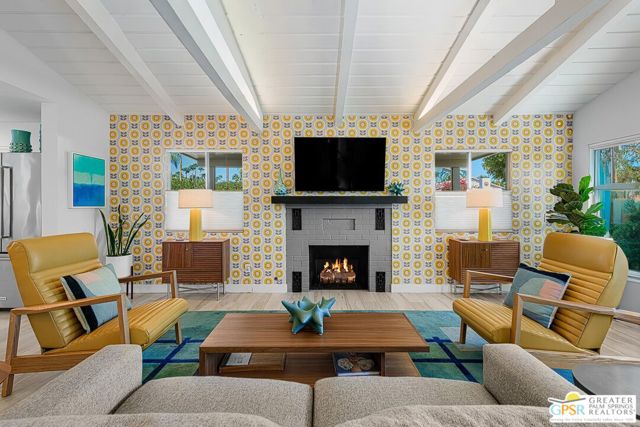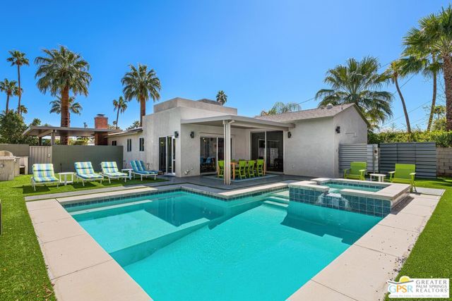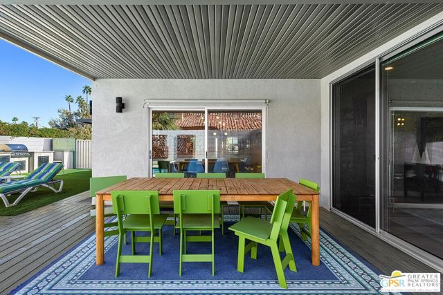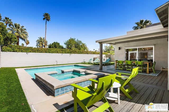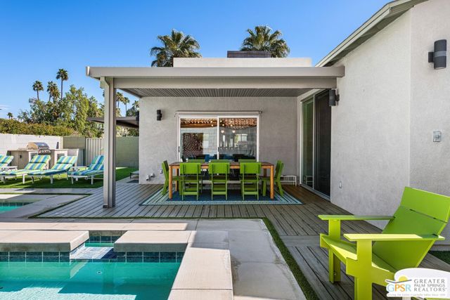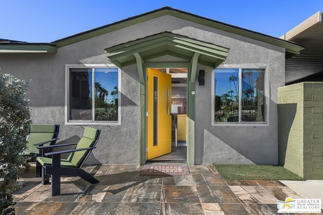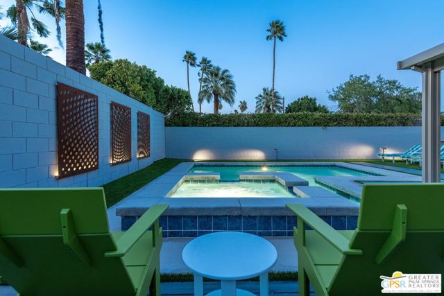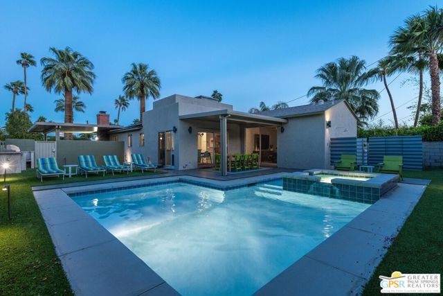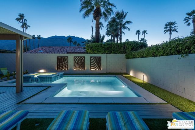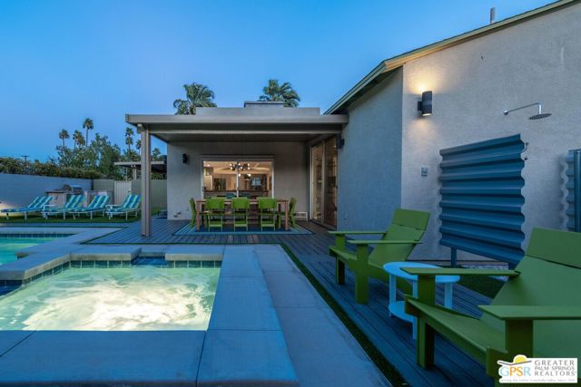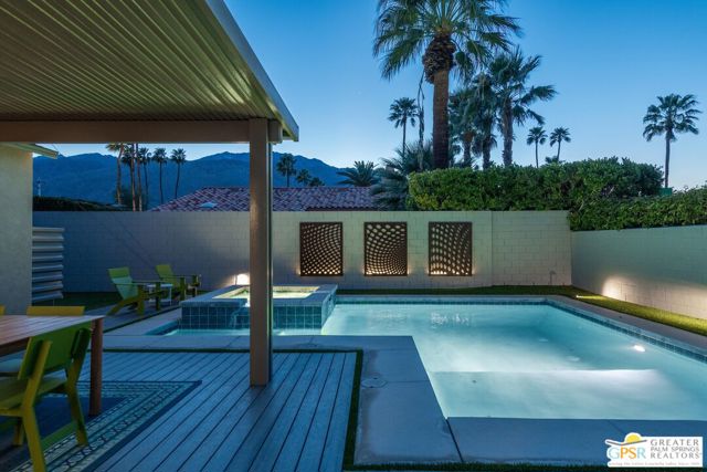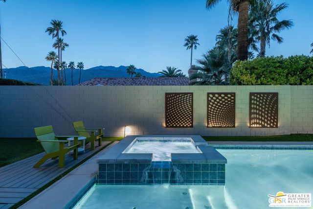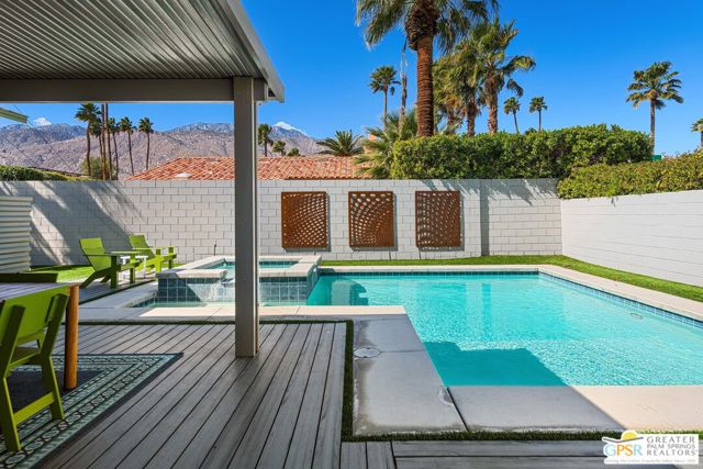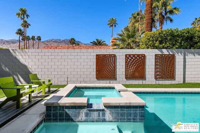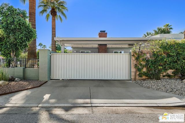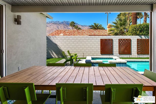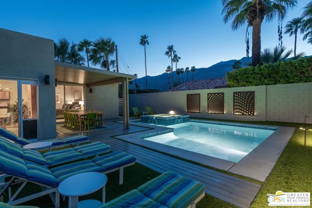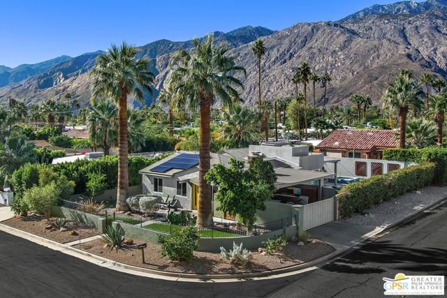 This sensational corner lot bungalow in Movie Colony East is better than ever. Sure to impress and delight at every turn, the enhanced wall-gated front yard and patio entrance leads to open concept living, dining and a gourmet kitchen at the heart of the home; complete with oversized island, 6-burner chef stove, prep sink, walk-in pantry with sleek finishes, perfect for entertaining family and friends. Walls of glass frame the dining area which opens to a beautiful and private covered back patio with bamboo decking. Take in awe-inspiring San Jacinto views out back from your pool and spa, outdoor shower, BBQ area and private sky lounge, perfect for soaking up the Palm Springs sunshine. The living room features architectural exposed beams and trusses along with its original fireplace. Beautiful Italian faux bois tile flooring throughout. Energy efficient insulation in exterior walls and ceilings, windows and doors. The primary suite provides direct patio and pool deck access, large walk-in closet, floor-to-ceiling built-ins, Solatube skylights, and bespoke finishes. Guest bedrooms feature a refreshing shared bath with state of the art commode and frameless glass shower. The laundry room is perfectly appointed, complete with utility sink and separate beverage fridge and plenty of storage. Gated and motorized carport and block walls with side gate provide for privacy and security. The 24 solar panel system is owned, adding energy efficiency. Whole house water filtration system (LifeSource). Low irrigation maintenance enhanced landscaping with multi-zone system. Prime location; enjoy the best of nearby Downtown and Uptown Palm Springs with Ruth Hardy Park virtually at your doorstep.